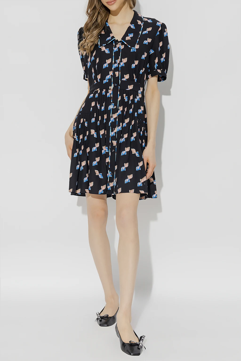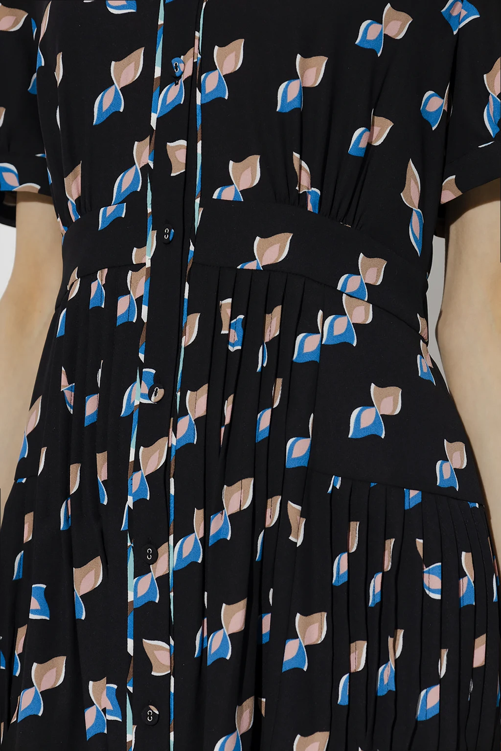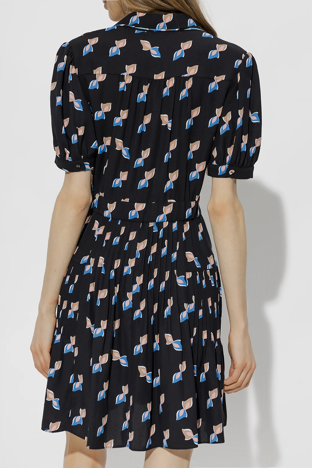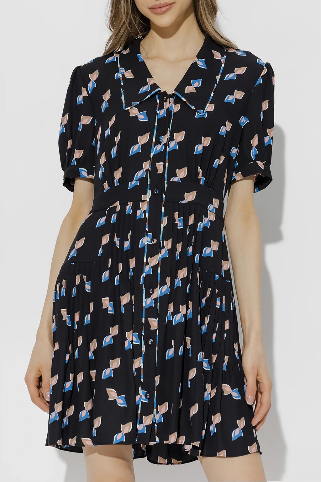 Black ‘Darius’ mini dress from Diane Von Furstenberg. Fastened with buttons, this design features a multicolored geometric pattern, collar, short puff sleeves with buttons and pleated skirt with two slip pockets.