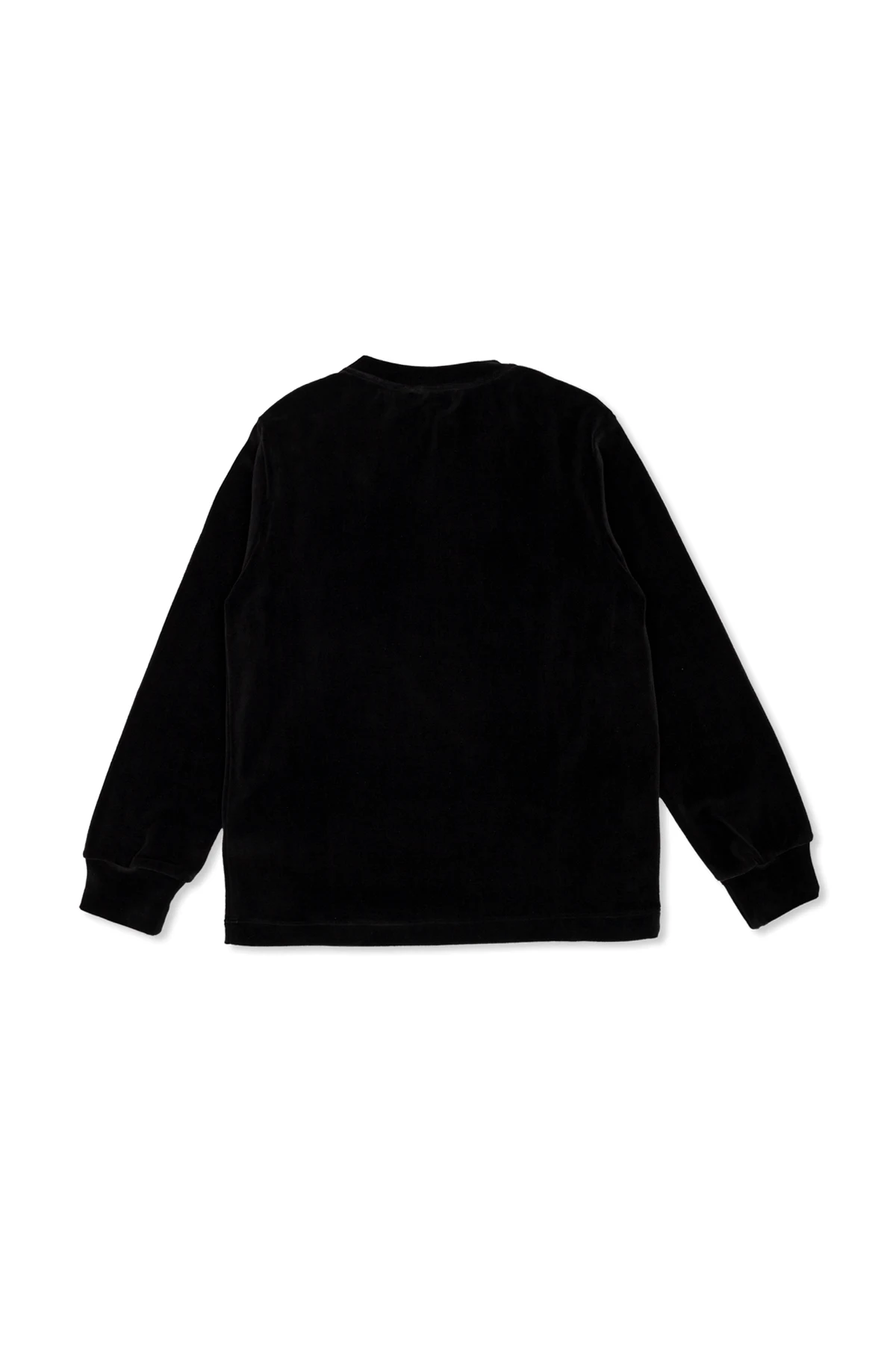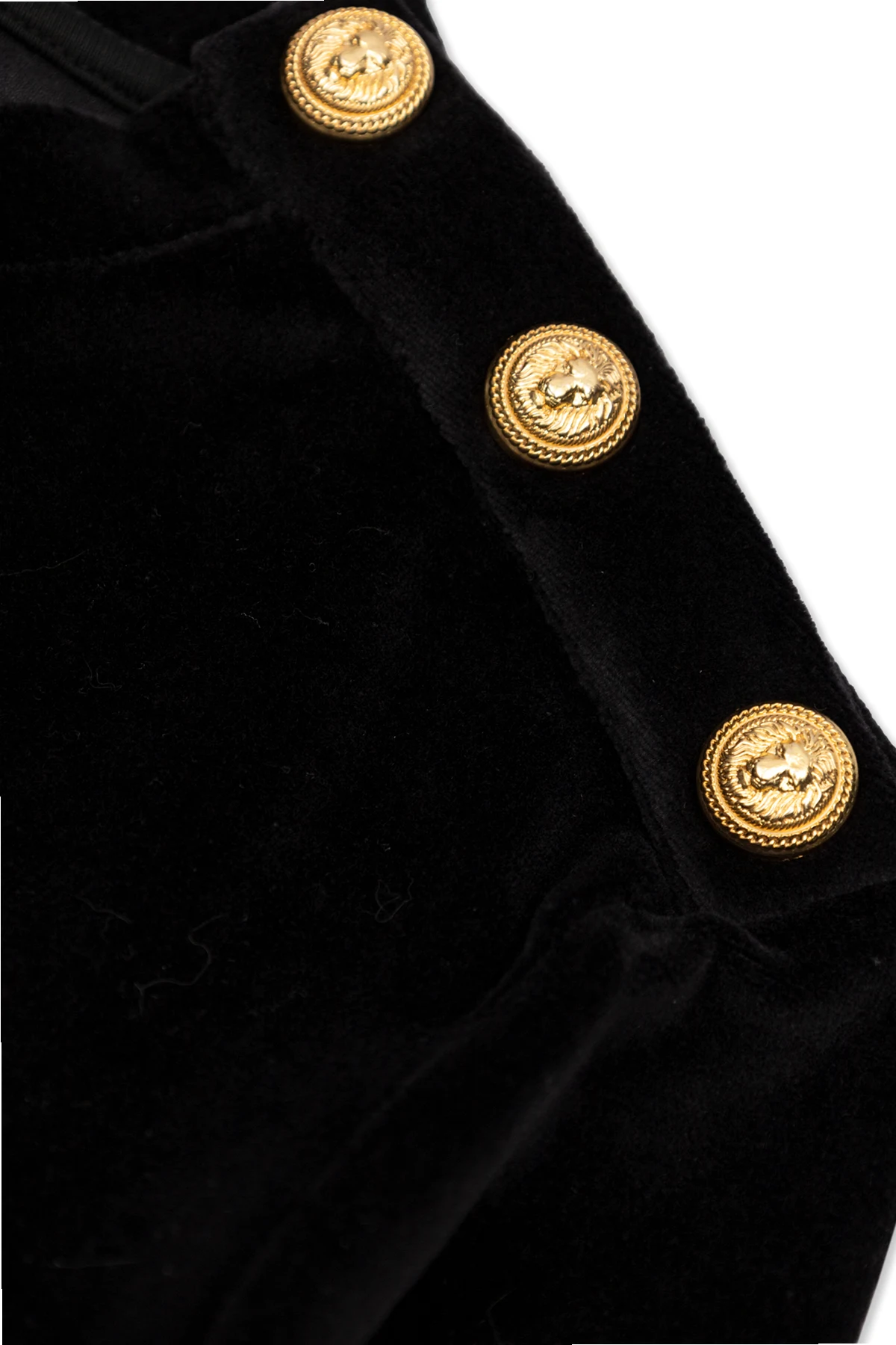 Introducing the epitome of luxury in children\'s fashion: the Velvet Sweater with Logo from the distinguished Balmain Kids collection. Crafted from a sumptuous blend of cotton and polyamide, this exclusive garment embodies the essence of sophistication and timeless elegance. Its deep black hue serves as a canvas for the opulent gold inscription of the designer\'s name, meticulously rendered in an exquisite font that exudes luxury. The sweater\'s classic, straight silhouette is complemented by long sleeves, ensuring both comfort and style. The front features a large, golden designer inscription that captures the eye, while the back remains smooth and unadorned, showcasing the sleekness of the design. An exceptional detail is found on one of the shoulders, where three snap buttons, embellished with the logo and adorned with a sophisticated pattern, add a unique touch to the piece. These golden buttons, together with the precision of the golden thread against the black velvet background, highlight the garment\'s unparalleled craftsmanship. Made from materials that feel luxurious to the touch, the Velvet Sweater with Logo is a testament to the high-quality standards of Balmain Kids. Its universal black color and velvet composition signify a blend of comfort and opulence, making it a must-have item in the wardrobe of discerning young fashion enthusiasts. Why Purchase This Product? Elegant design with a luxurious gold inscription from the renowned Balmain Kids collection. Exceptional craftsmanship showcased through detailed golden buttons with logo embellishments. High-quality fabric blend offering both comfort and a sumptuous feel. Classic color and cut, ensuring versatility and timeless appeal. Exclusive details such as snap button shoulder closure, enhancing both the garment\'s uniqueness and functionality.