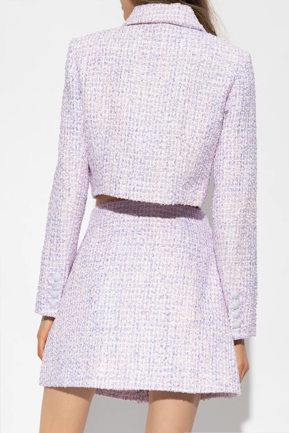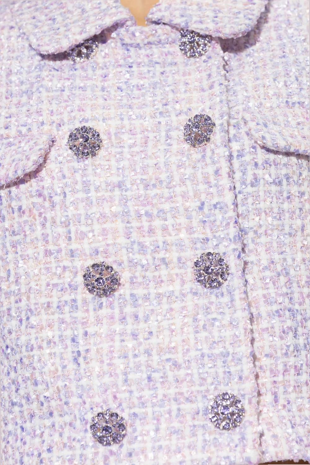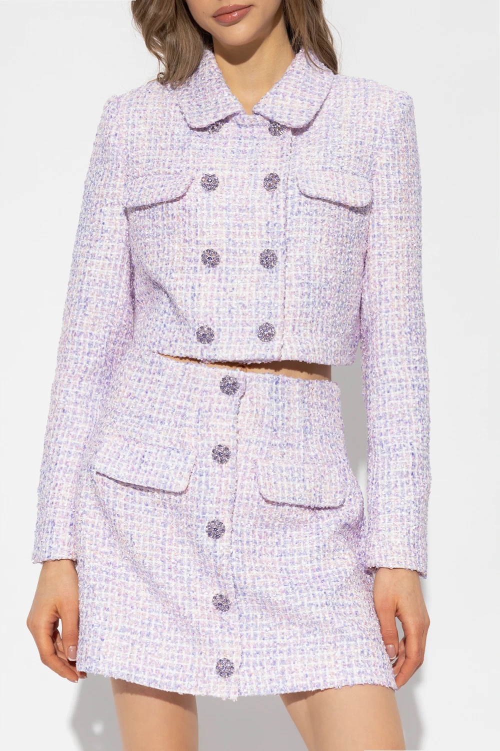 Purple and white cropped jacket from Self Portrait. Cut from tweed, this design features decorative buttons embellished with crystals, two flap pockets, lurex thread finish, collar and long sleeves with buttoned cuffs.