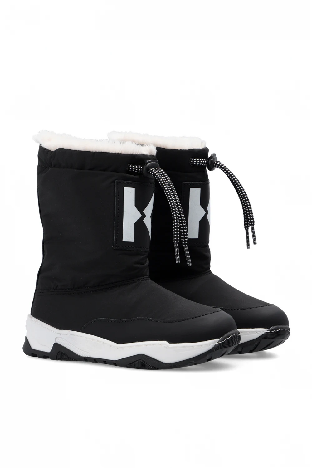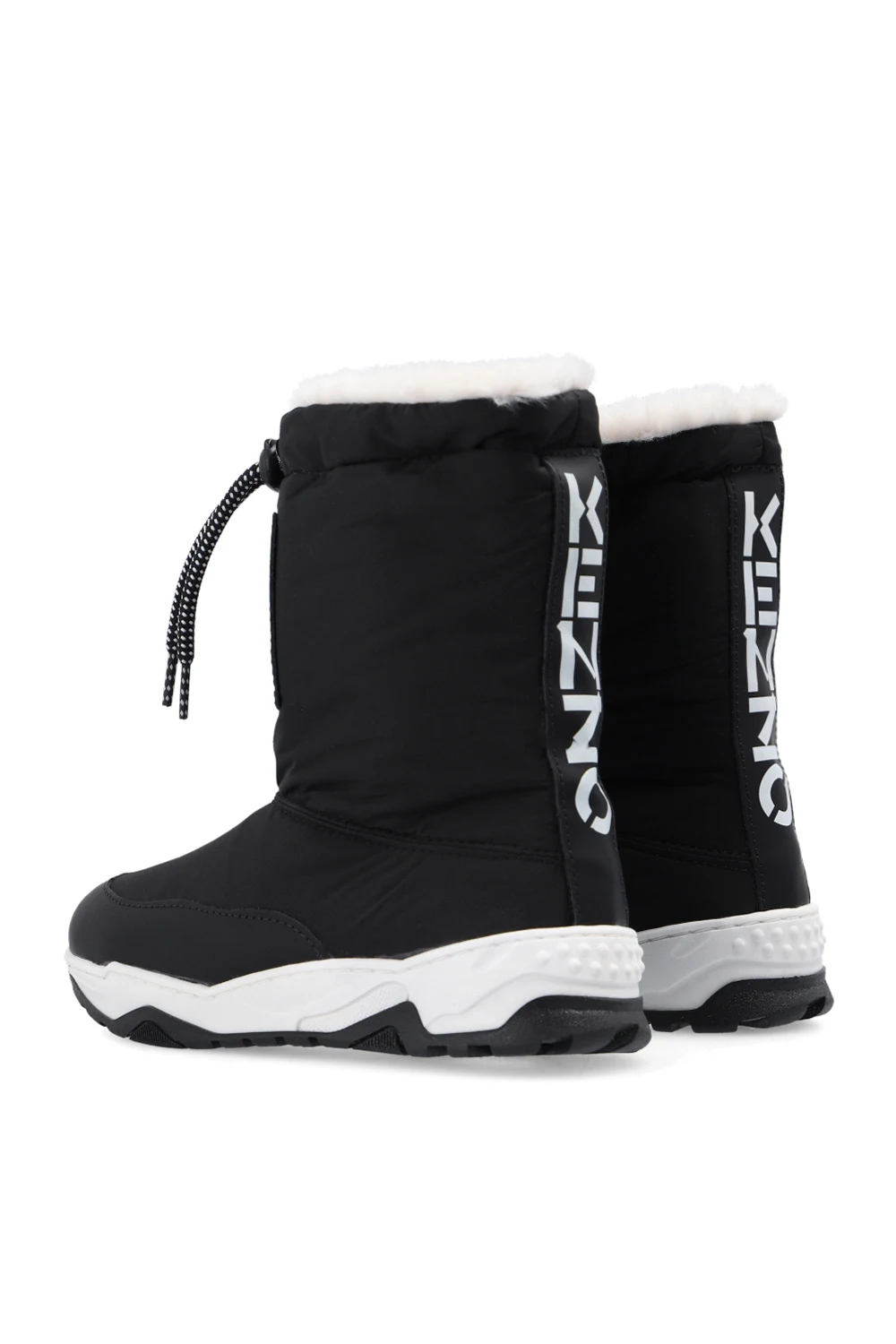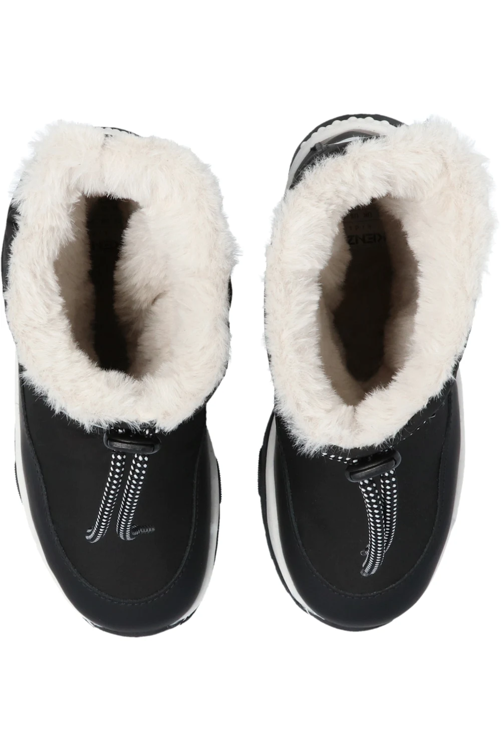 Black snow boots from Kenzo Kids. Fastened with drawstrings, this pair features a white logo print, faux fur lining and rubber sole in black and white.