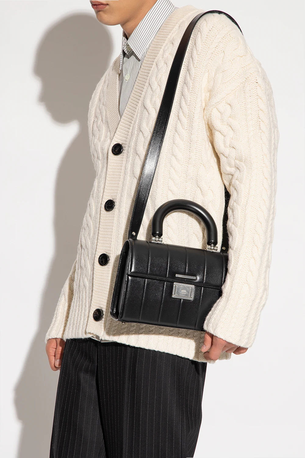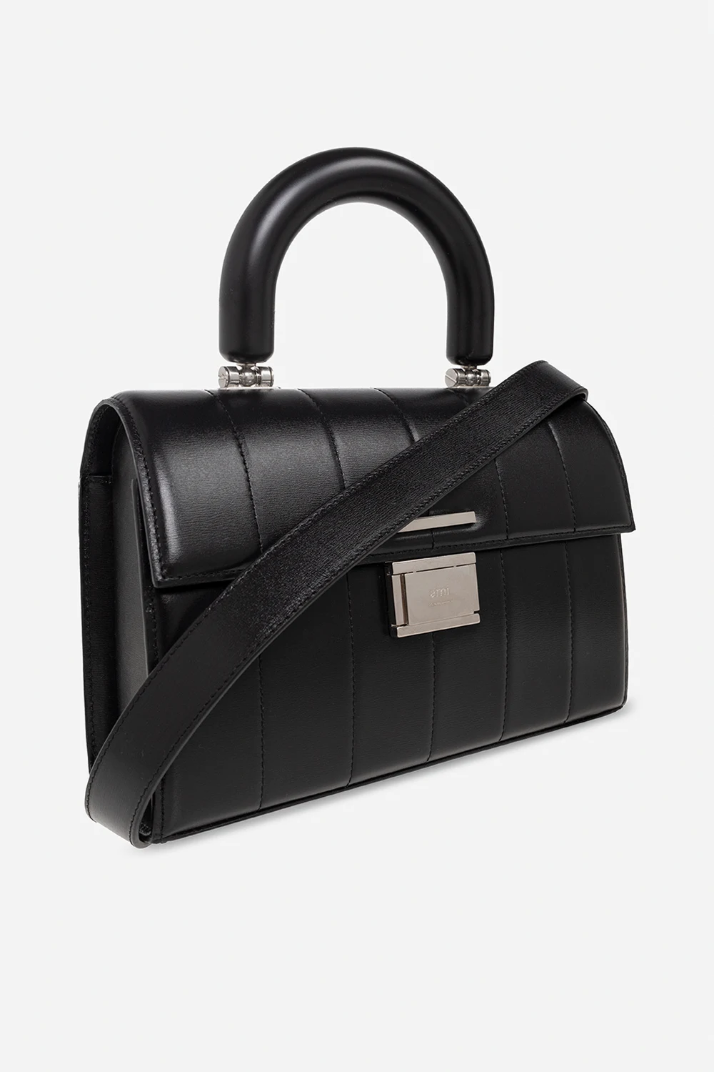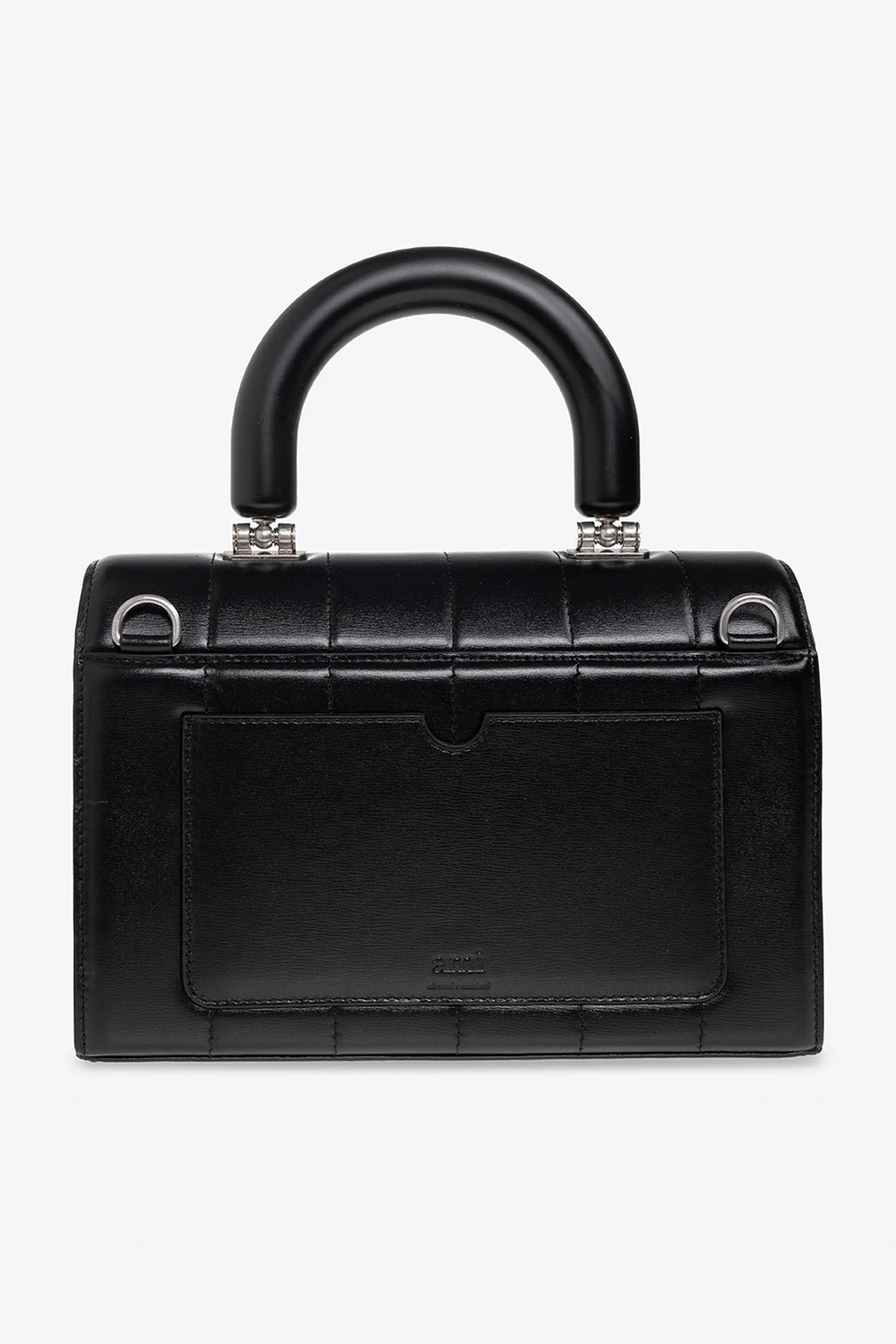 Black ‘Deja Vu Small’ quilted shoulder bag from Ami Alexandre Mattiussi. Made of leather, this model features a logo-engraved metal snap, back pocket, half-round handle, detachable and adjustable shoulder strap, silver-tone metal hardware and one internal compartment with two slip pockets.