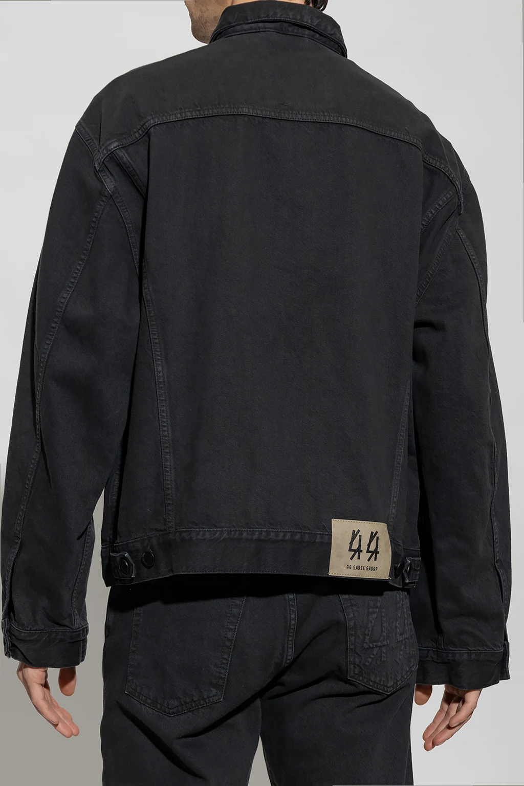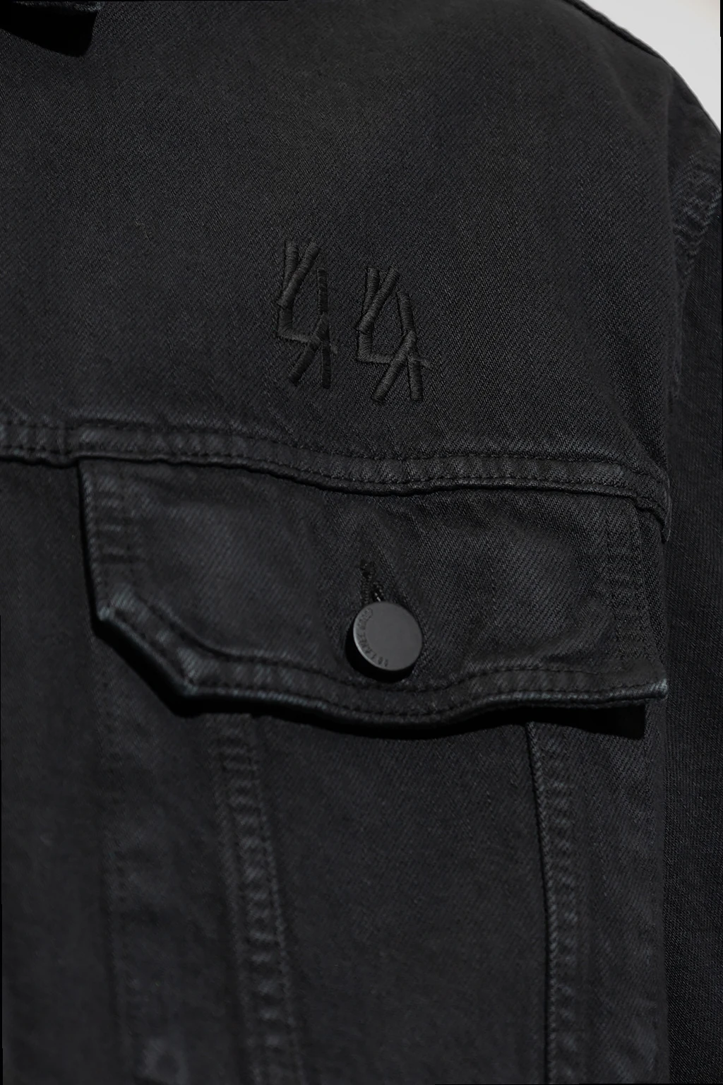 Black denim jacket from 44 Label Group. Embroidered with the brand\'s logo, this style features button closures, two welt pockets, two flapped pockets with buttons and long sleeves with button cuffs.