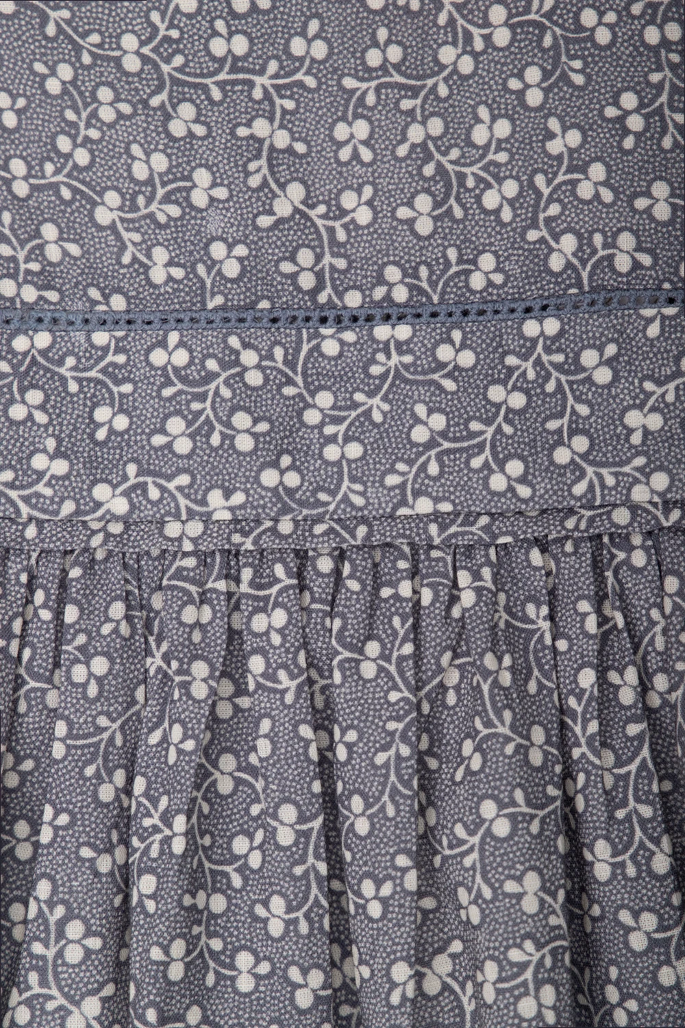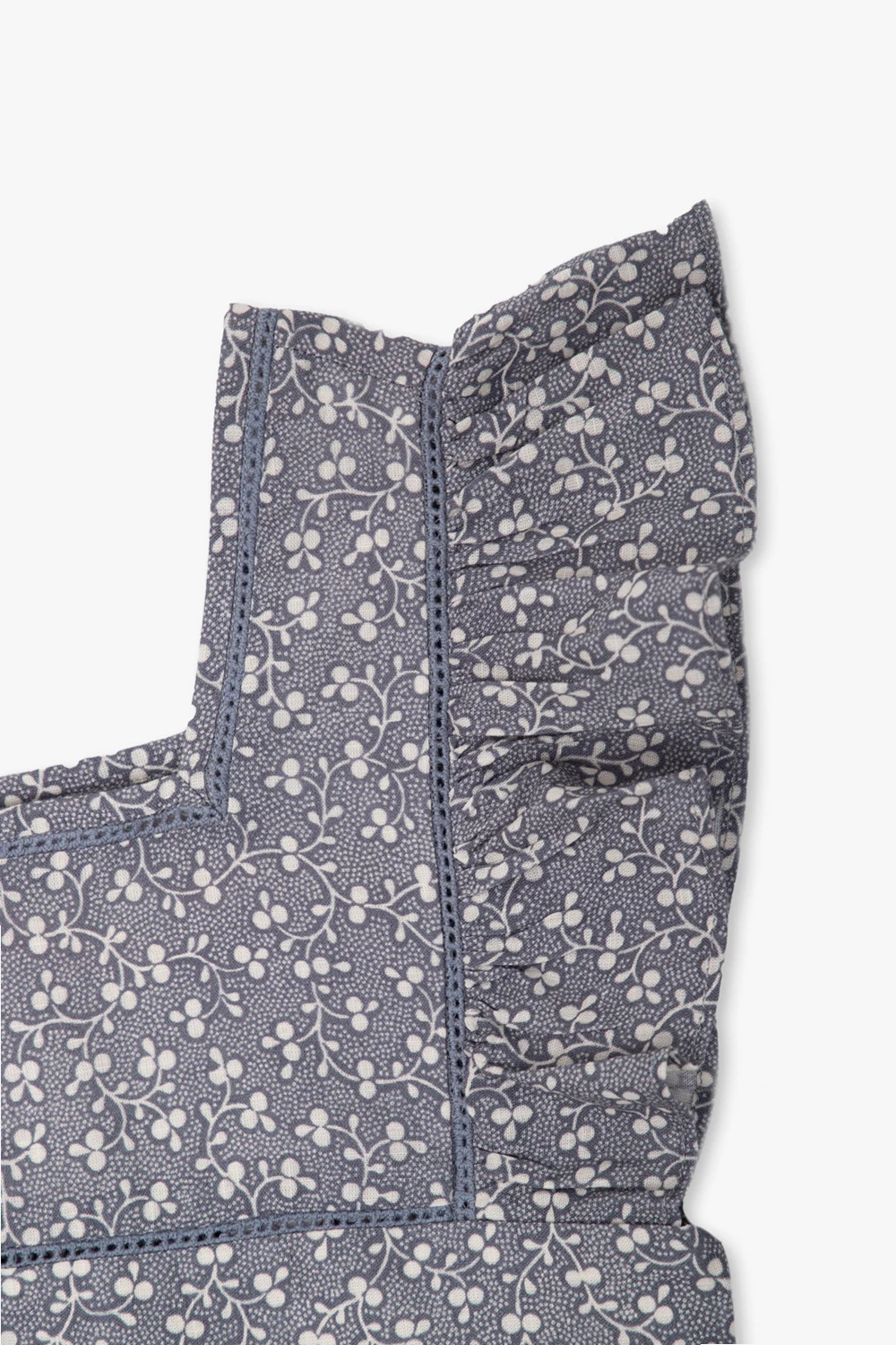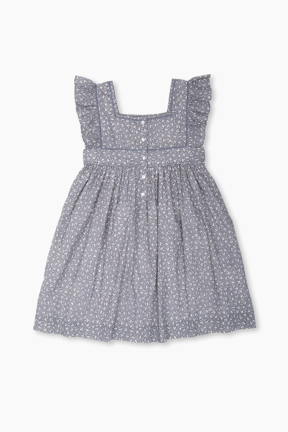 Greyish blue and white ‘Cassiopee’ dress from Bonpoint. Made of cotton, this style fastens with back buttons and showcases a floral pattern. It is complete with a square neckline with openwork details, ruffled short sleeves and a flared hem.