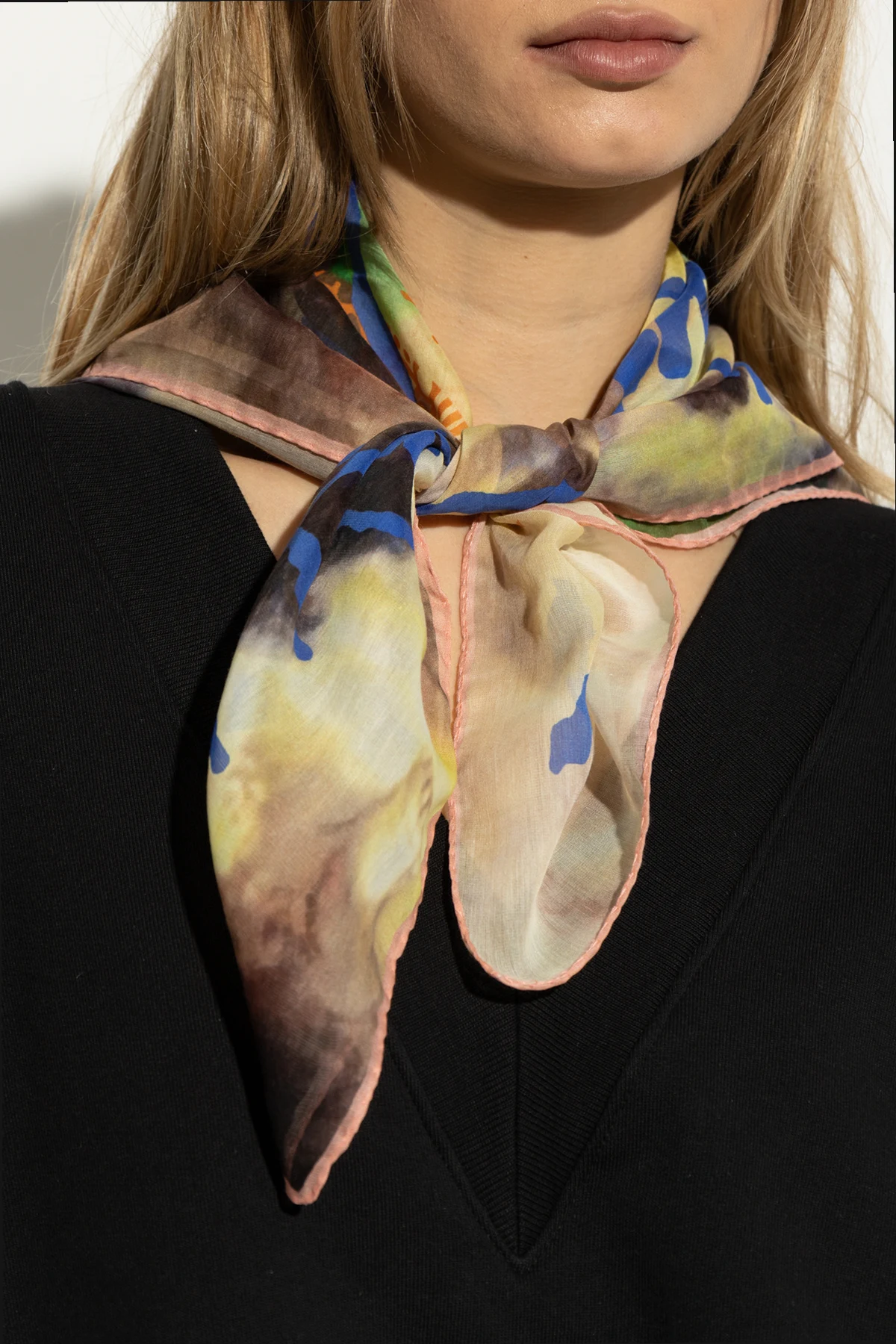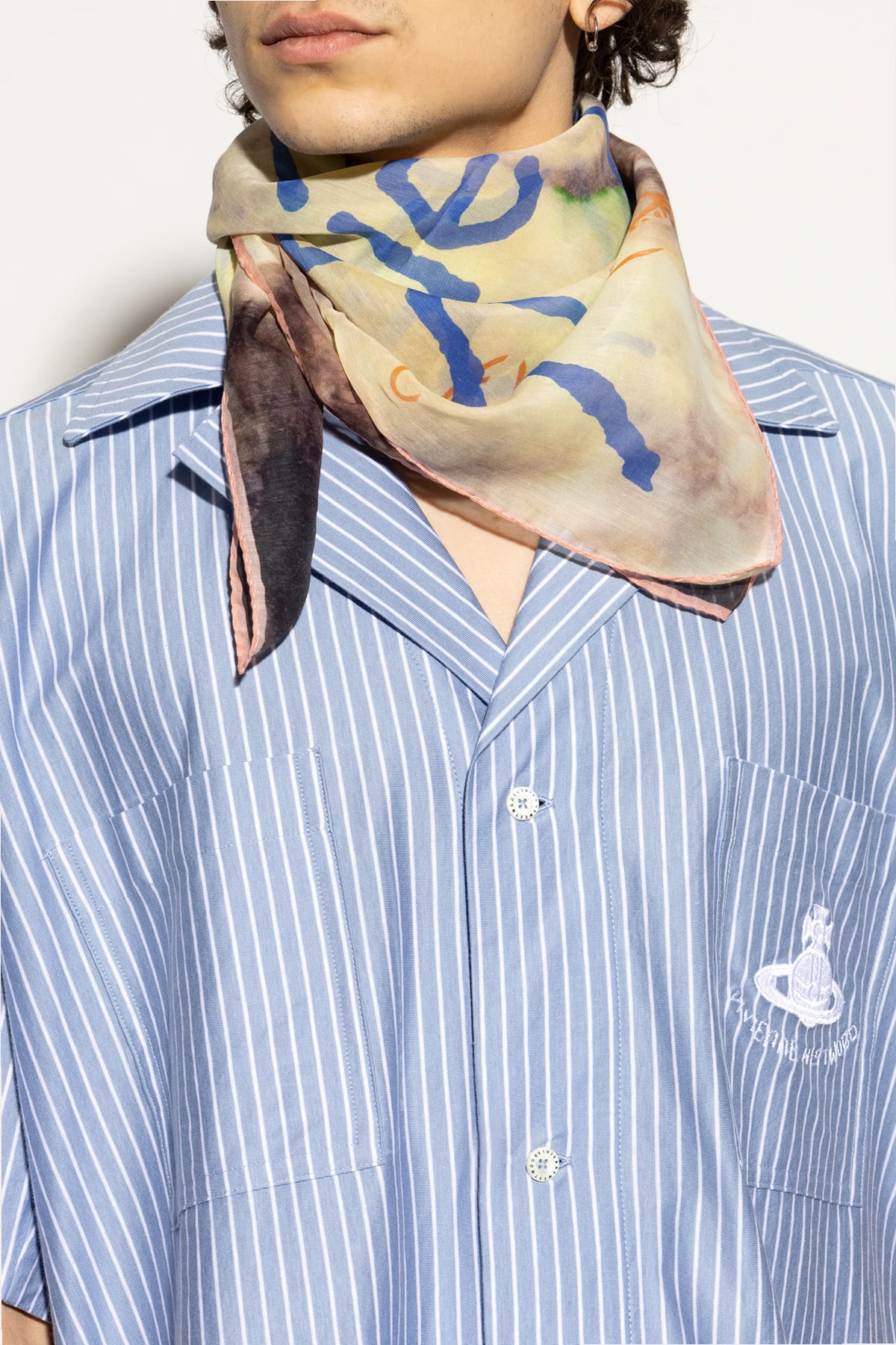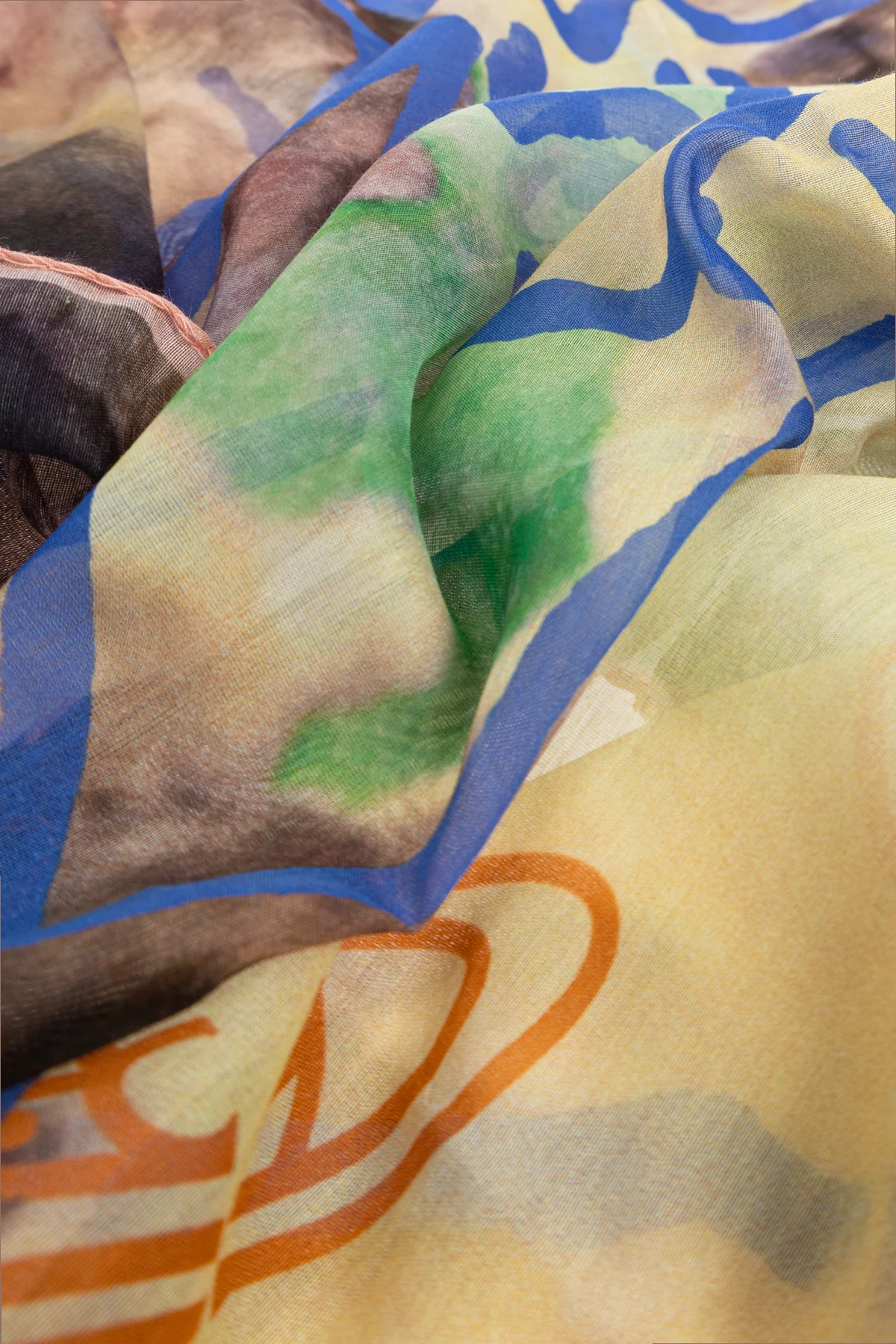 Introducing the Chusta z nadrukiem from the exclusive collection by renowned designer Vivienne Westwood. This exquisite scarf epitomizes elegance with its multicolored pattern, where shades of brown, green, yellow, and blue intertwine in an abstract, artistic print, highlighted by distinctive blue lines and inscriptions. Crafted from a delicate blend of cotton and silk, the fabric exudes a lightweight and airy allure, making it a sophisticated addition to any wardrobe. The meticulous edge finishing enhances its refined appearance, rendering it a versatile accessory for both male and female ensembles. As an ode to Vivienne Westwood\'s rebellious spirit, this scarf captures the essence of her legacy, fusing the iconoclastic with the elegant. Why choose this product? Designed by the legendary Vivienne Westwood Unique multicolored abstract print Luxurious blend of cotton and silk Versatile and unisex style Perfect balance of elegance and artistic flair