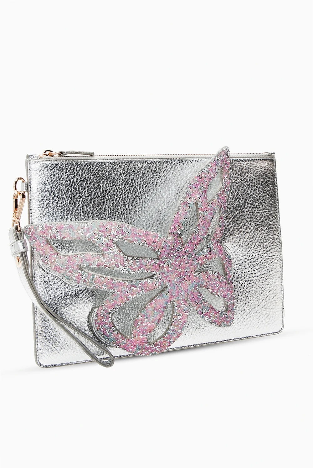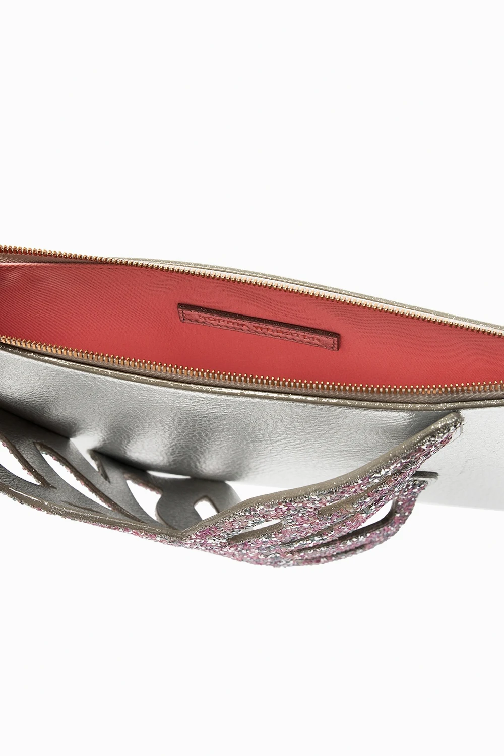 Silver-tone ‘Flossy’ clutch from Sophia Webster. Crafted from grained leather, this model fastens with a zip and comes decorated with an embossed logo and the brand’s signature butterfly wing motif embellished with decorative elements in pink, blue and silver-tone. It is complete with a wrist strap with a snap hook, pink lining and one internal compartment.