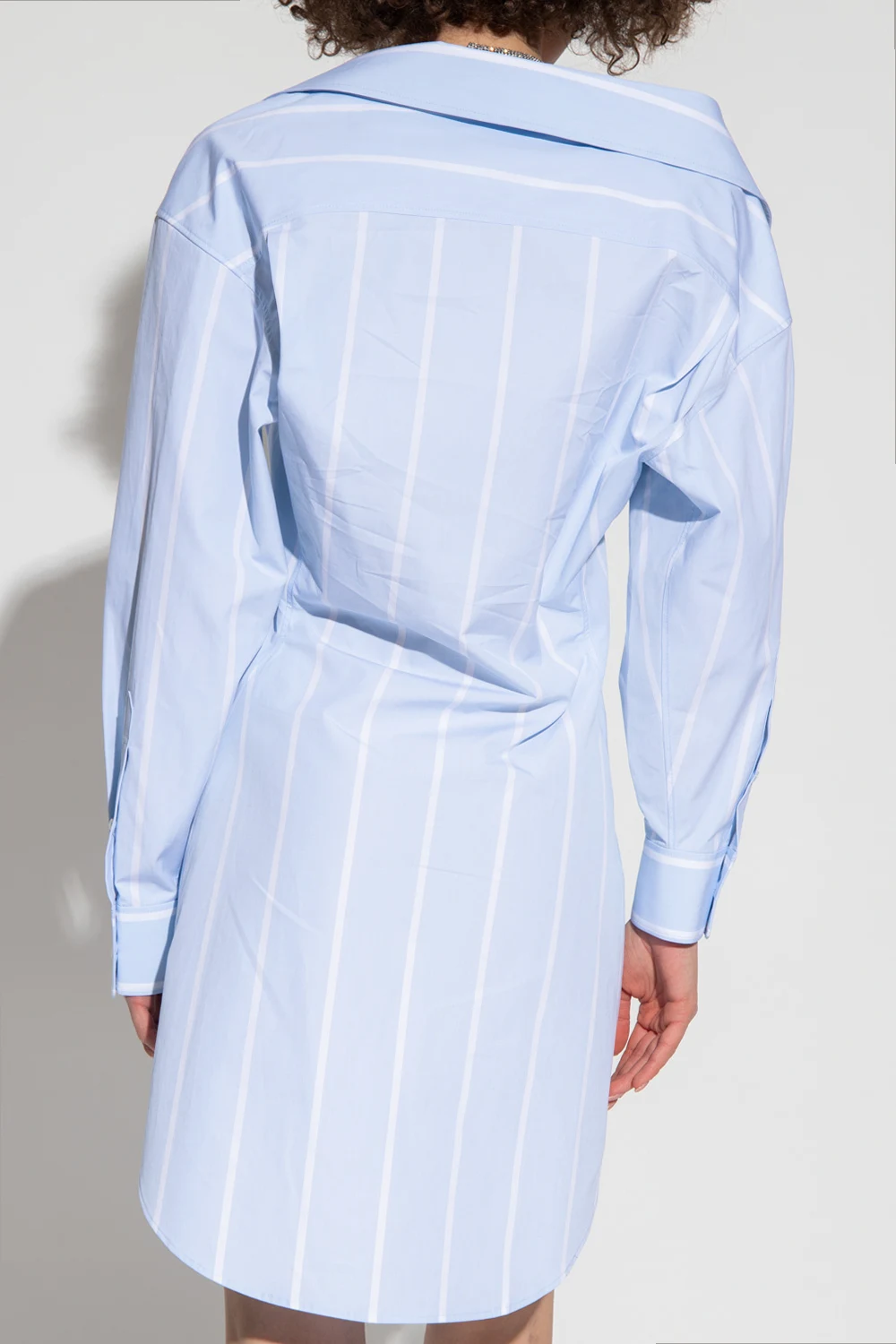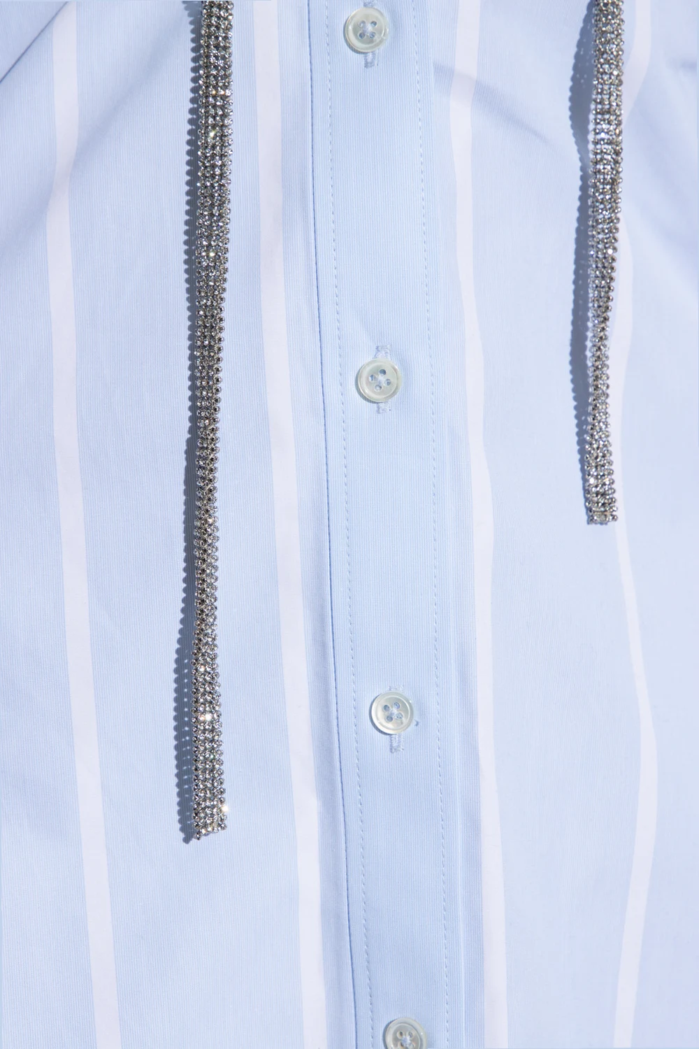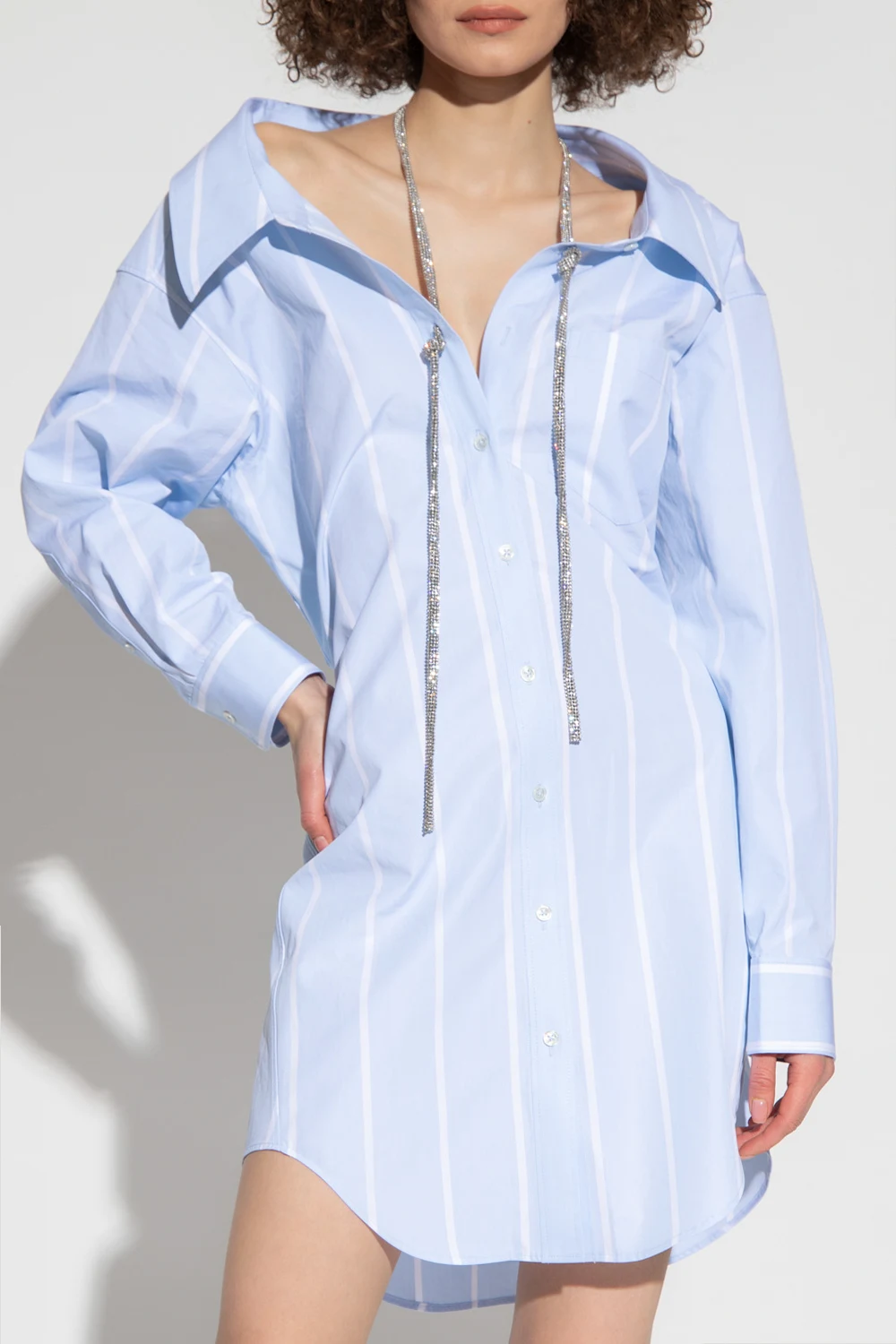 Blue shirt dress from Alexander Wang. Crafted from cotton, this style fastens with buttons and showcases a white stripe pattern. It is complete with a slip chest pocket, a detachable collar strap bejewelled with glossy crystals and long sleeves with button cuffs.