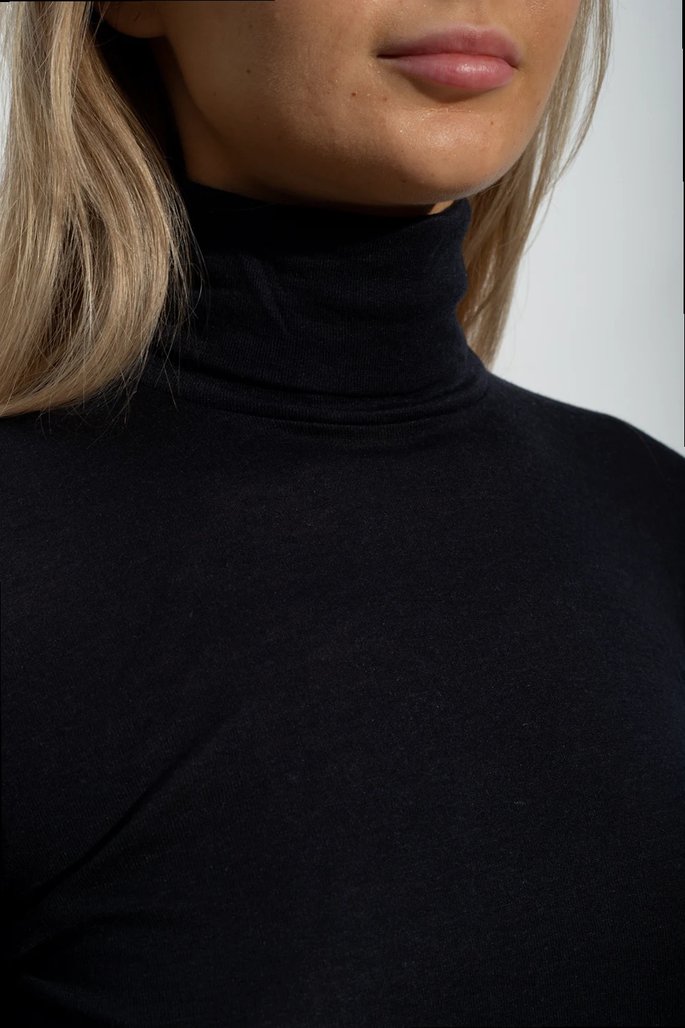 Black turtleneck sweater from Hanro. Crafted from a silk and wool blend, this style features a form-fitting silhouette, a snug collar and long sleeves.