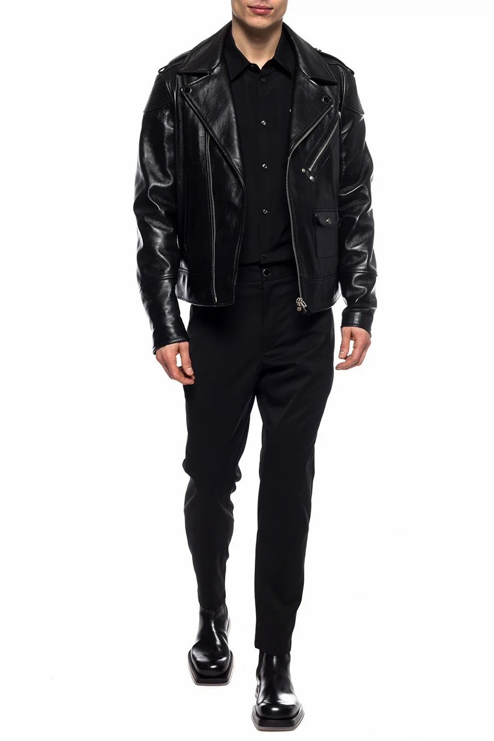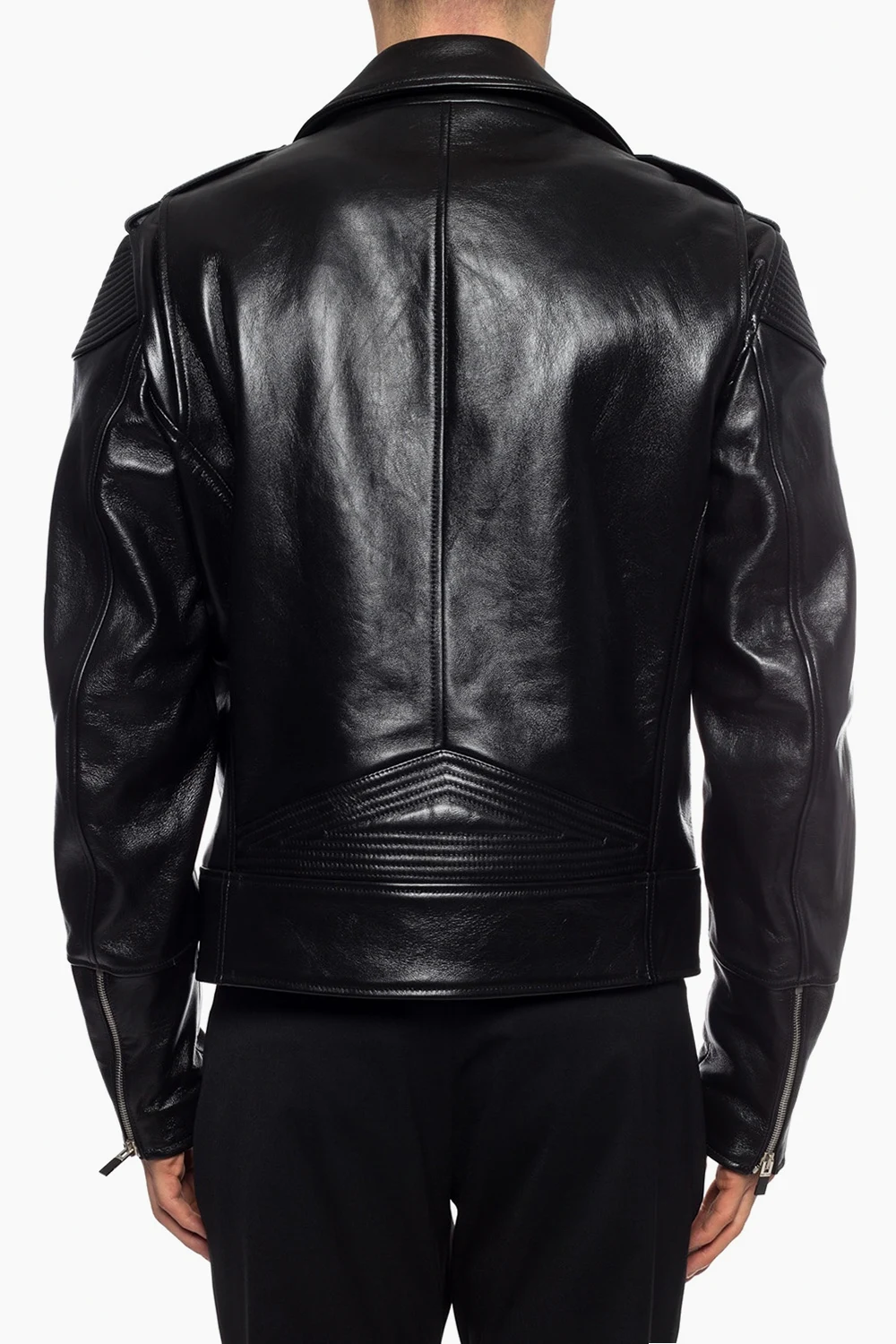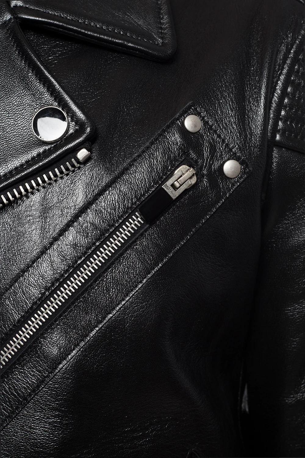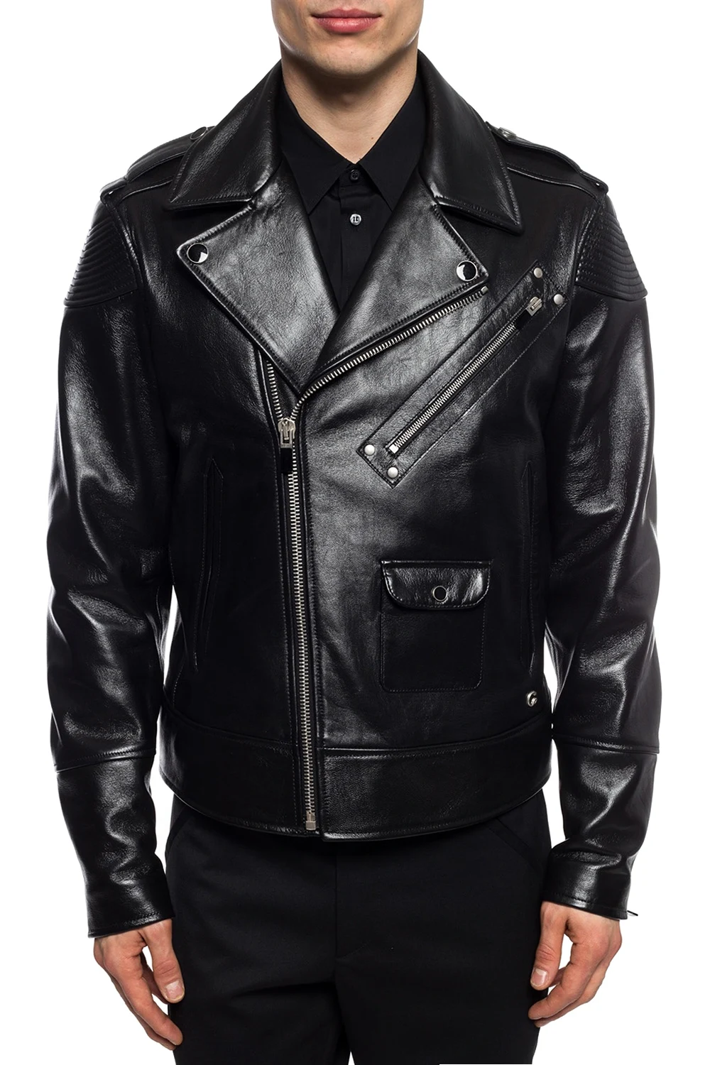 Black biker jacket from Just Cavalli. Made of leather. Zip and snap fastening. Decorated with ribbed inserts. Two slip pockets, a zip pocket and a flap pocket fastened with a snap on the front. Epaulettes on the shoulders. Long sleeves. Silver-tone metal hardware.