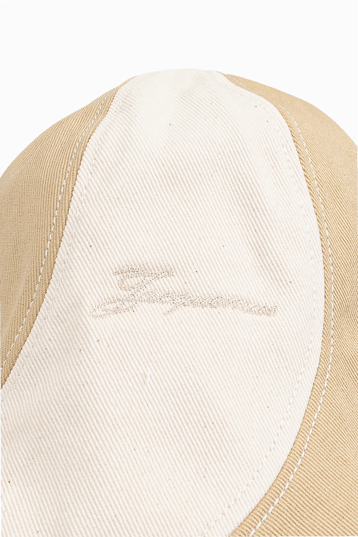 Introducing the Hat with Logo from the exclusive fashion house of Jacquemus. This masterpiece exudes an air of timeless elegance with its classic, wide-brimmed silhouette. The alternating panels of beige and white create an intriguing pattern, expertly crafted from a blend of polyester and cotton that mimics the texture of canvas, ensuring durability and perfect form. The subtle, embroidered designer logo graces one of the panels, harmonizing beautifully with the background for an understated yet sophisticated touch. This unisex hat, with its dominant beige complemented by white, offers a neutral and versatile aesthetic, ideal for a myriad of sartorial expressions. Why Choose This Product? Exquisite craftsmanship in a classic wide-brimmed design. Durable material blend of polyester and cotton for longevity. Elegant, embroidered logo for a touch of subtle sophistication. Unisex design suitable for diverse fashion styles.