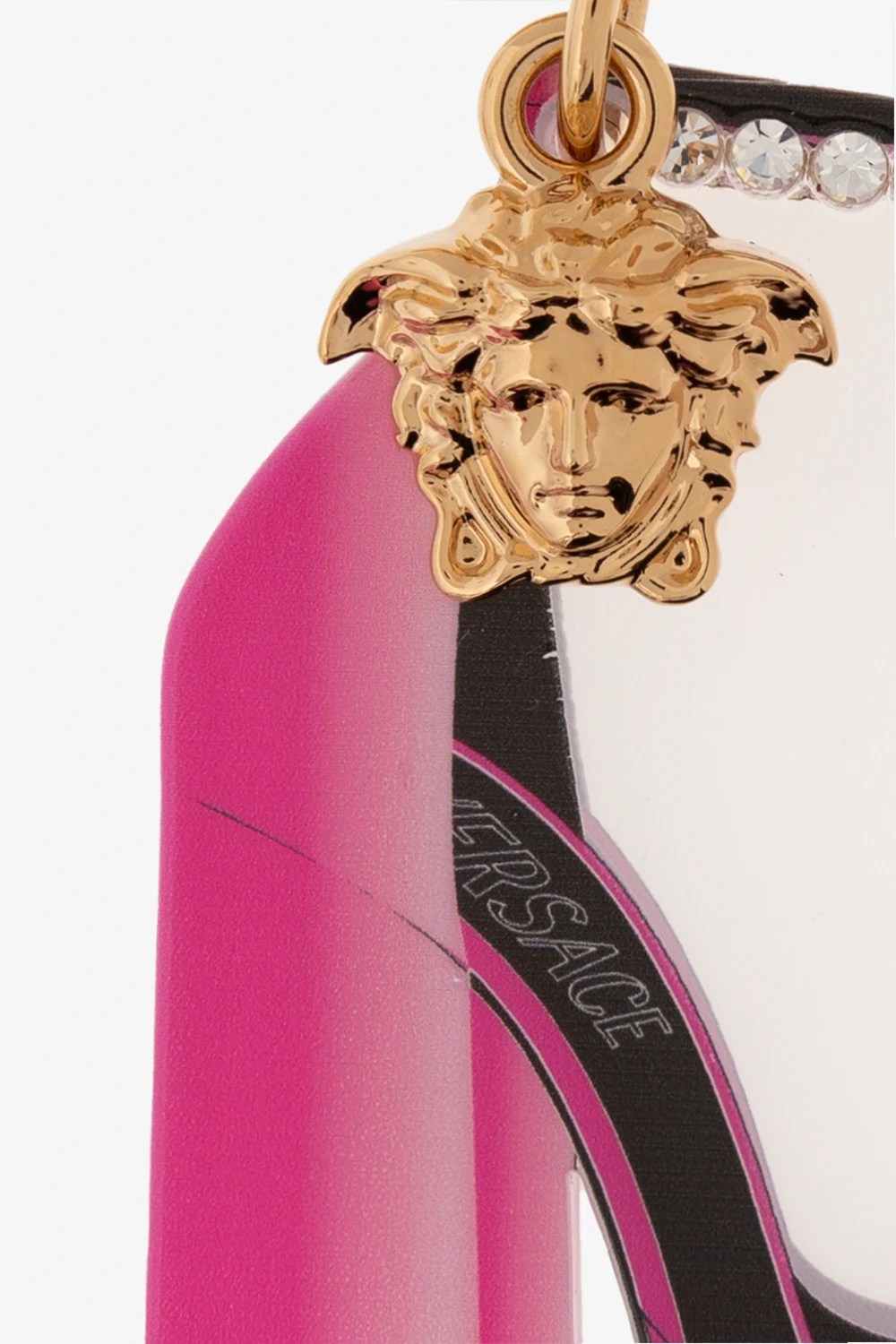 Pink, black and translucent keyring from Versace. Designed with a shoe silhouette, this item showcases glossy crystals, logo detailing, gold-tone metal hardware and a signature Medusa pendant.