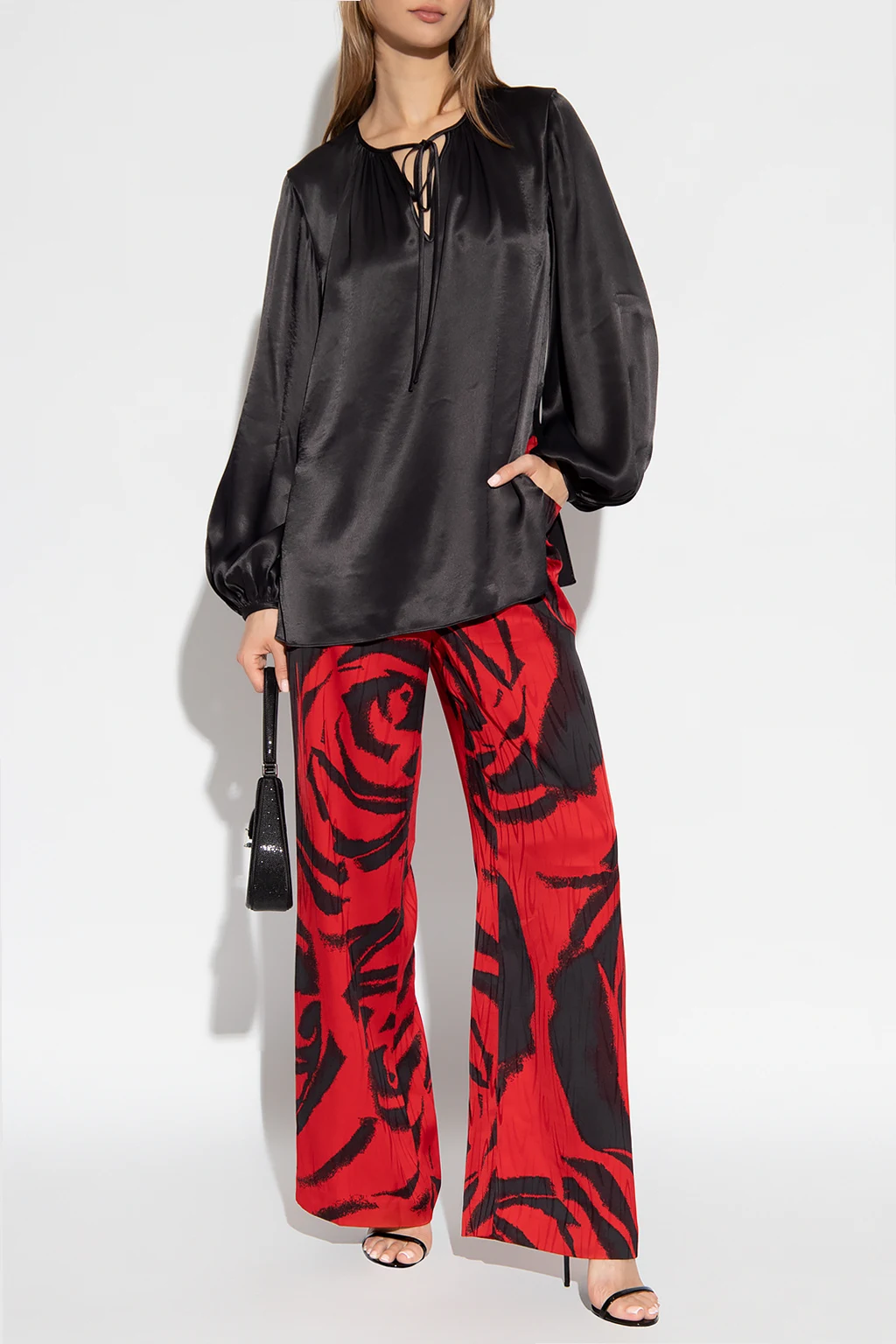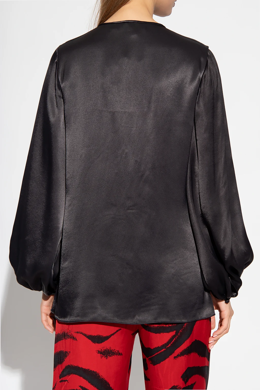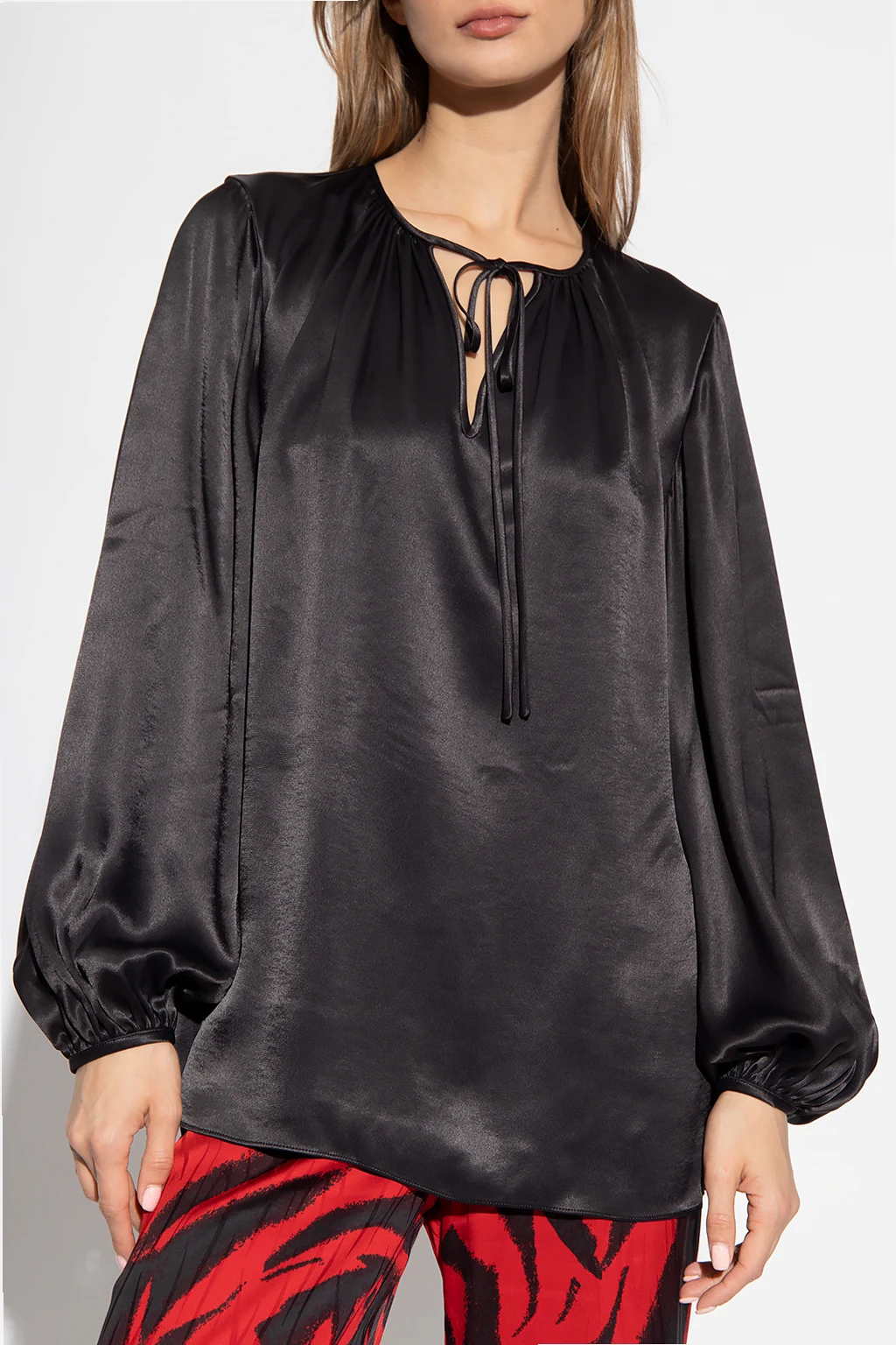 Black ‘Freddie’ top from Diane Von Furstenberg. Crafted from satin fabric with a relaxed fit, this style features a V-neckline with a tie fastening and piping, decorative gathers, side slits and long blouson sleeves with button cuffs.
