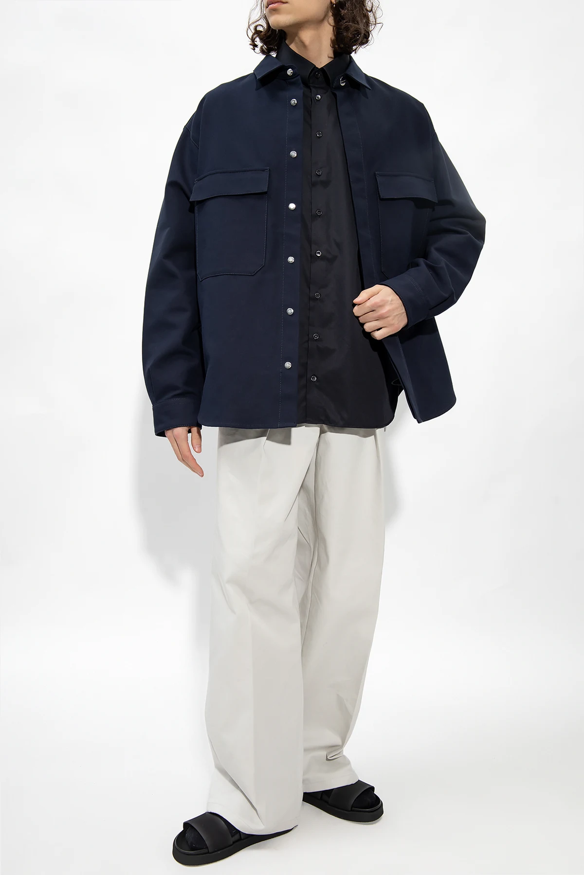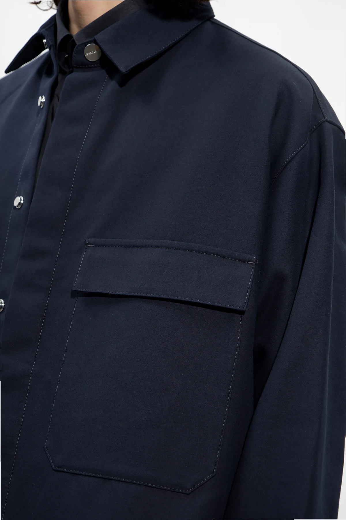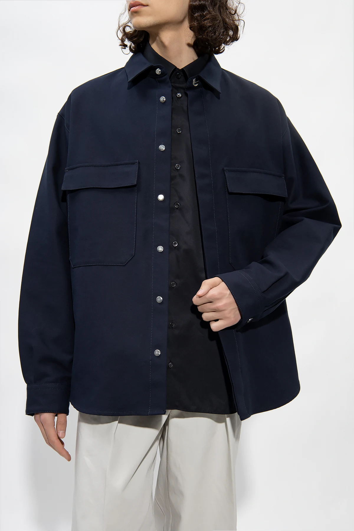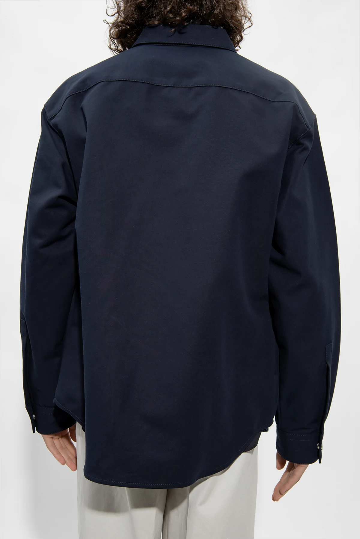 Navy blue jacket from Giorgio Armani. Made of cotton, this style fastens with snaps with a concealed placket and features two flapped pockets and two snap-fastened pockets and long sleeves with cuffs.