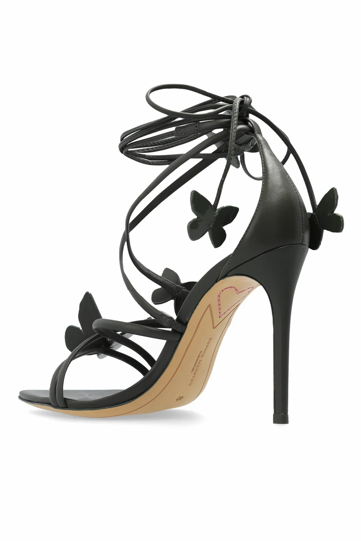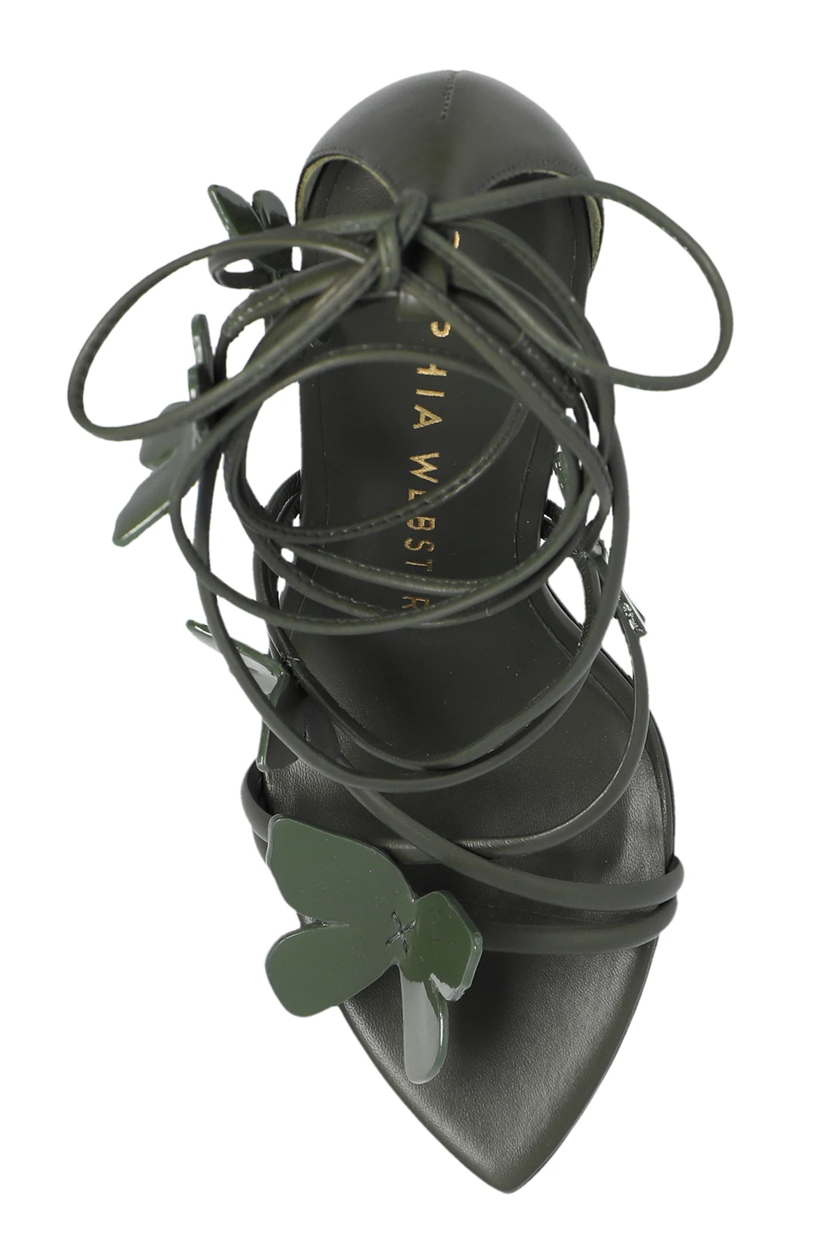 Introducing the Vanessa Heeled Sandals from the illustrious Sophia Webster collection. These exclusive sandals epitomize elegance and refinement, featuring a sleek silhouette with a high, slender stiletto heel. Crafted from premium leather, both the outer and inner linings of these sandals ensure unparalleled comfort and durability. The standout design element is the delicate, thin straps that gracefully encircle the foot and ankle, adorned with exquisite butterfly appliqués, imparting a unique and sophisticated charm. The sandals boast a deep green hue, contrasted beautifully by a beige outsole. The designer\'s logo on the inner sole certifies the authenticity and high fashion status of the product. The lace-up straps around the ankle provide a customizable fit, enhancing both stability and style. Why Choose This Product? Exquisite Design: Elegant thin straps with butterfly motifs. Premium Materials: High-quality leather for exterior and interior linings. Comfort and Fit: Adjustable lace-up straps for a tailored fit. Authenticity: Designer\'s logo on the inner sole. Elevated Elegance: High stiletto heel adds sophistication and elongates the legs.