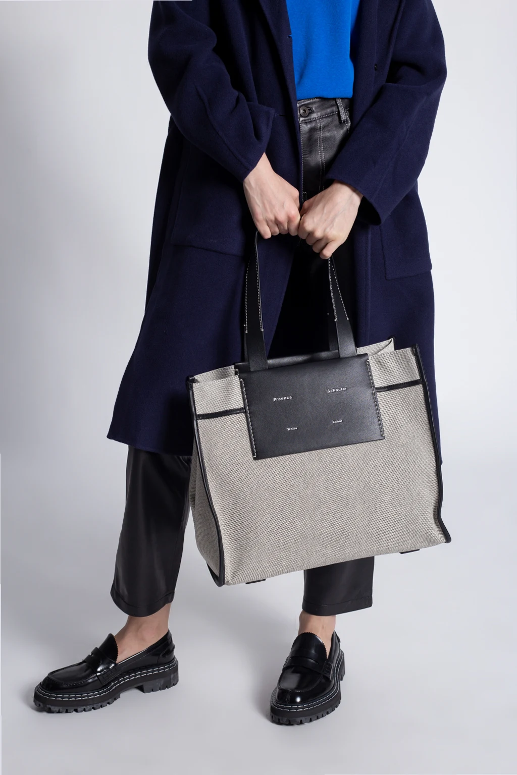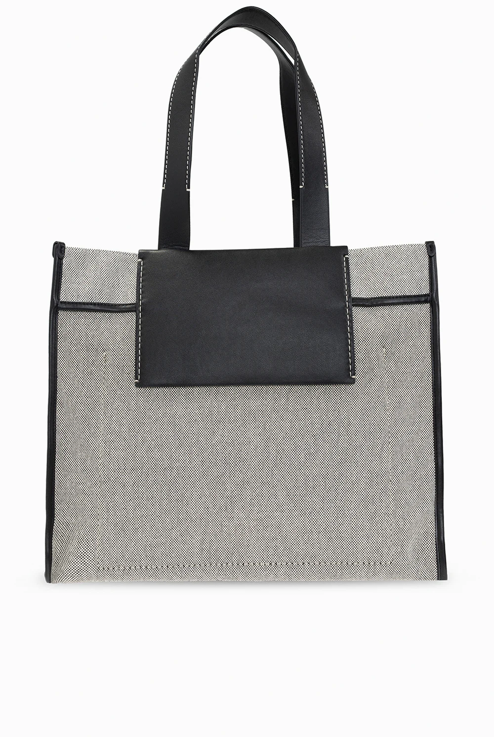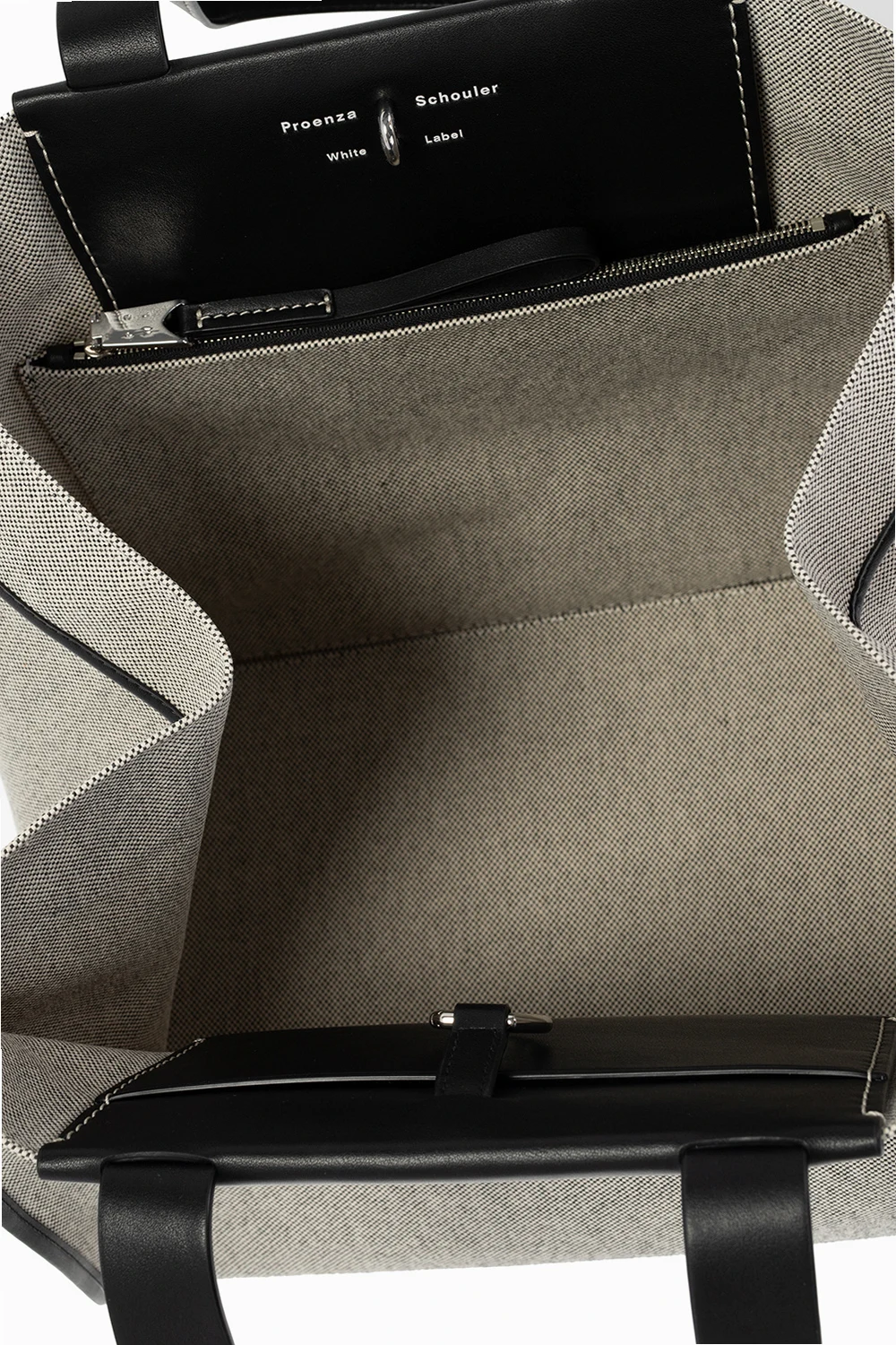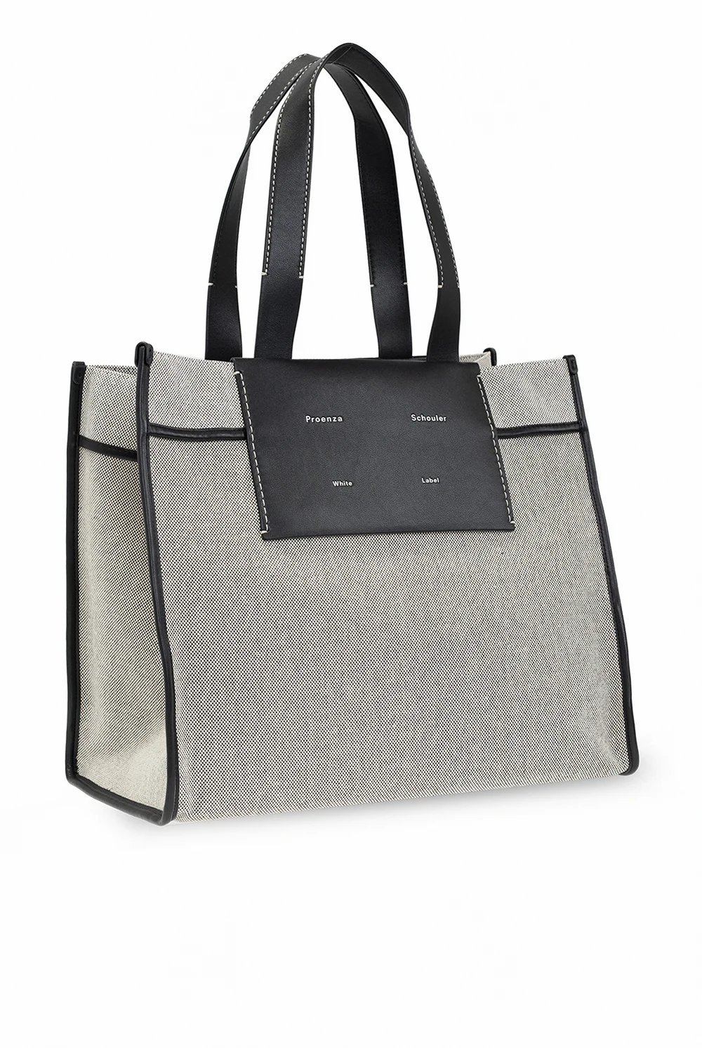 Cream and black \'Morris XL\' shopper bag from Proenza Schouler White Label. Finished with leather, this design secures with a lobster clasp and showcases an embossed white logo on the front, two half-round handles, silver-tone metal hardware and one internal compartment with one slip pocket and one zip pocket.