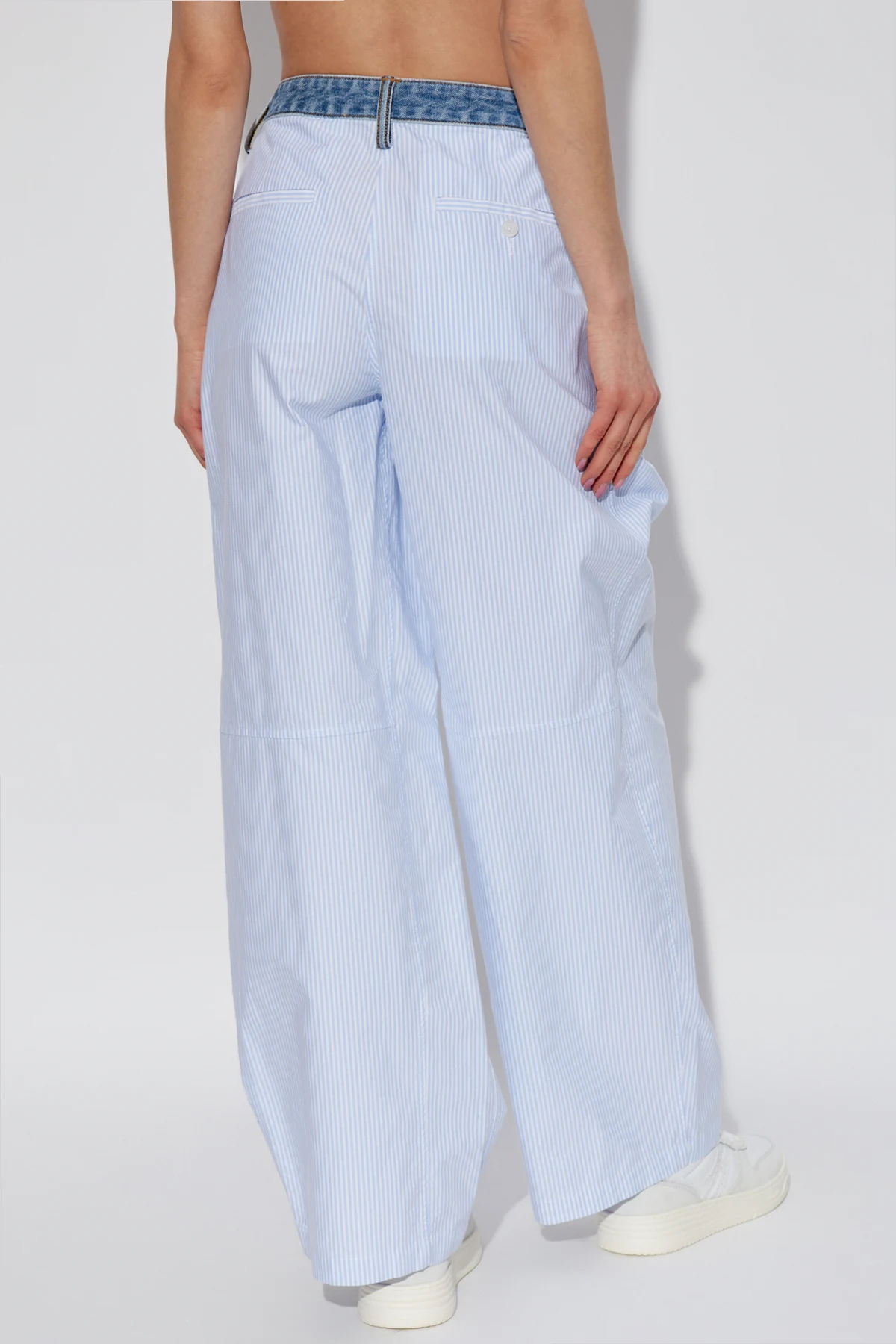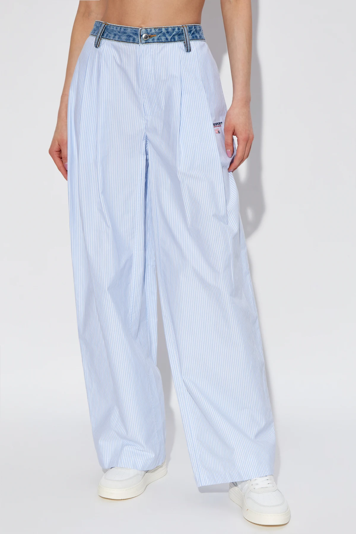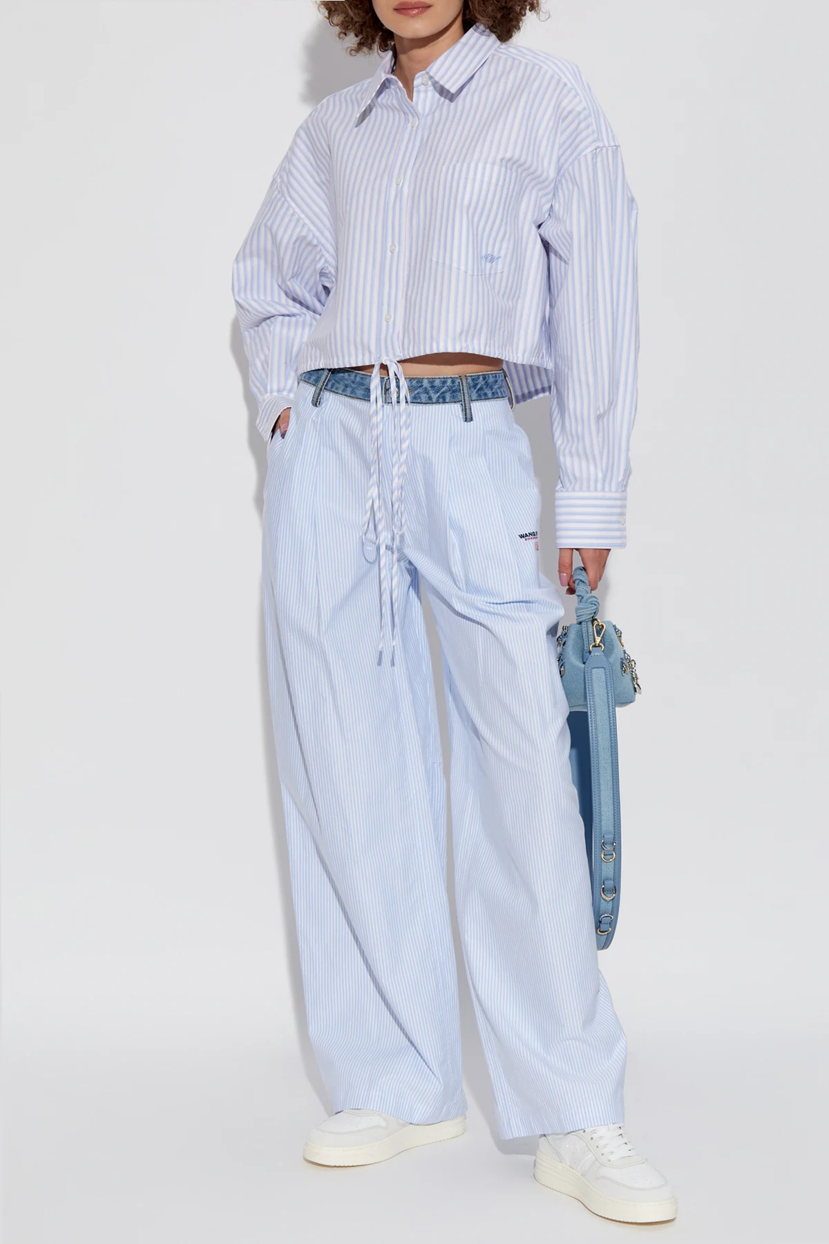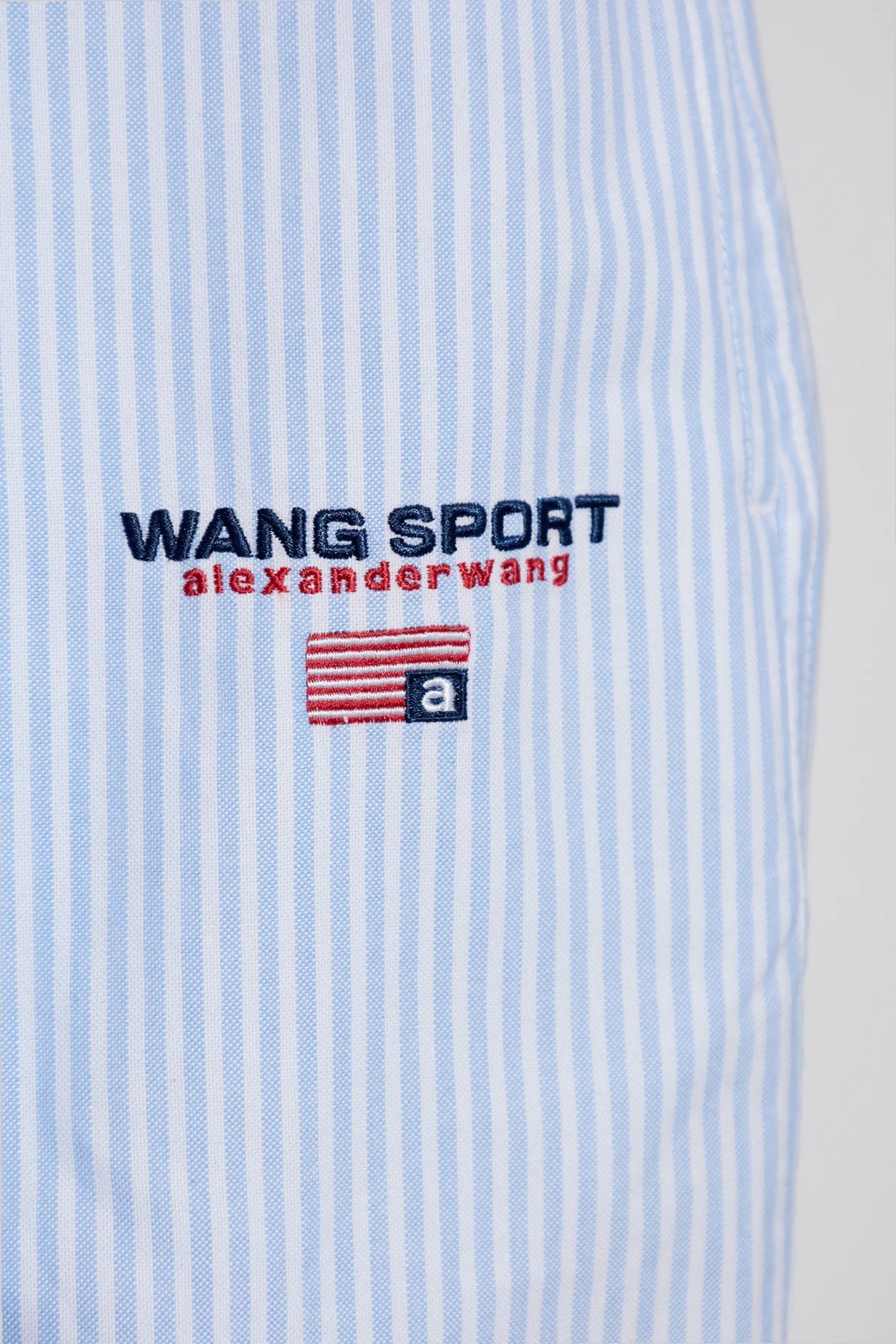 Presenting the epitome of casual elegance, the Wide-Leg Pants in light blue are a testament to understated sophistication. Crafted from the finest cotton, these pants feature a distinctive vertical ribbed pattern that exudes a refined charm. The dark blue waistband offers a striking contrast, accentuating the waist with subtle elegance. Embodying the modern aesthetic of T by Alexander Wang, these pants are adorned with a tasteful embroidery on one leg, showcasing the \"WANG SPORT\" and \"alexanderwang\" insignia, complemented by a delicate \"a\" graphic. This not only highlights the brand\'s identity but also adds a touch of urban flair. The relaxed fit and wide-leg design provide exceptional comfort, ideal for those who appreciate a seamless blend of style and ease. Fastened with a zipper and button, these blue-and-white pants are a versatile addition to any wardrobe. Why Choose This Product? Impeccable craftsmanship with 100% premium cotton. Signature embroidery for a unique, branded touch. Effortless blend of elegance and urban style. Designed by the renowned Alexander Wang.