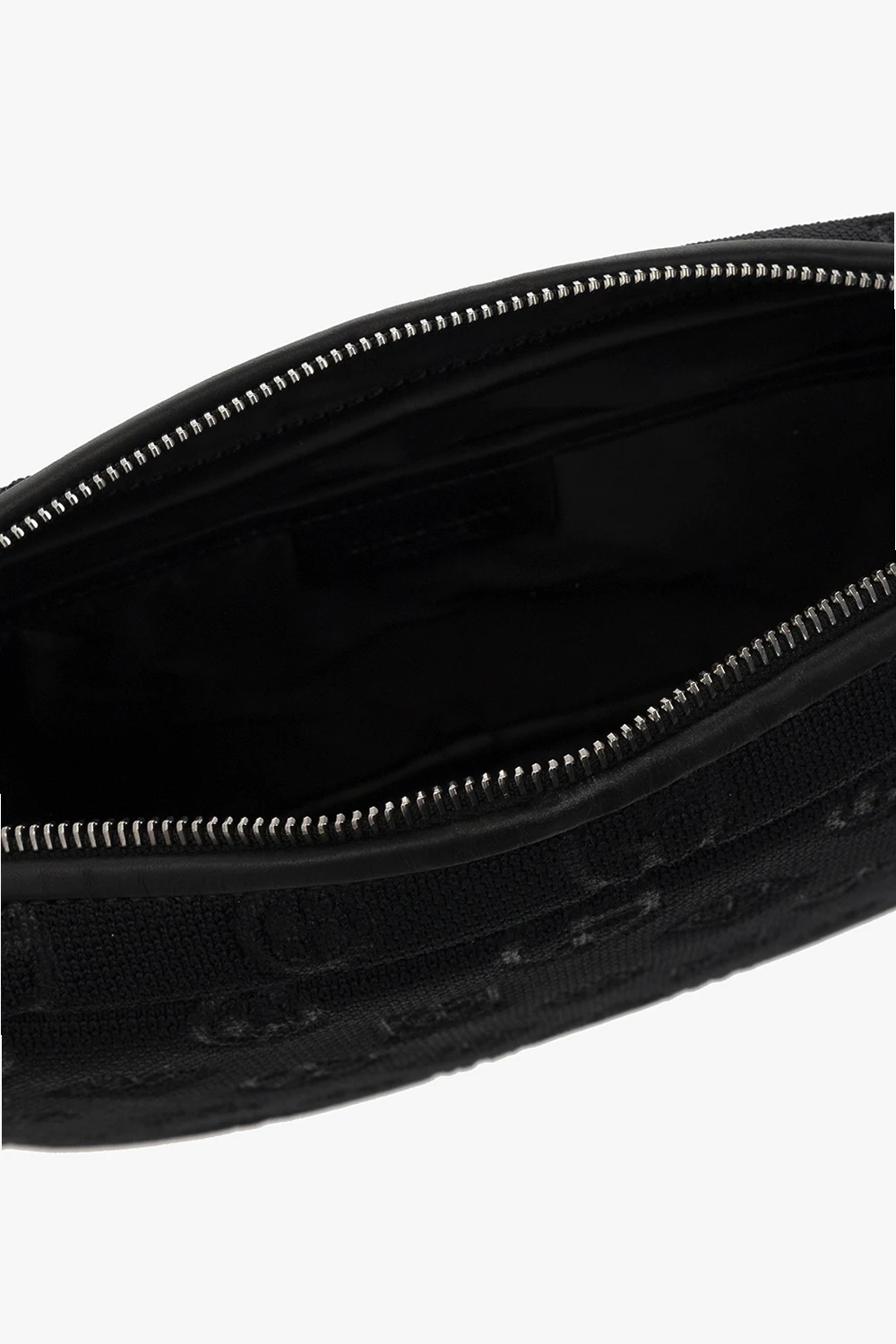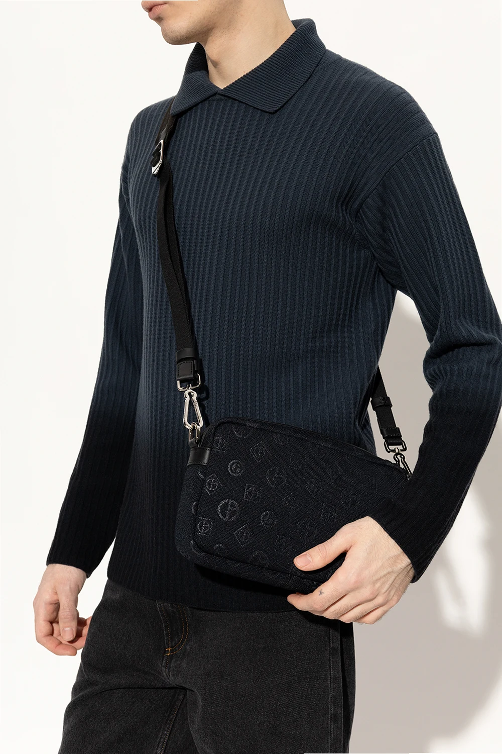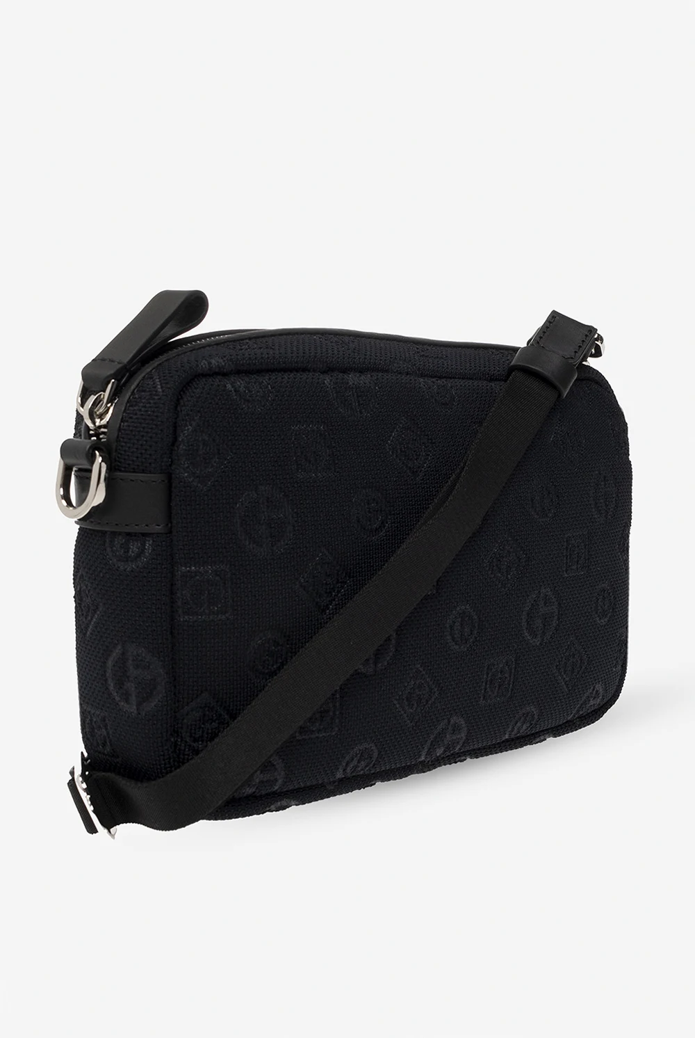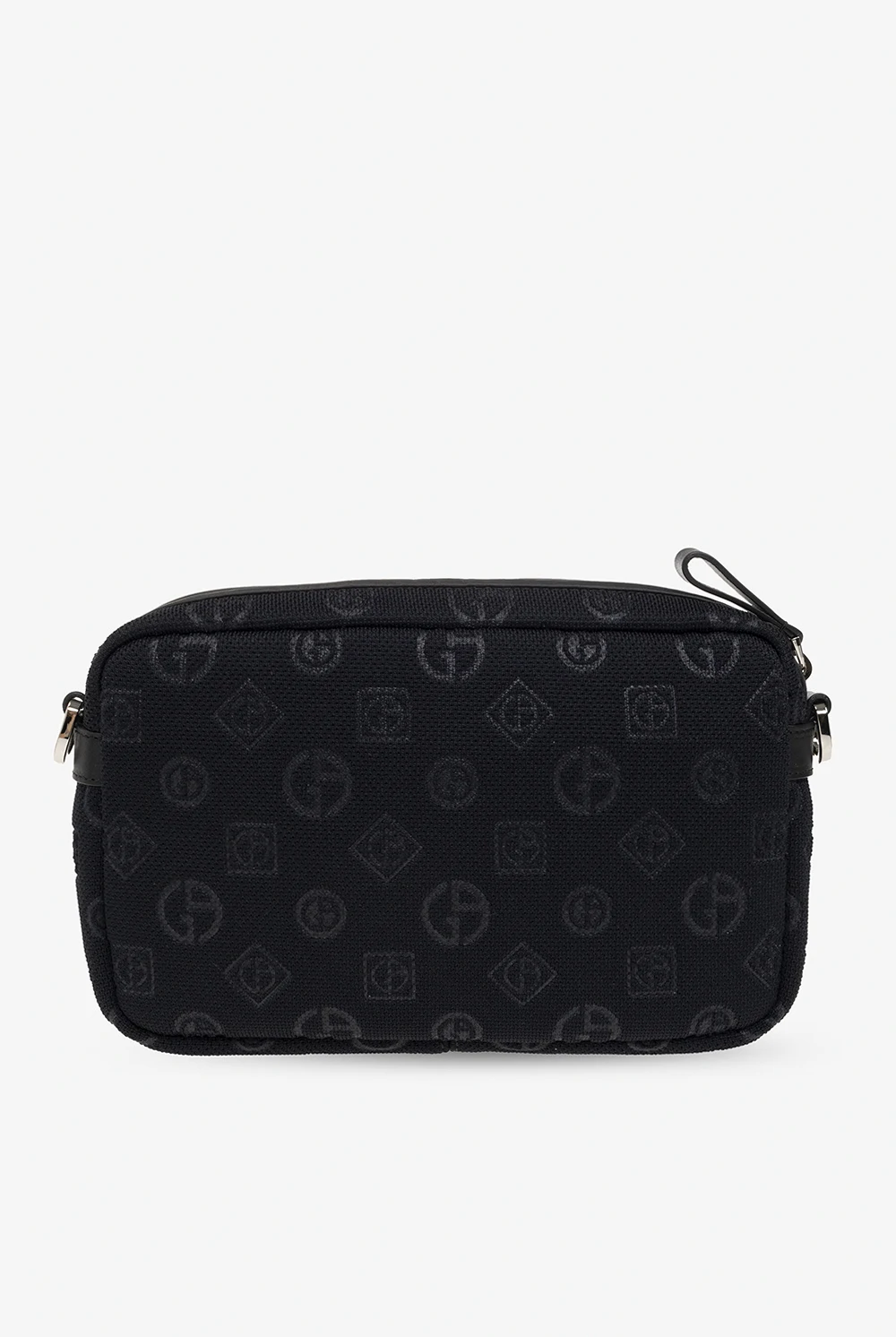Navy and black shoulder bag from Giorgio Armani. Crafted from fabric with a jacquard monogram pattern with bovine leather, this model features a zip fastening, detachable and adjustable shoulder strap, silver-tone metal hardware and one internal compartment with two slip pockets.