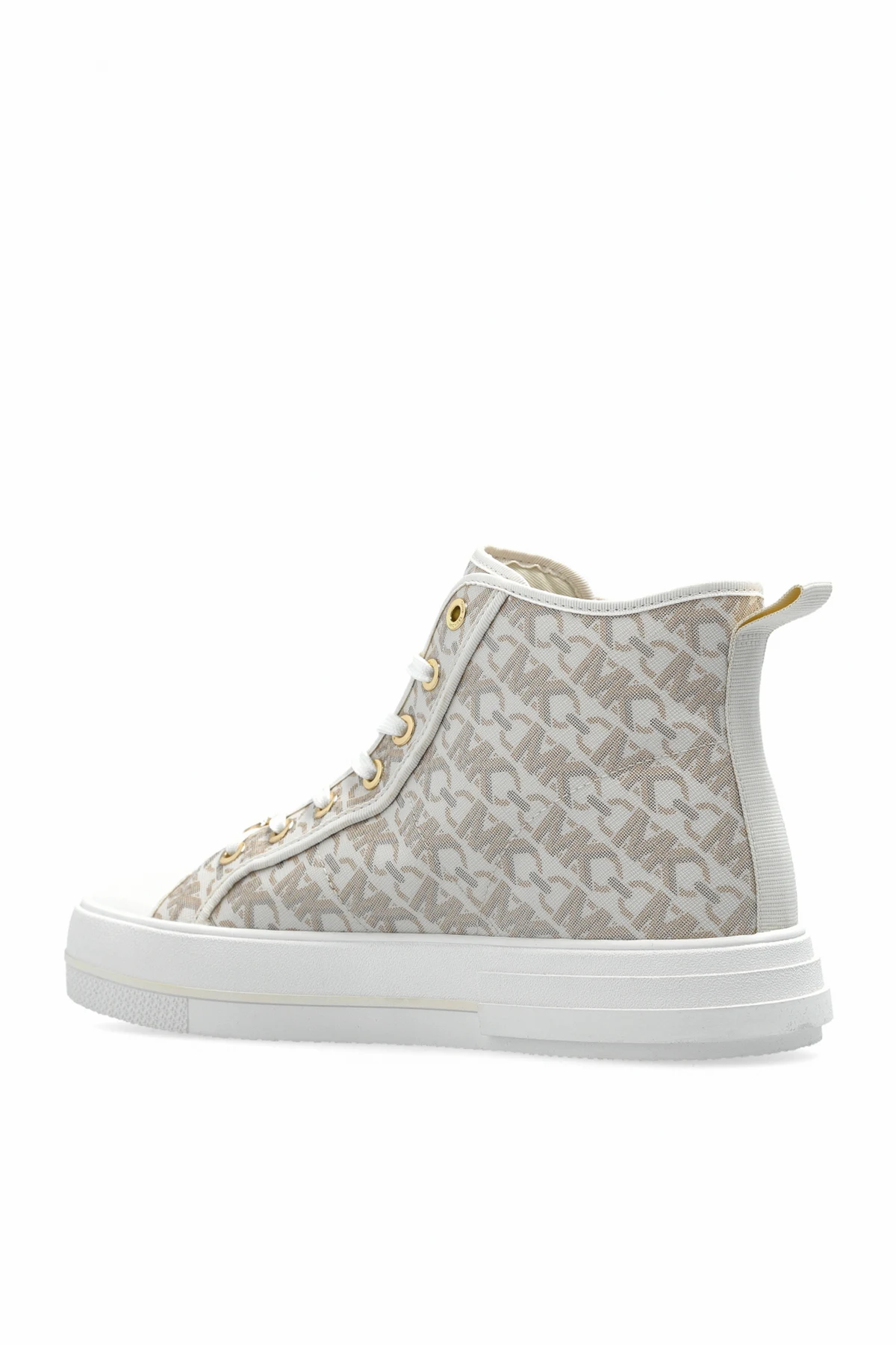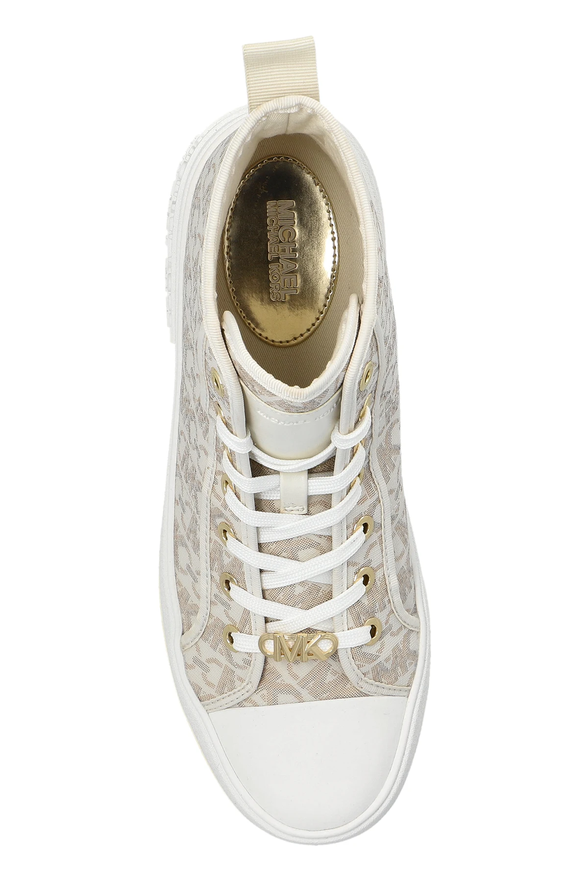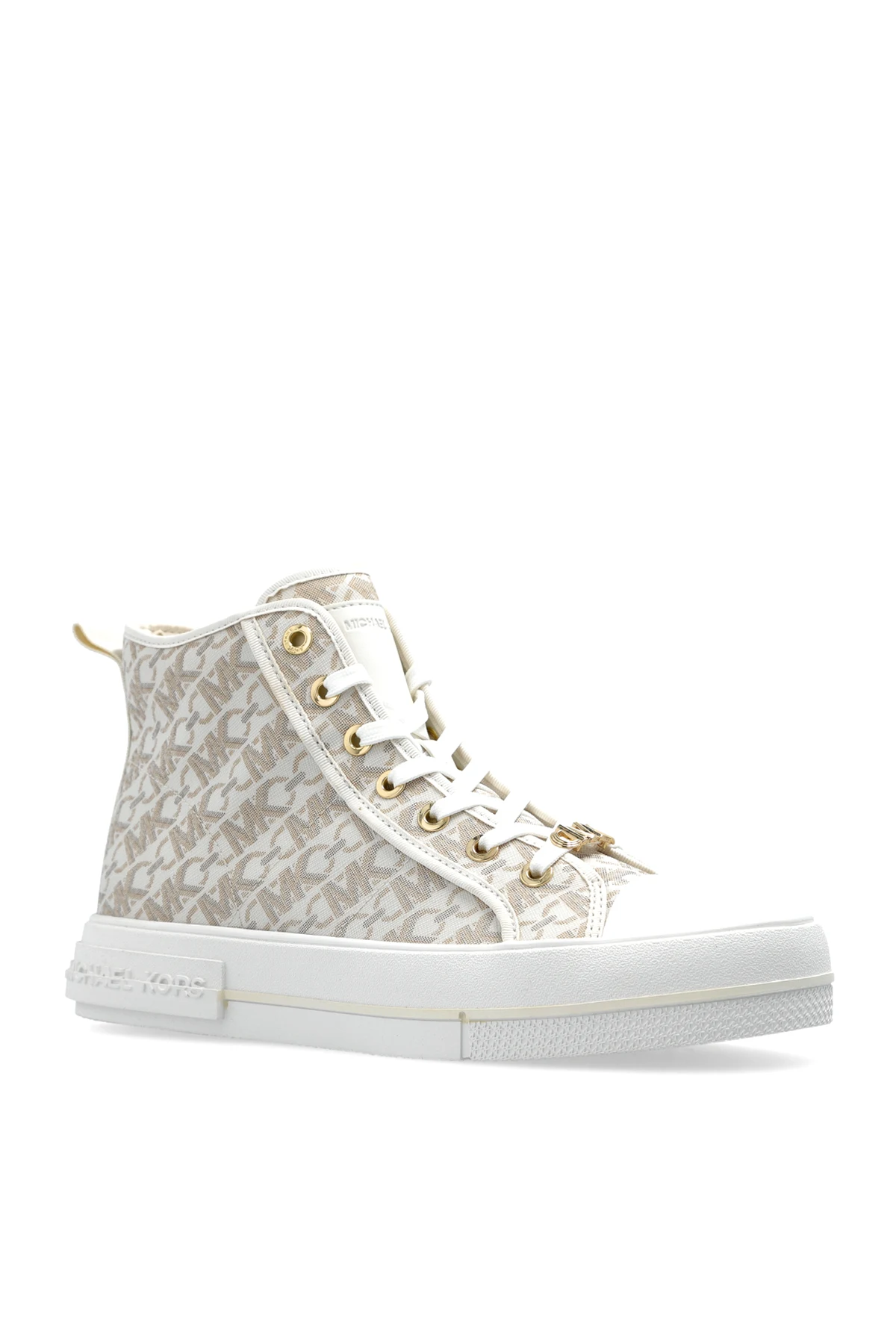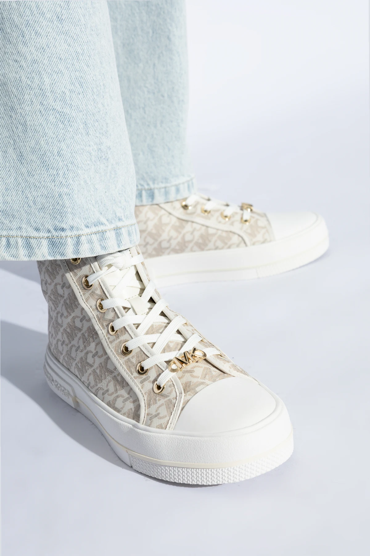 Introducing the Evy Ankle Sneakers by the illustrious designer Michael Michael Kors, an embodiment of elegance and contemporary flair. These exclusive sneakers merge modern design with classic elements, promising an impeccable fusion of fashion and comfort. The sneakers boast a classic high-top silhouette, offering enhanced support and a stylish aesthetic. The upper is adorned with an iconic designer monogram, accentuating their luxurious allure, set in a sophisticated cream hue. Exquisite details include gold eyelets and accents, along with a decorative logo embellishing the laces. A subtly embossed designer logo graces the side of the white rubber sole, ensuring comfort and excellent grip. The interior, featuring a signature designer insole, complements the elegant exterior. Crafted from premium canvas and materials, these sneakers are a testament to superior craftsmanship. Why Choose This Product? Classic high-top design for added support Luxurious monogrammed upper Gold accents for a touch of opulence Signature designer insole for added comfort Renowned Michael Michael Kors craftsmanship