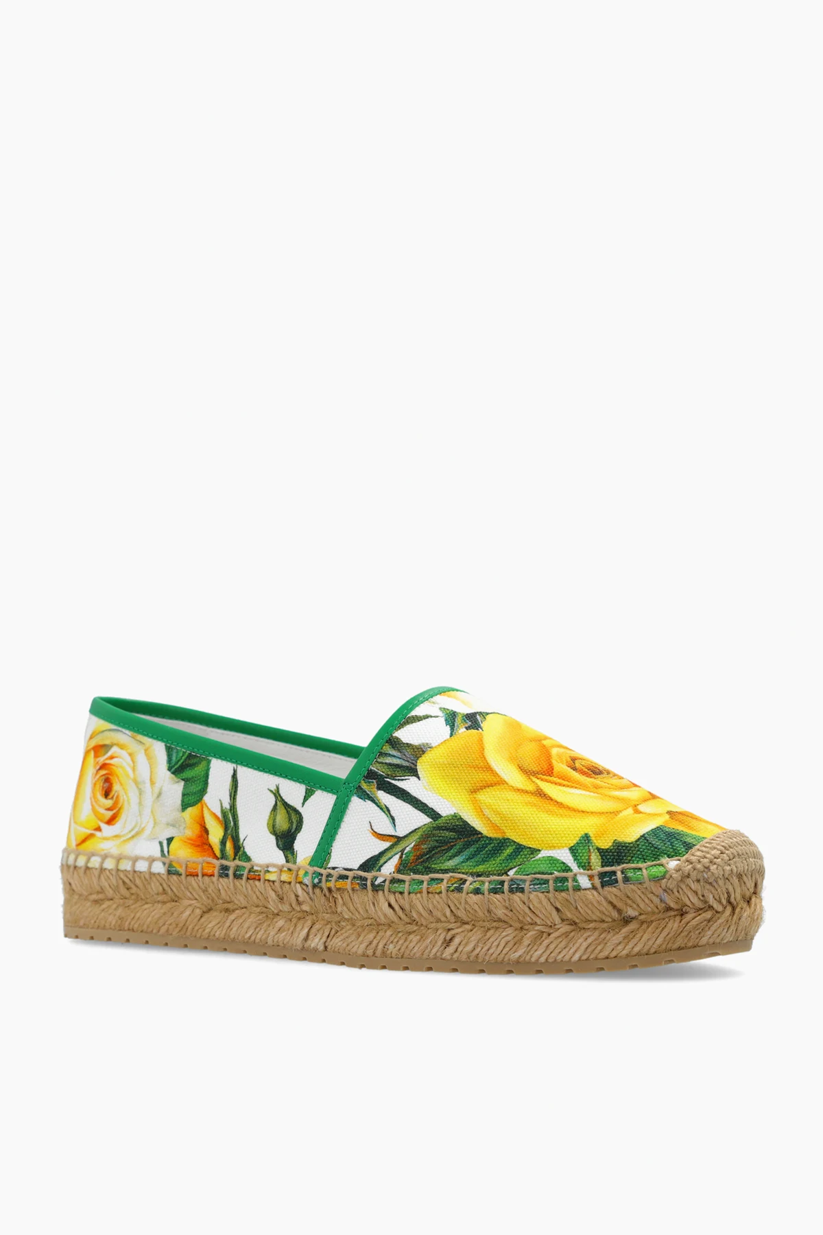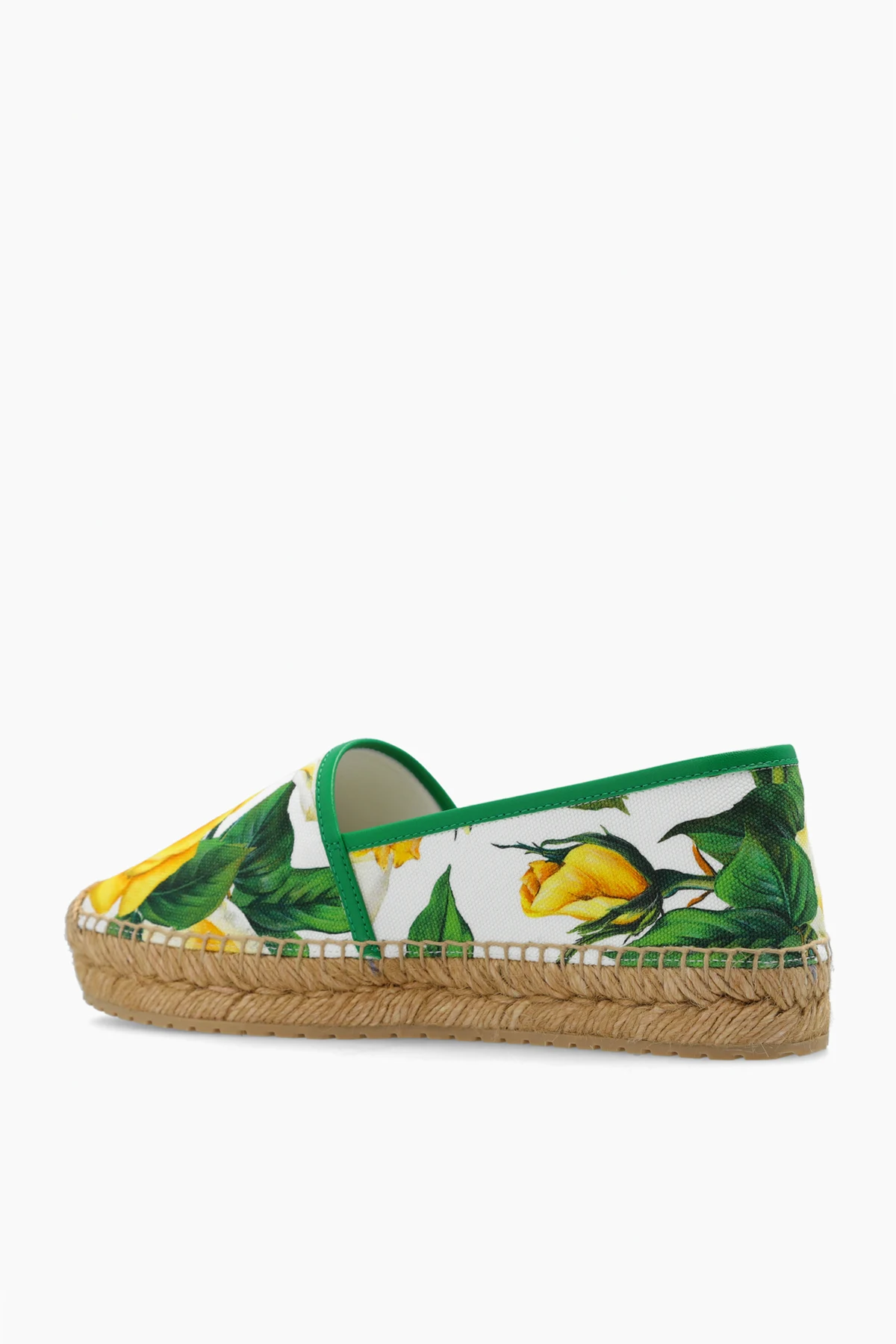 White, green and yellow espadrilles from Dolce & Gabbana. Made of cotton and trimmed with leather, this model sits on a beige rubber sole and showcases a floral motif.