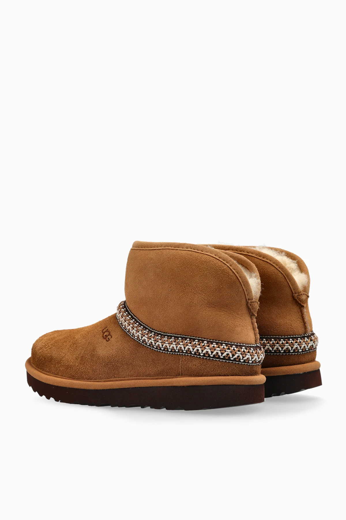 Introducing the UGG Kids Classic Mini snow boots, an exemplar of distinguished style from an exclusive collection. Adorned in a rich brown hue, these boots are crafted with a sumptuous suede exterior and a plush, furry interior, ensuring warmth and unparalleled comfort. The design is accentuated by an ornamental strap with a woven pattern that elegantly encircles the shaft, imparting a chic touch. A prominently embossed brand logo graces the side, while the silhouette boasts a timeless, low-profile form with a rounded toe. A durable, thick rubber sole provides excellent traction, making these boots a perfect companion for winter escapades. These boots epitomize the seamless fusion of functionality and sophisticated design. Why Choose This Product? Superior warmth and comfort with a soft, furry lining. Stylish woven strap detail for a unique aesthetic. Durable rubber sole for enhanced grip and stability. Iconic UGG brand logo for an authentic touch.