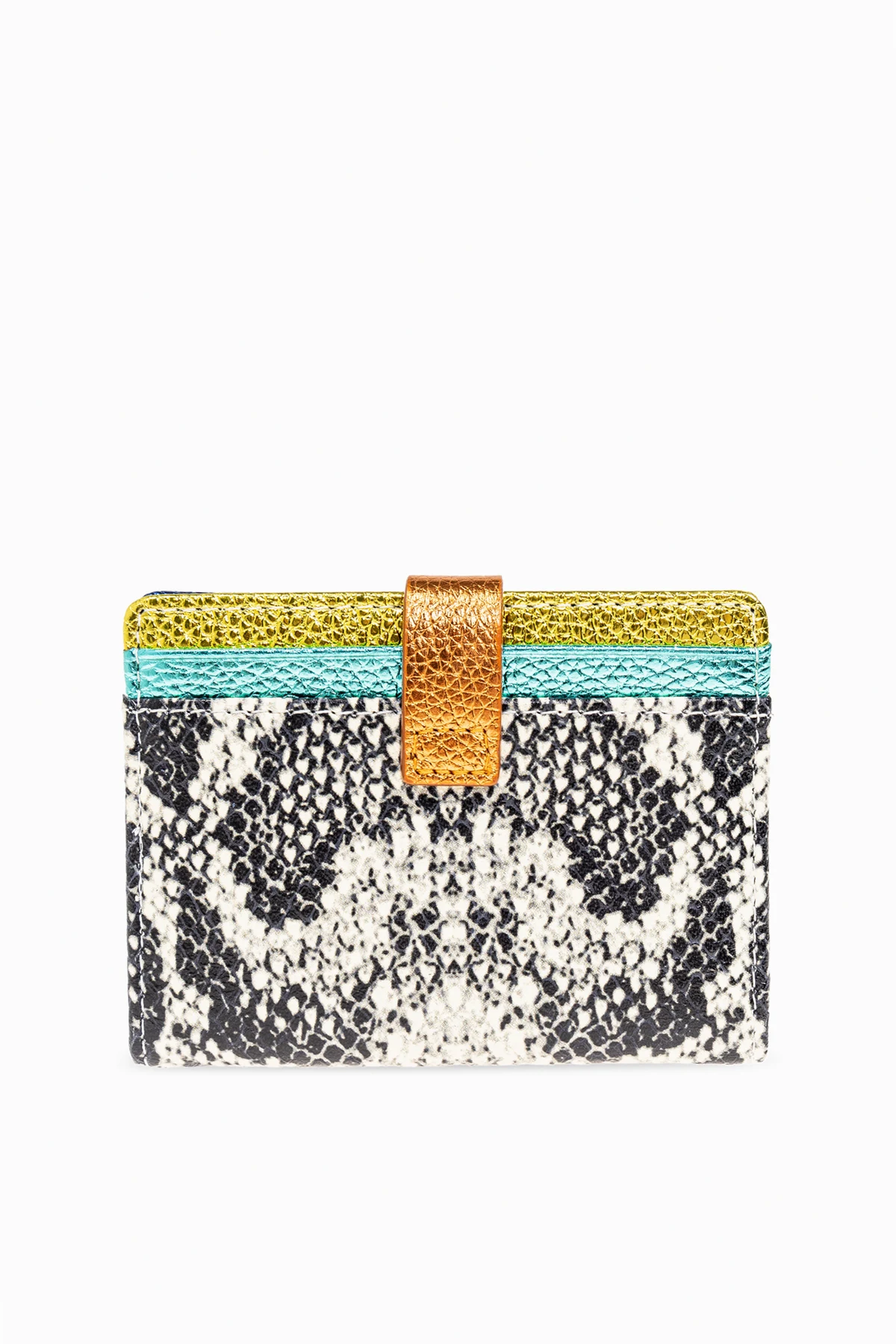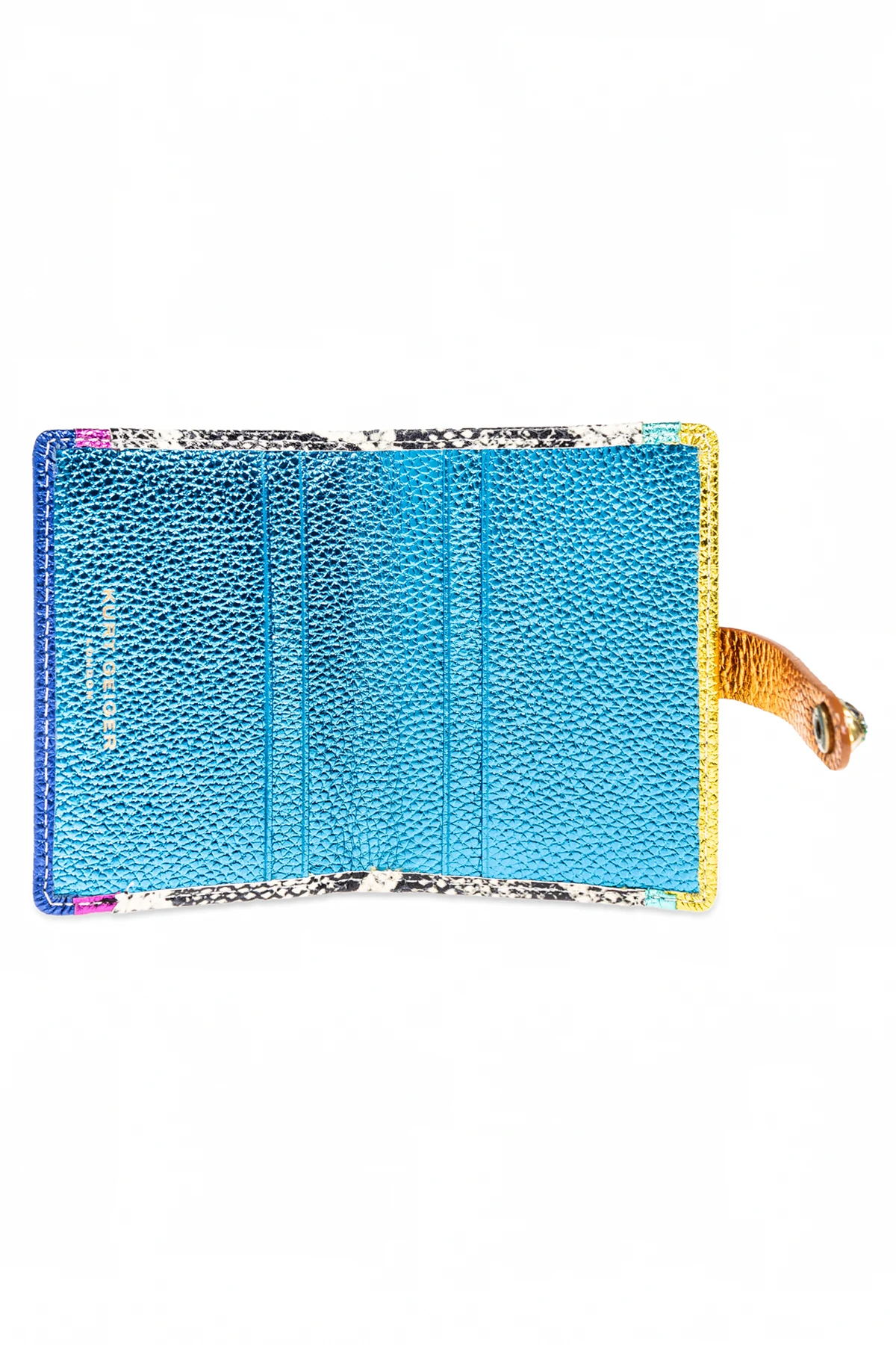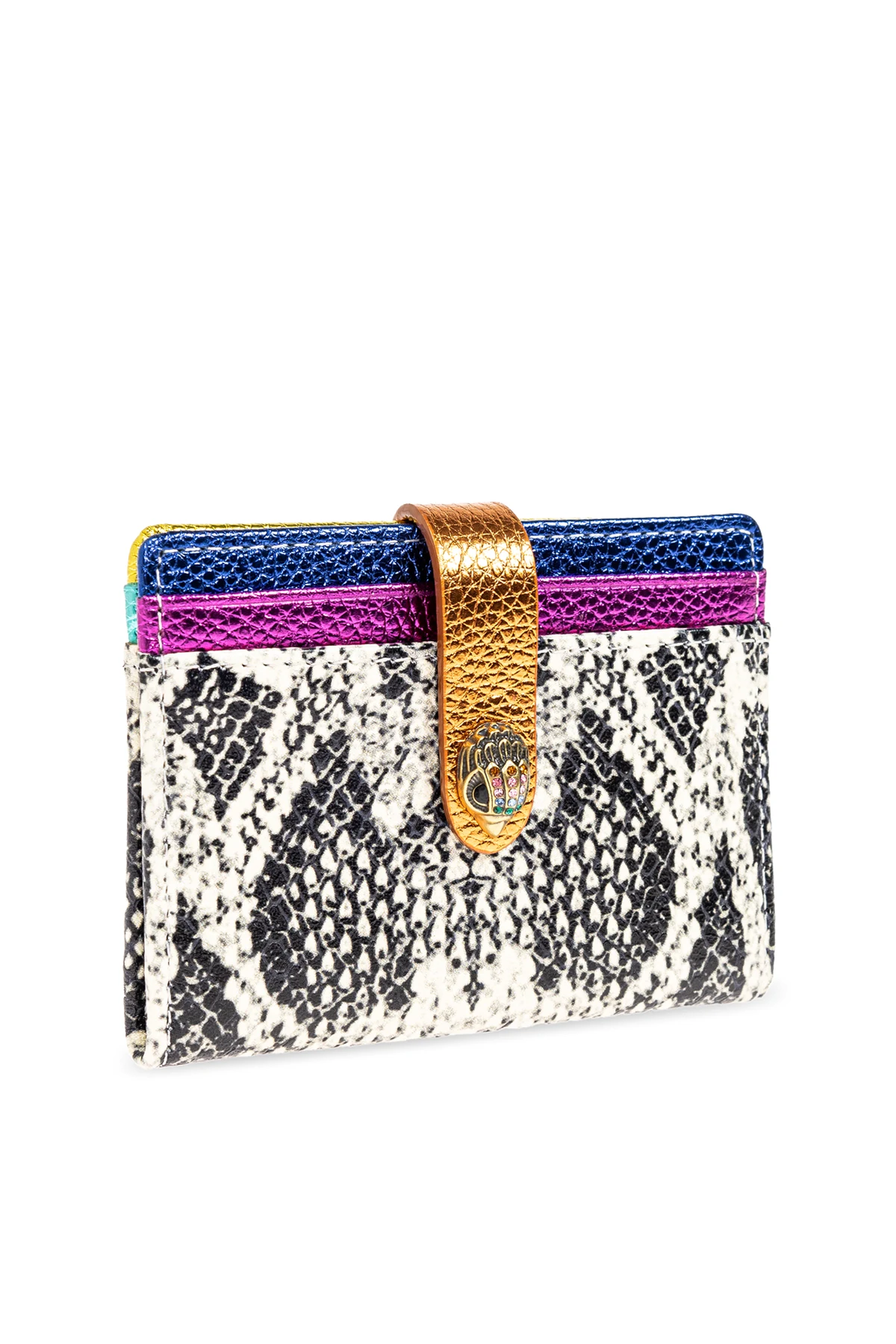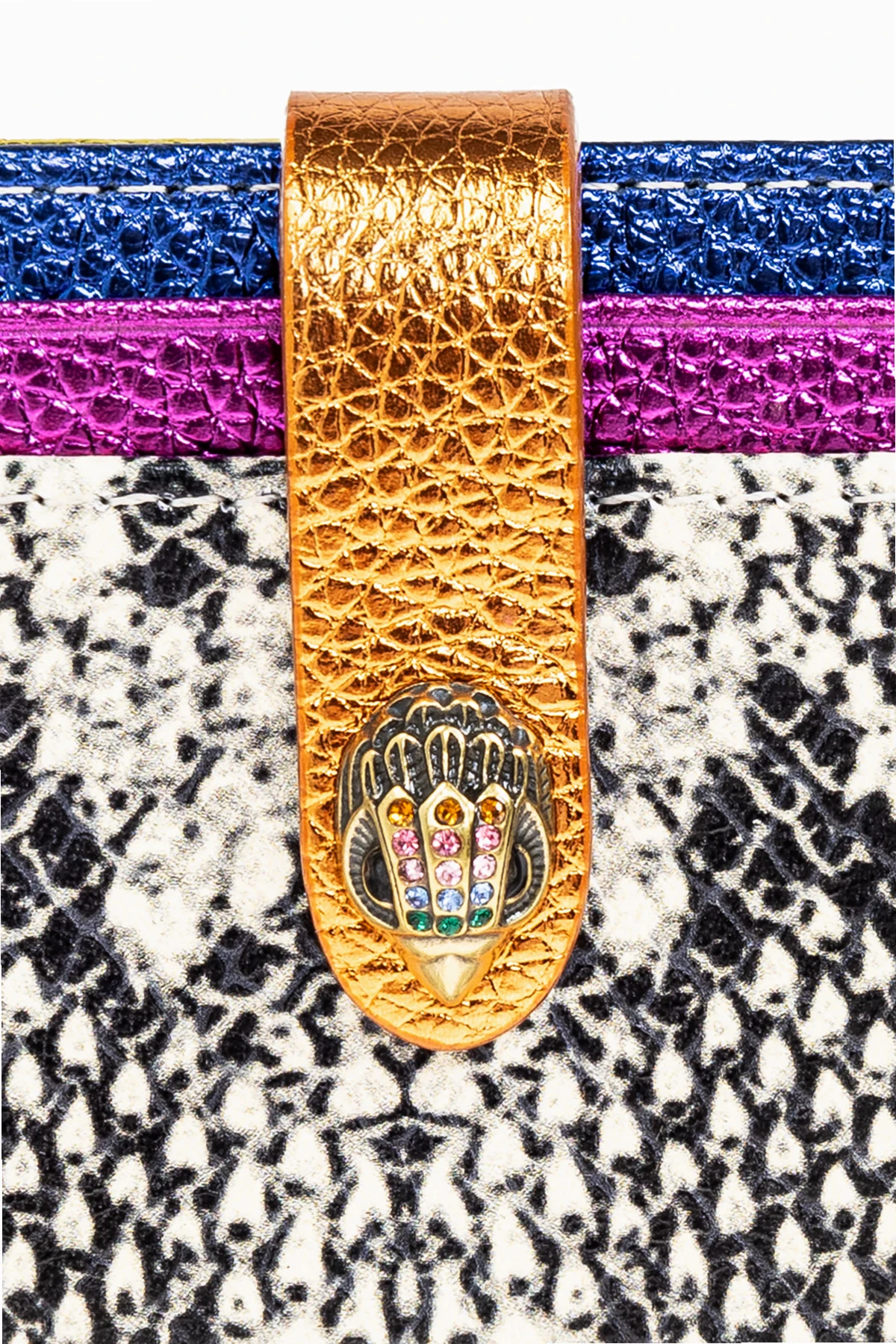 Introducing the Leather Wallet from the exclusive collection by the illustrious designer Kurt Geiger. This masterpiece is crafted from premium leather and showcases a captivating snake skin-inspired pattern in a multicolor palette, featuring shades of black, white, and vibrant accents of blue, purple, green, and yellow. The wallet\'s closure is meticulously fashioned from brown leather with a crocodile skin texture, adorned with an exquisite hand-shaped embellishment encrusted with colorful stones. Inside, the wallet reveals a soft light-blue interior with eight card slots, seamlessly merging elegance with practicality. This wallet epitomizes the fusion of luxury and functionality, making it a quintessential accessory for those who appreciate distinctive design and superior craftsmanship. The perfect blend of British street style and pop culture, this piece reflects the dynamic ethos of Kurt Geiger, a brand synonymous with innovation and maximalist flair. Why Choose This Product? Exclusive design by renowned brand Kurt Geiger Unique snake skin-inspired pattern with multicolor highlights Elegant hand-shaped embellishment with colorful stones Ample storage with eight dedicated card slots Combines luxury and practicality for everyday elegance