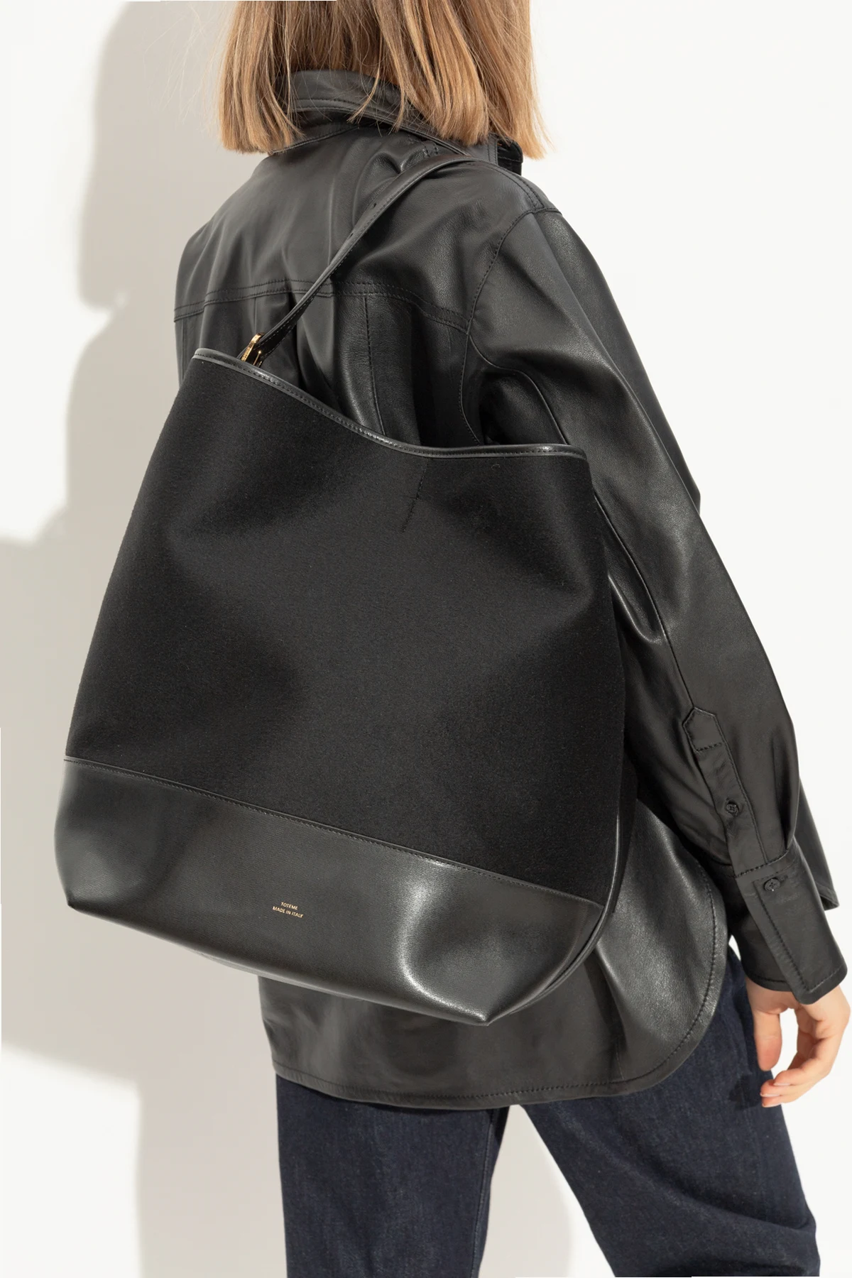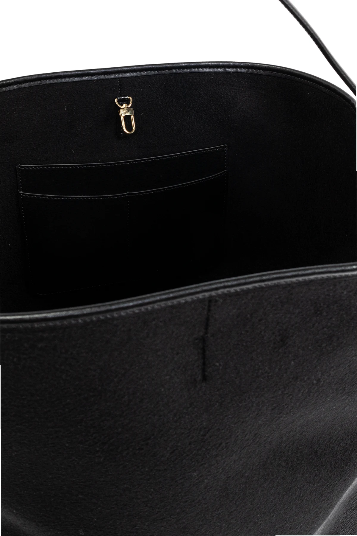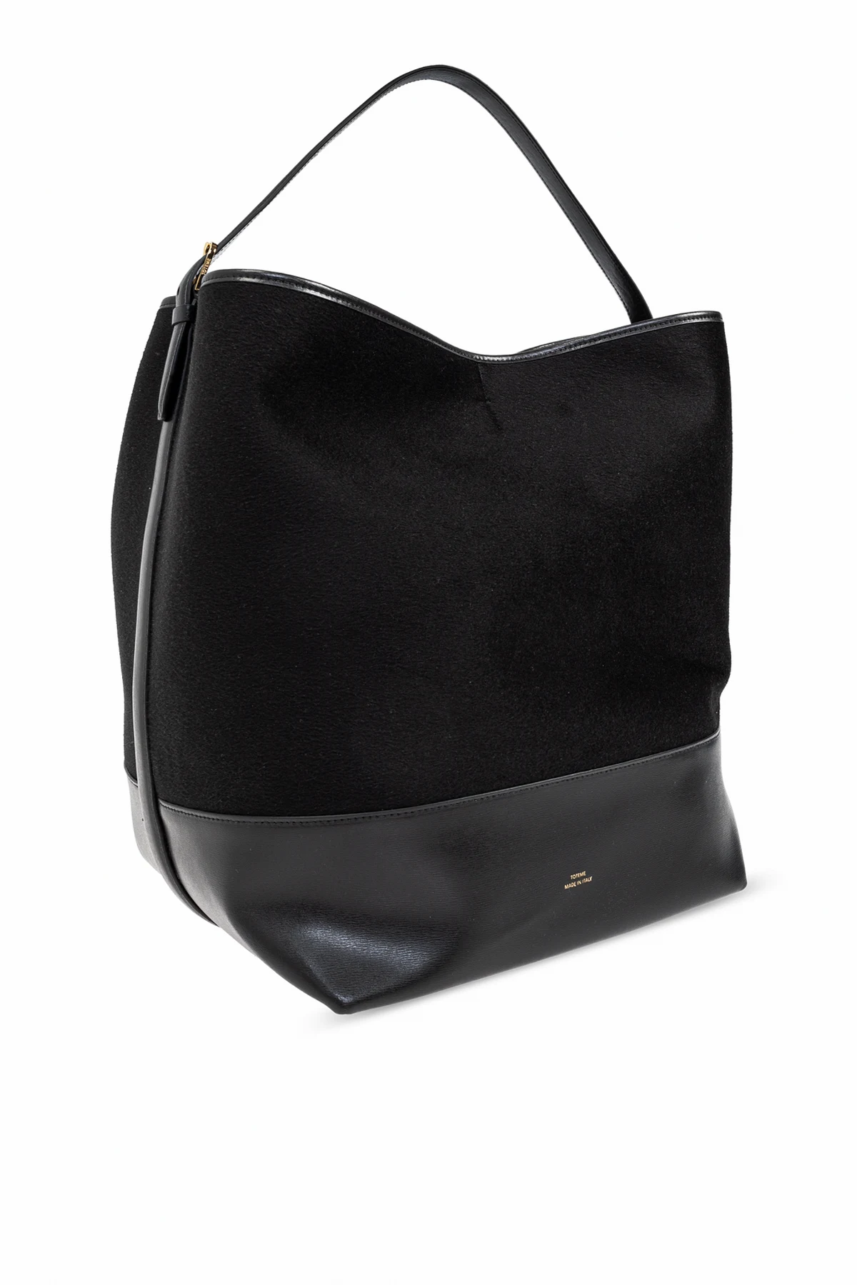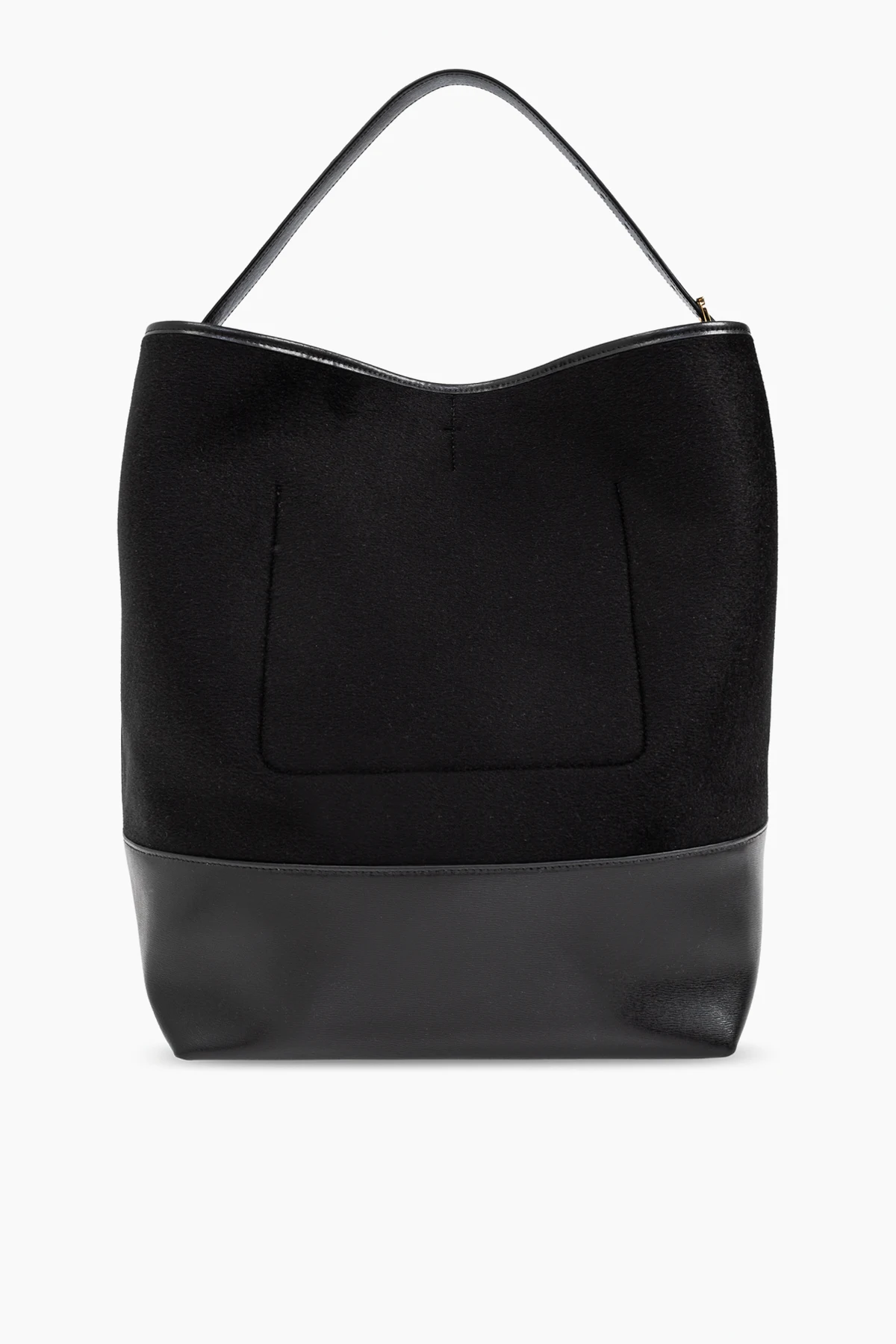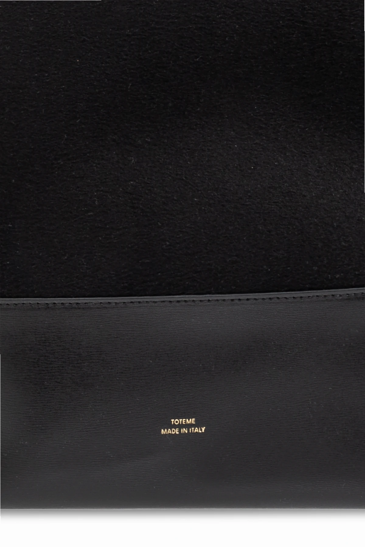 Introducing the epitome of sophistication and practicality, the Shopper Bag from TOTEME\'s exclusive collection. This bag boasts a rectangular silhouette with gracefully rounded edges, offering a spacious sanctuary for your daily essentials. Crafted to perfection, the upper section of the bag features a fabric reminiscent of wool or suede, seamlessly complementing the luxurious leather bottom and handle. The dominant black hue ensures its versatility, making it an indispensable accessory for any ensemble. The bag\'s lower section is adorned with a discreet gold logo inscription, \"TOTEME\" and \"MADE IN ITALY\", underscoring its exquisite craftsmanship. Inside, discover a capacious compartment with two slip pockets, enhanced by a gleaming gold clasp for secure closure. Why Choose This Product? Exquisite blend of wool-like fabric and leather. Timeless black color, adaptable to any style. Spacious interior with additional pockets for functionality. Designed by the progressive brand TOTEME, known for urban elegance. Crafted in Italy, ensuring premium quality and design.