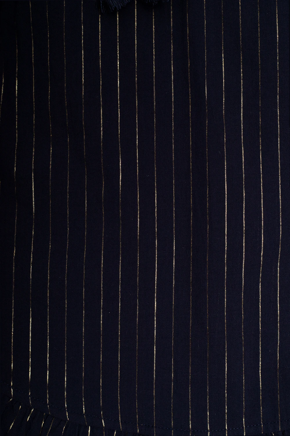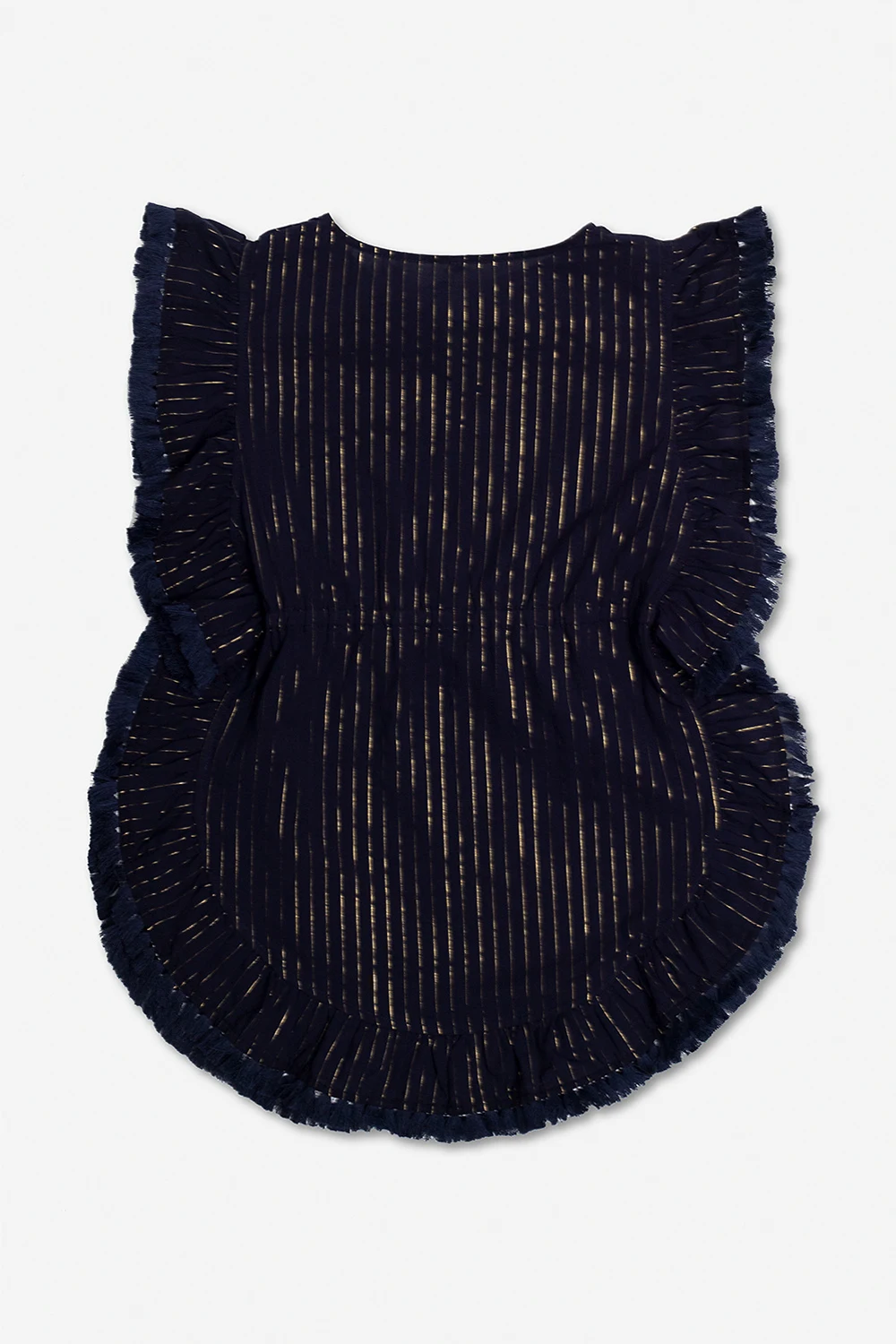 Navy blue dress from Zimmermann Kids. Made from cotton and decorated with gold-tone lurex pinstripes, this style features a round neck with drawstrings, a waist-cinching drawstring belt and ruffle detailing on the short sleeves, sides and bottom hem.