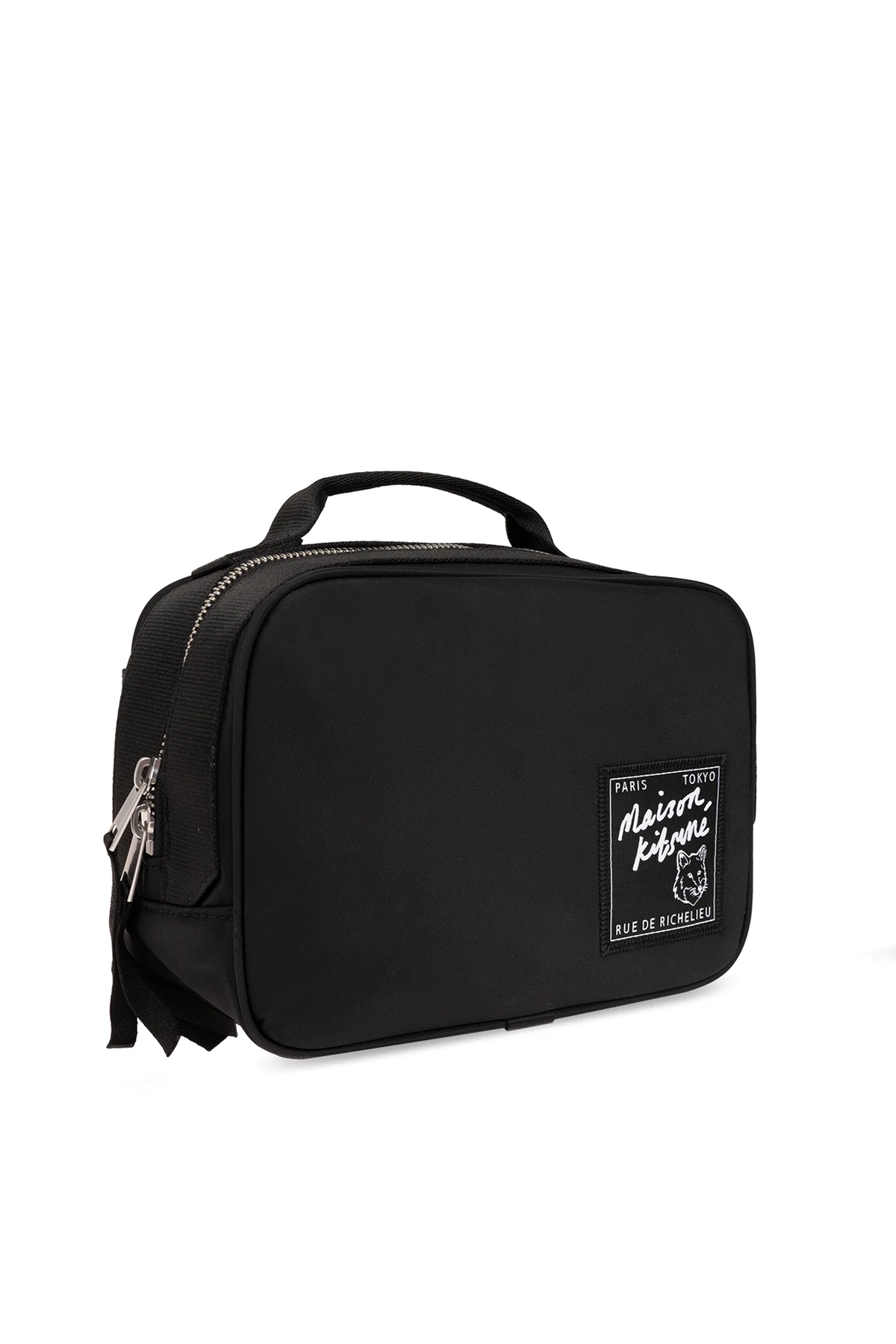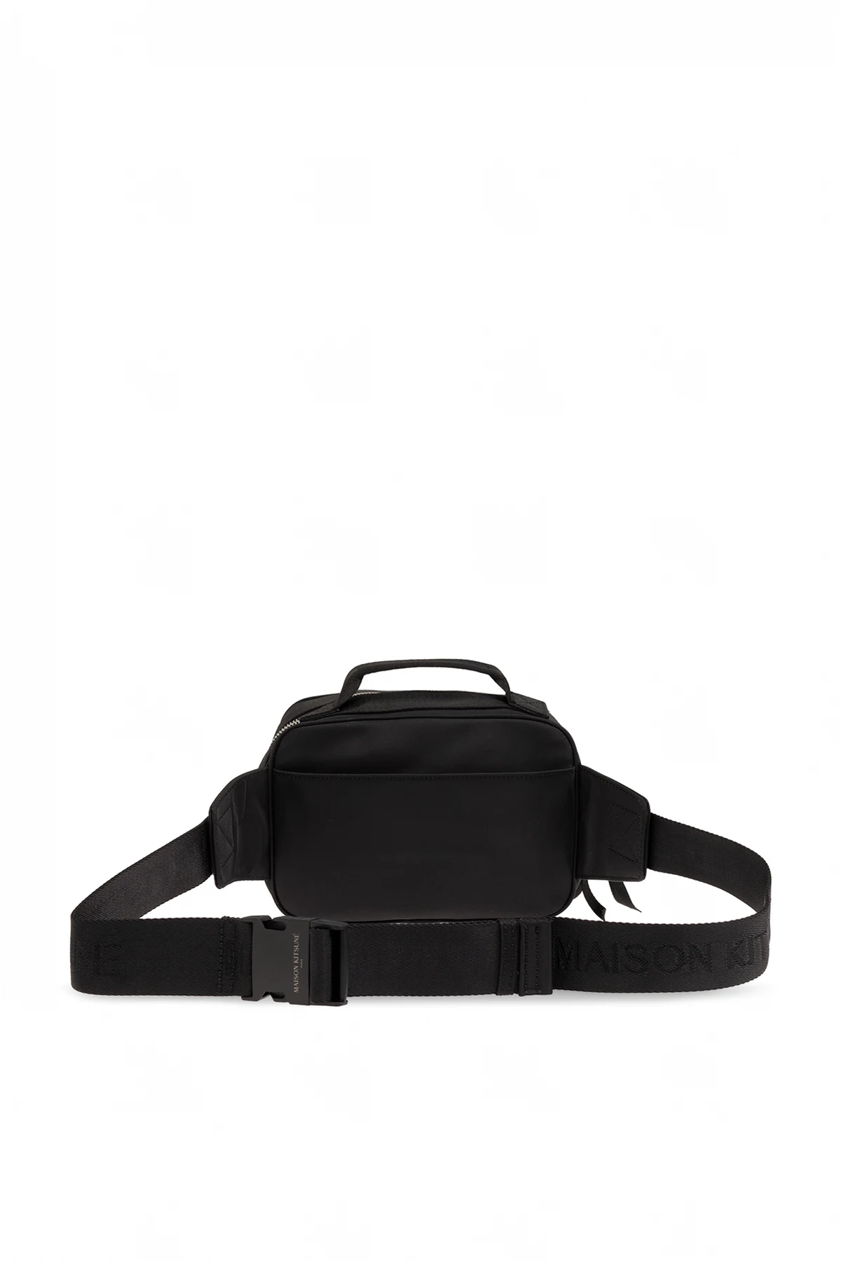 Black belt bag from Maison Kitsune. This design fastens via a two-way zip and showcases a logo patch on the front, one snap-fastened pocket on the back, silver-tone metal hardware as well as an adjustable strap and one internal compartment with a slip pocket.