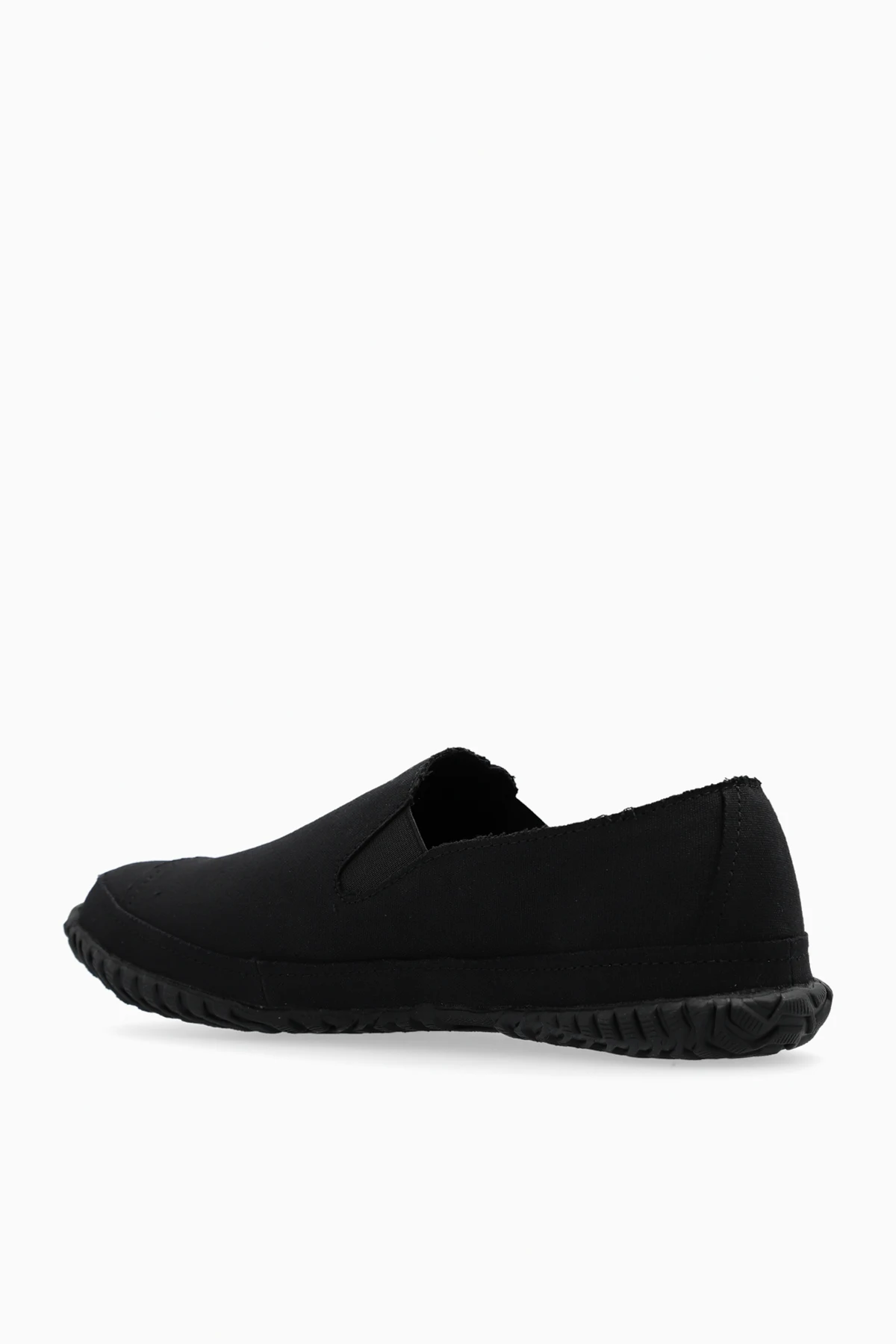 Black shoes from Yohji Yamamoto. Made of cotton canvas, this lace-up pair features asymmetrical patches, raw trims and a black rubber sole.