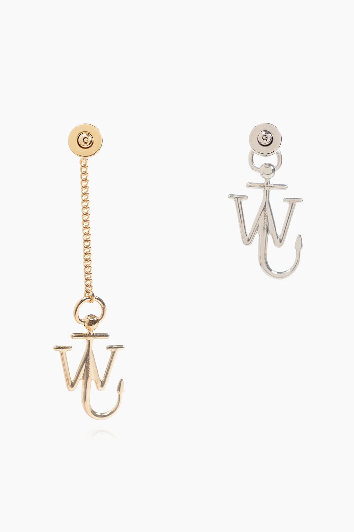 Gold-tone and silver-tone earrings from JW Anderson. Made of eco brass with an asymmetrical silhouette, they secure with push-back closures and showcase logo charms.