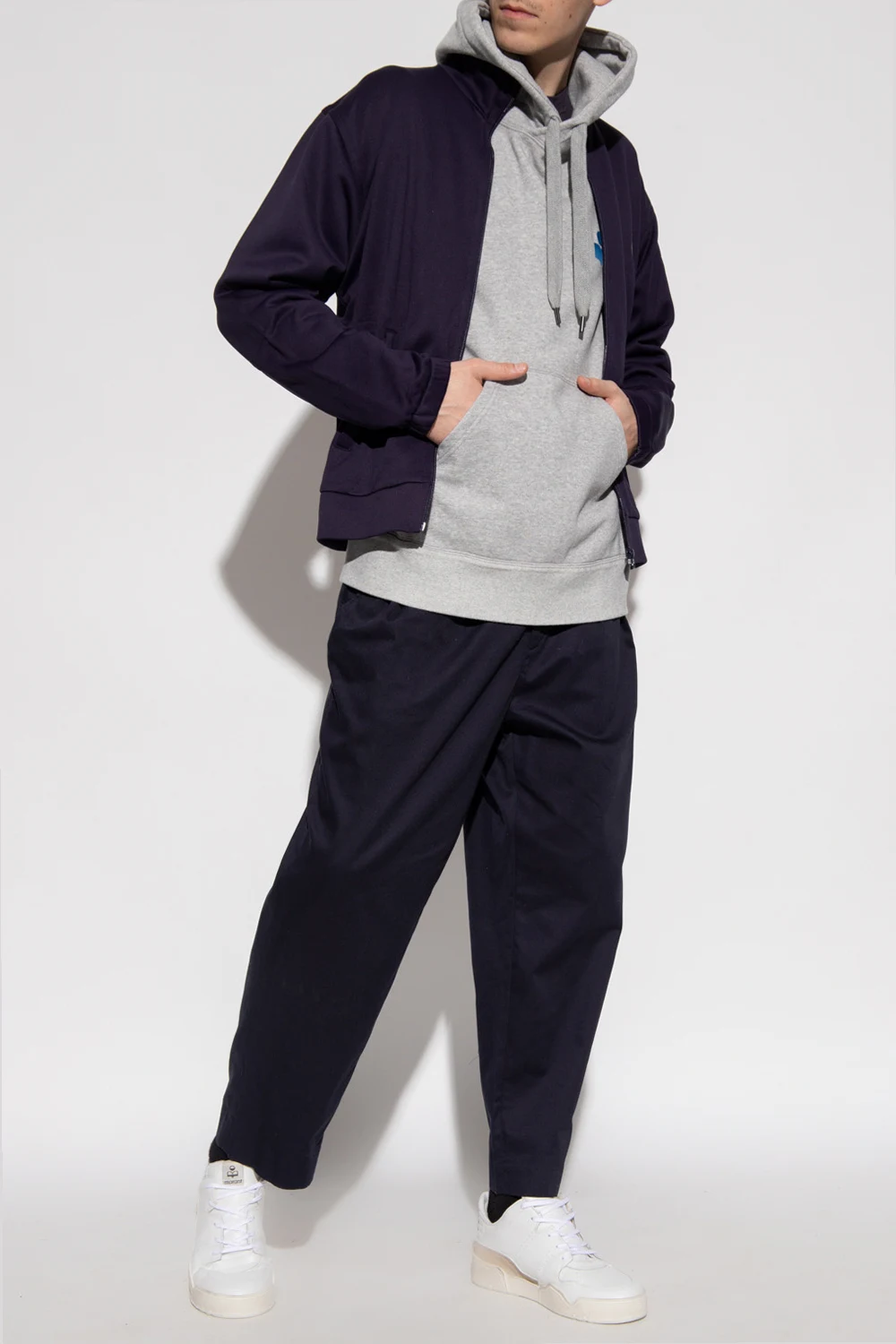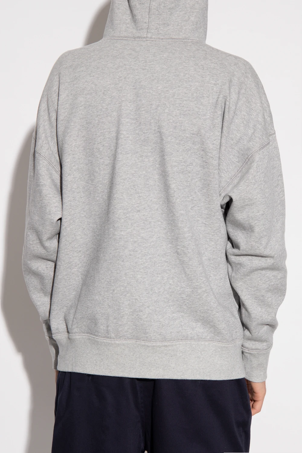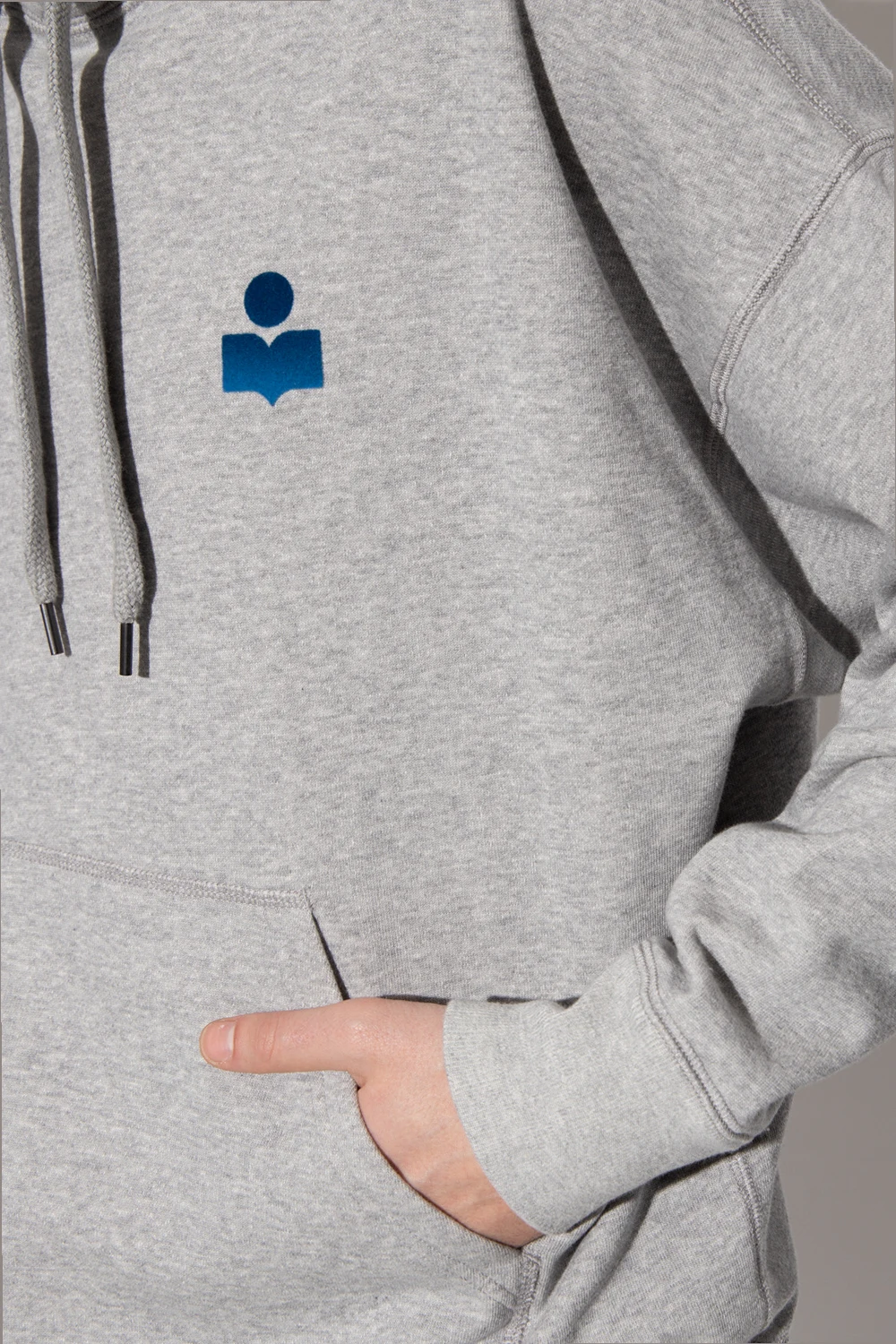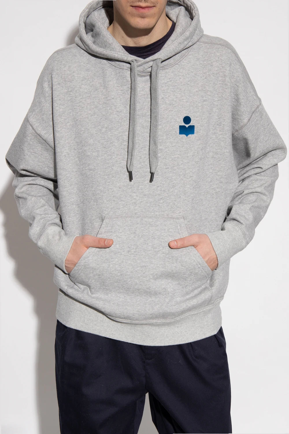 Grey ‘Malek’ hoodie from Isabel Marant. Made of cotton, this garment features a blue logo pattern with a velvet finish, drawstring hood, slip pocket and ribbed trims at the hem and cuffs.
