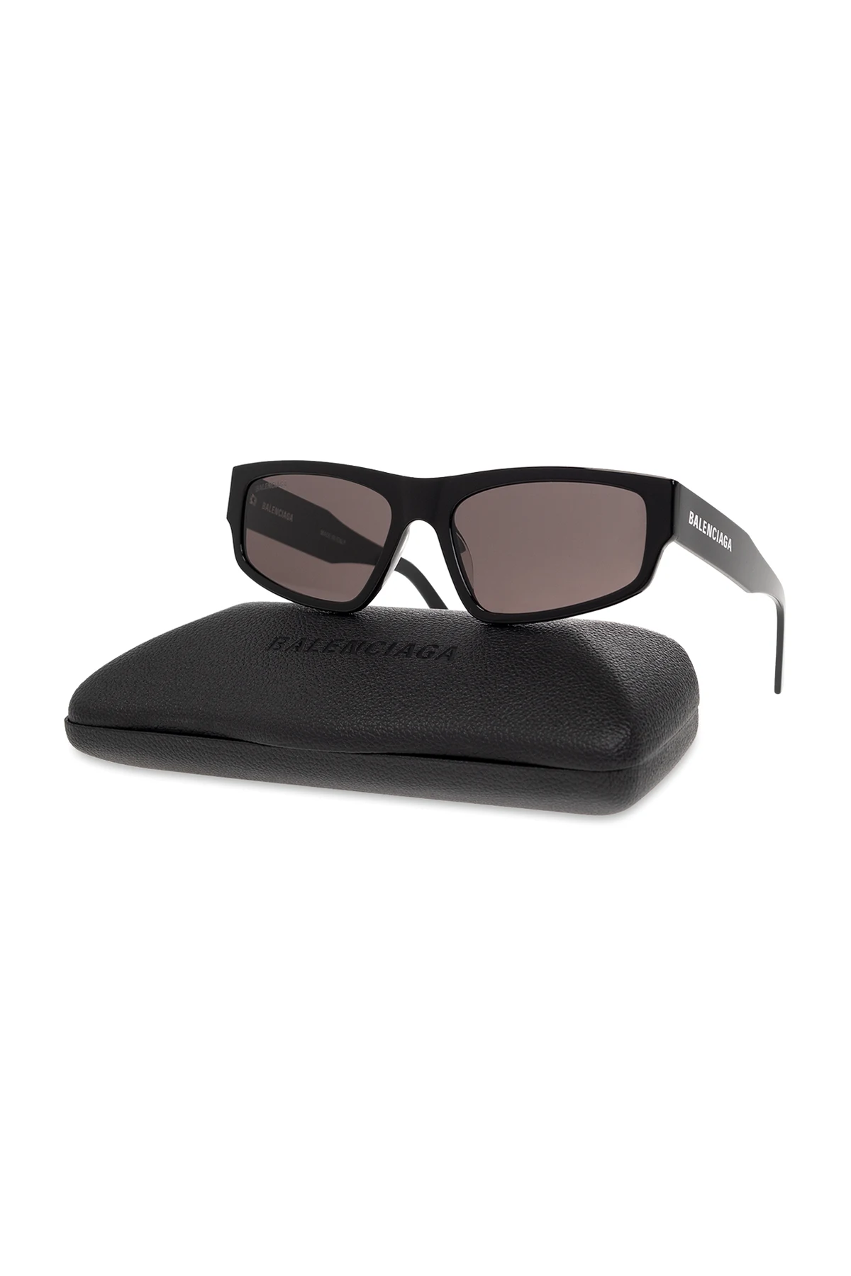 Black ‘Flat’ sunglasses from Balenciaga. This pair features a D-frame, white logo on the side and grey lenses with 100% UV protection. Case included.
