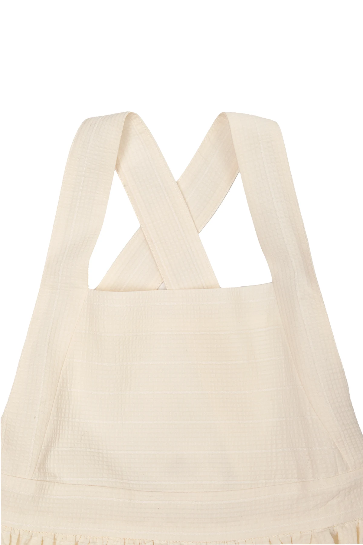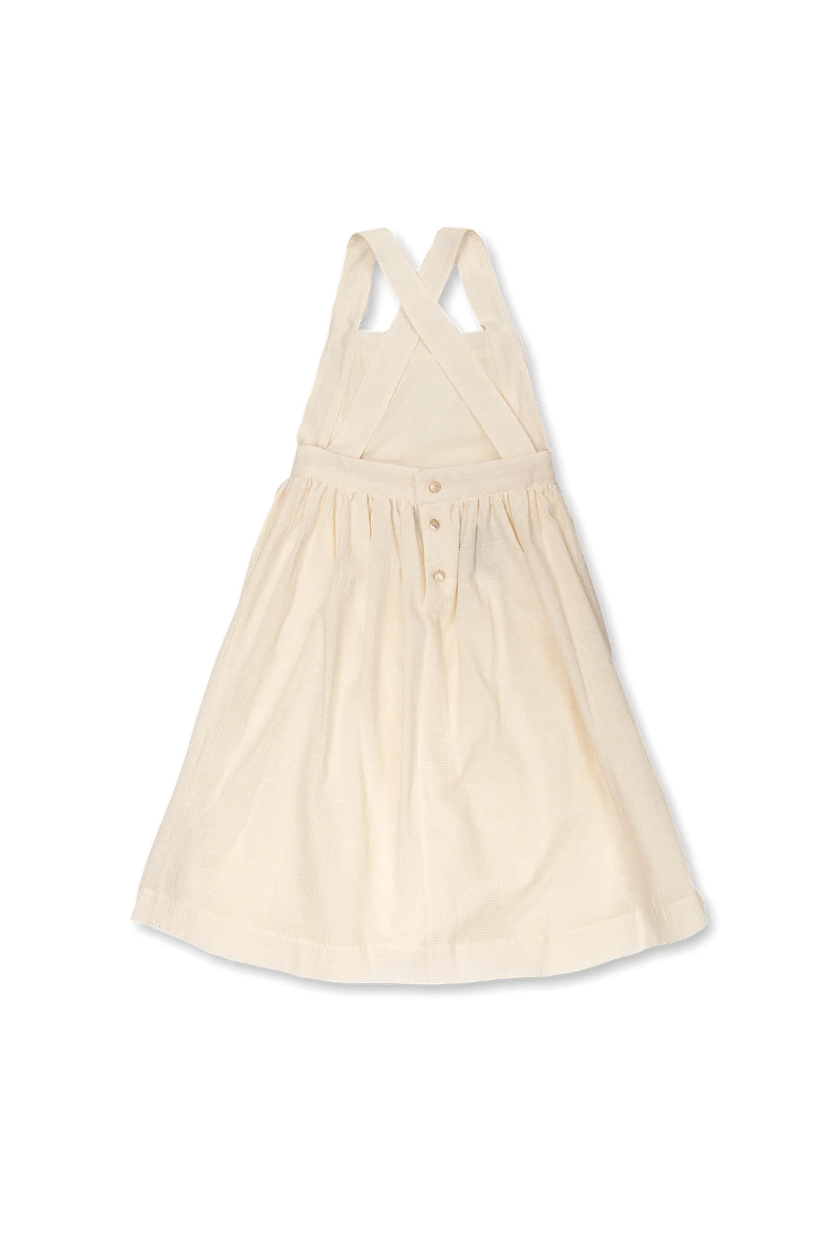 White ‘Gladys’ slip dress from Bonpoint. Made of textured cotton, this style showcases an attached tie belt with 3D flower applications and faux pearls, button fastenings and crisscross straps on the back, and a flared hem.