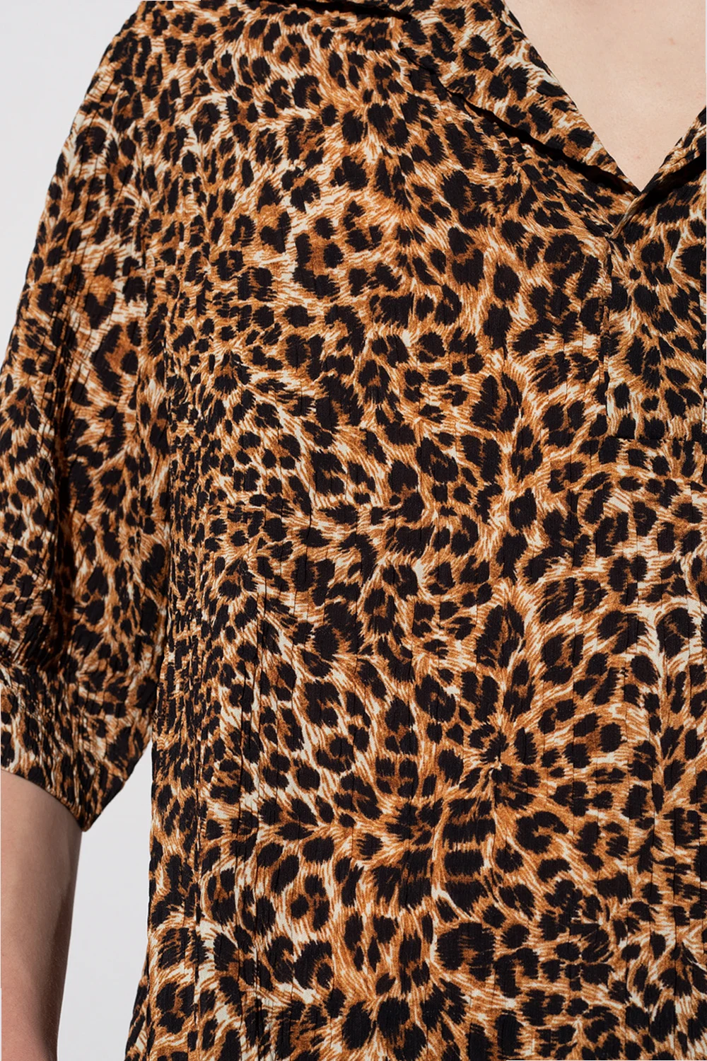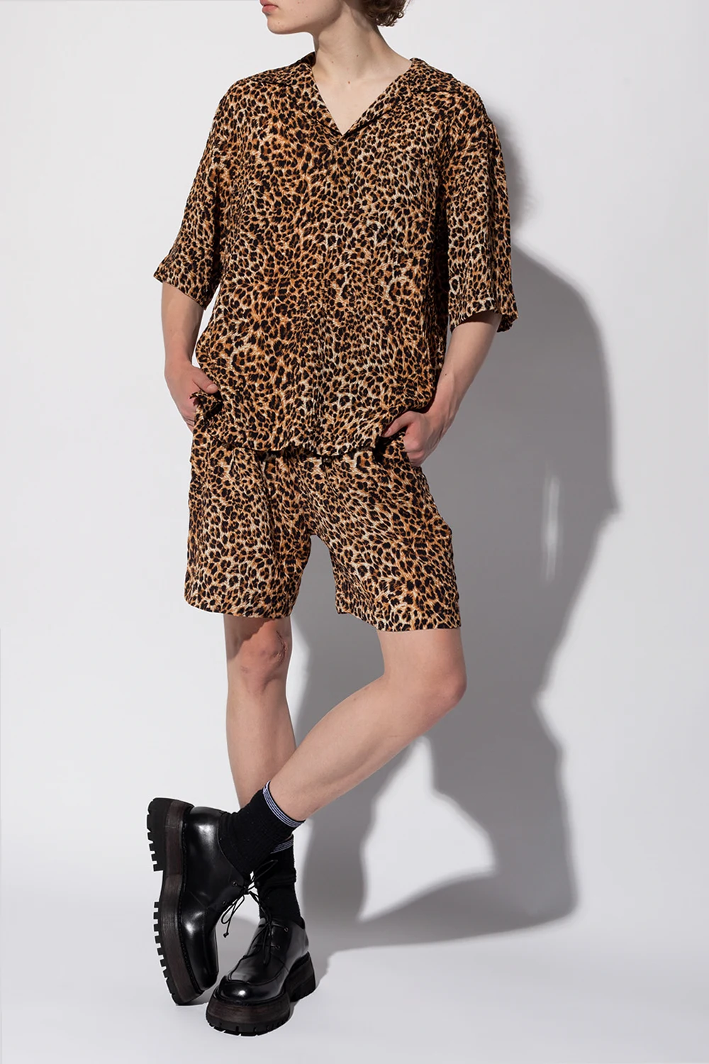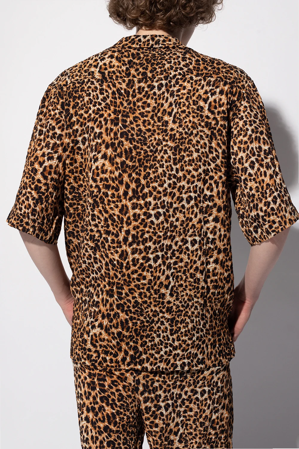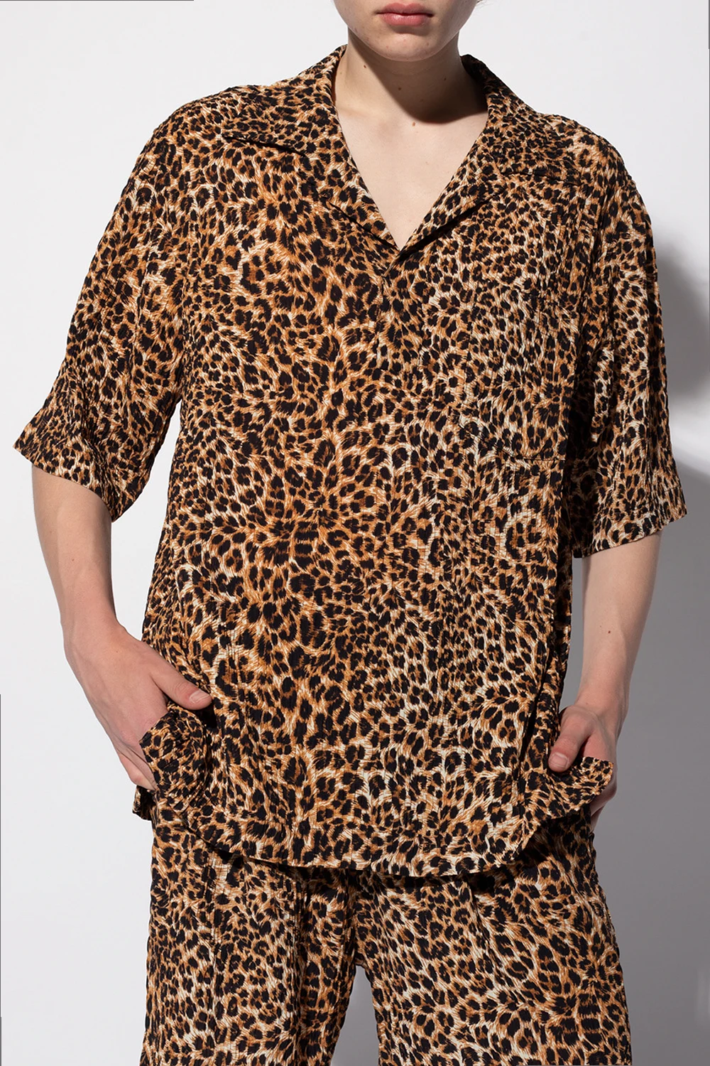 Black, brown and cream shirt from Nanushka. This short sleeve design features a leopard print, front pocket and side slits.