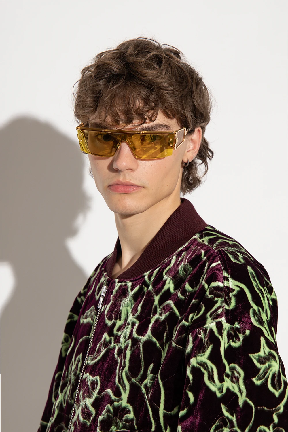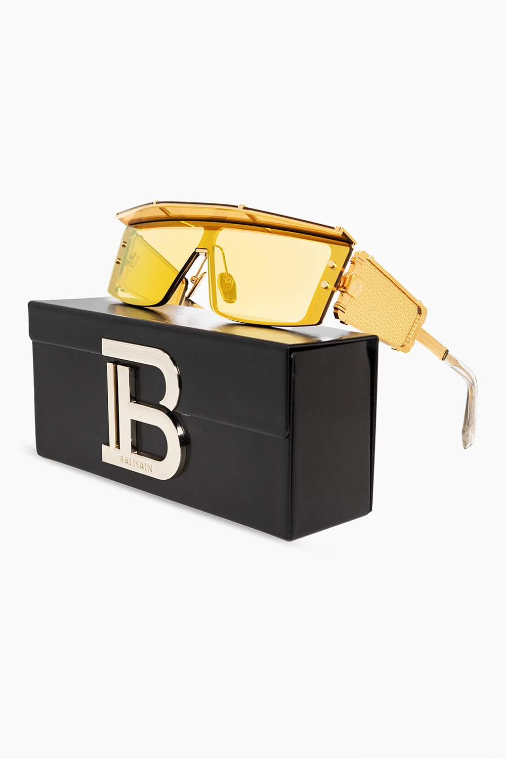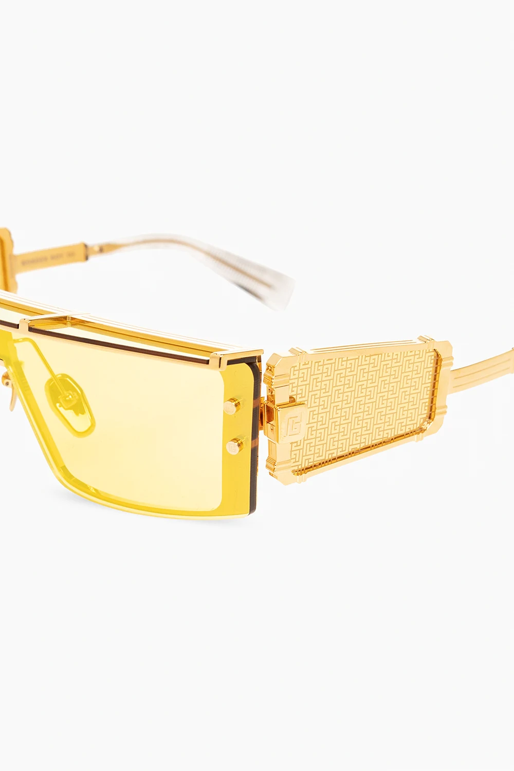 Gold-tone ‘Wonder Boy III’ sunglasses from Balmain. Made of titanium, this pair features a metal gold-tone visor, monogram pattern on the temples and yellow lenses with anti-reflective coating and 100% UV protection. Comes with a case.