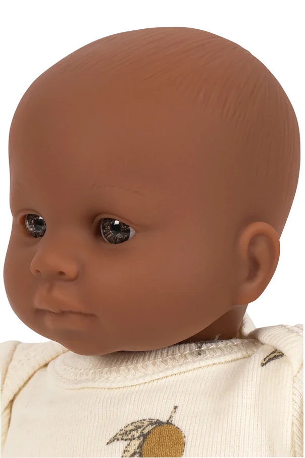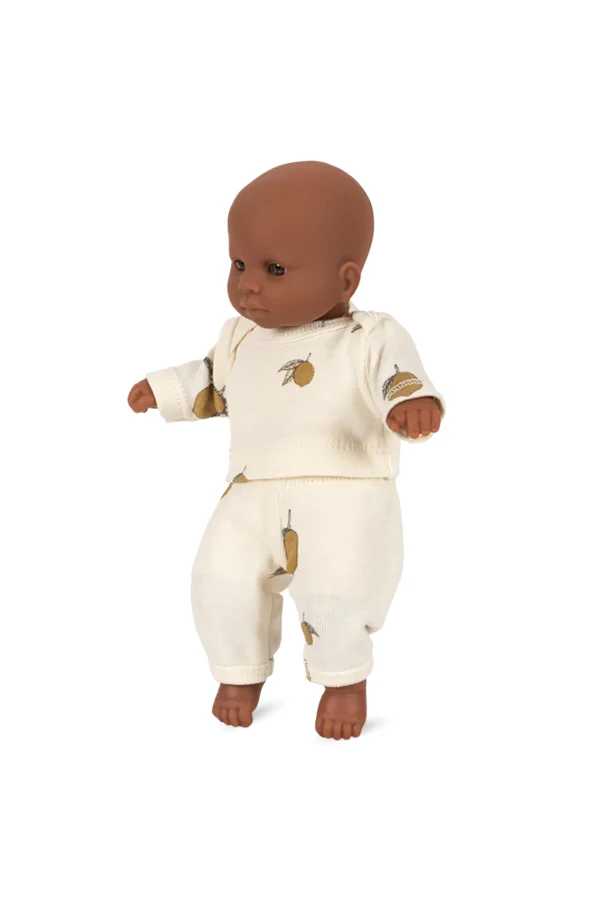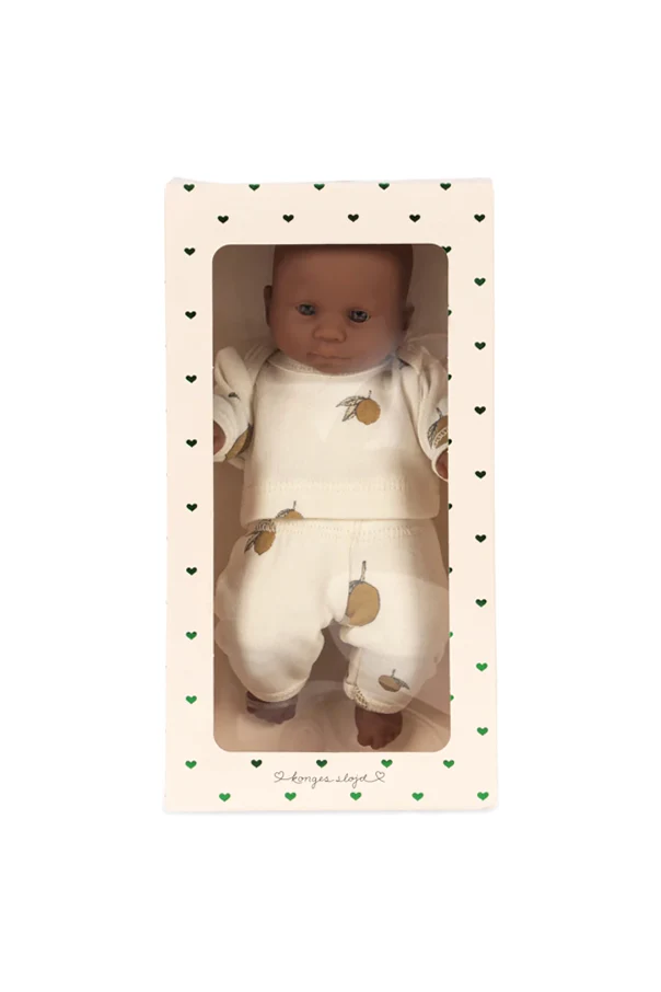 Introducing the exquisite Small Doll by Konges Sløjd, a refined expression of timeless childhood elegance. This classic infant-inspired doll, with beautifully realistic proportions, exudes charm in a creamy knit ensemble adorned with a subtle, repeating pear motif in gentle pastel tones. Delicately crafted from premium vinyl, cotton, and polyester, the doll’s lifelike head, arms, and legs are complemented by a soft, textile body offering both durability and comforting touch.