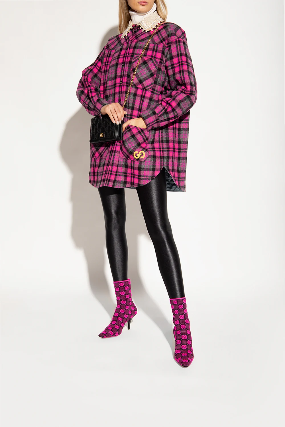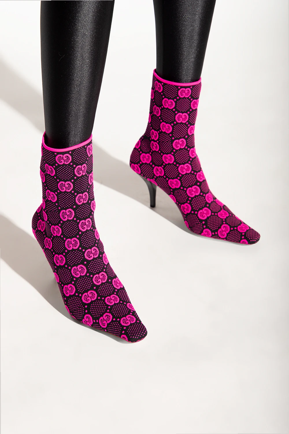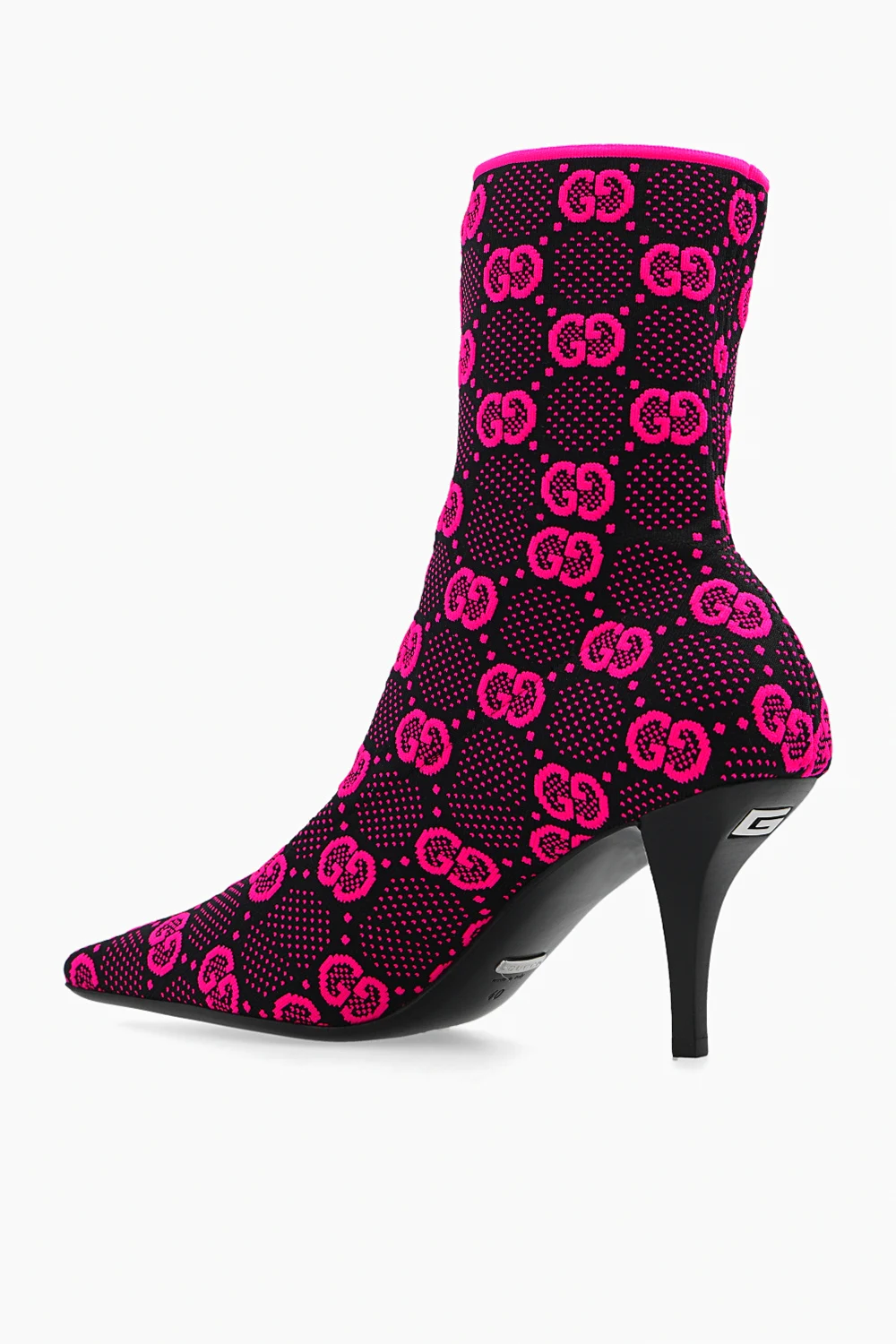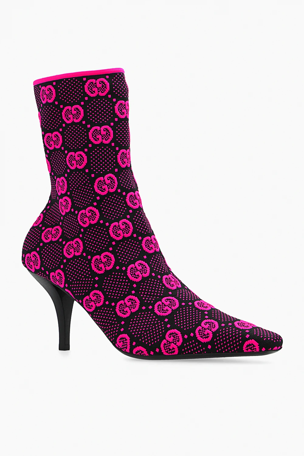 Black and neon pink heeled slip-on ankle boots from Gucci. Made of fabric with the jacquard GG monogram pattern, this slip-on pair features a square toe, silver-tone metal Square G appliqué and black leather sole.