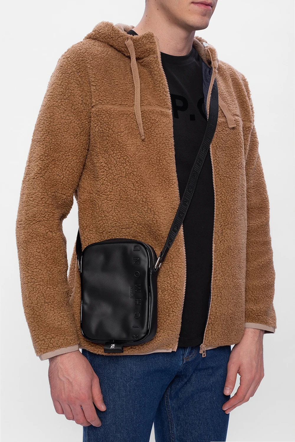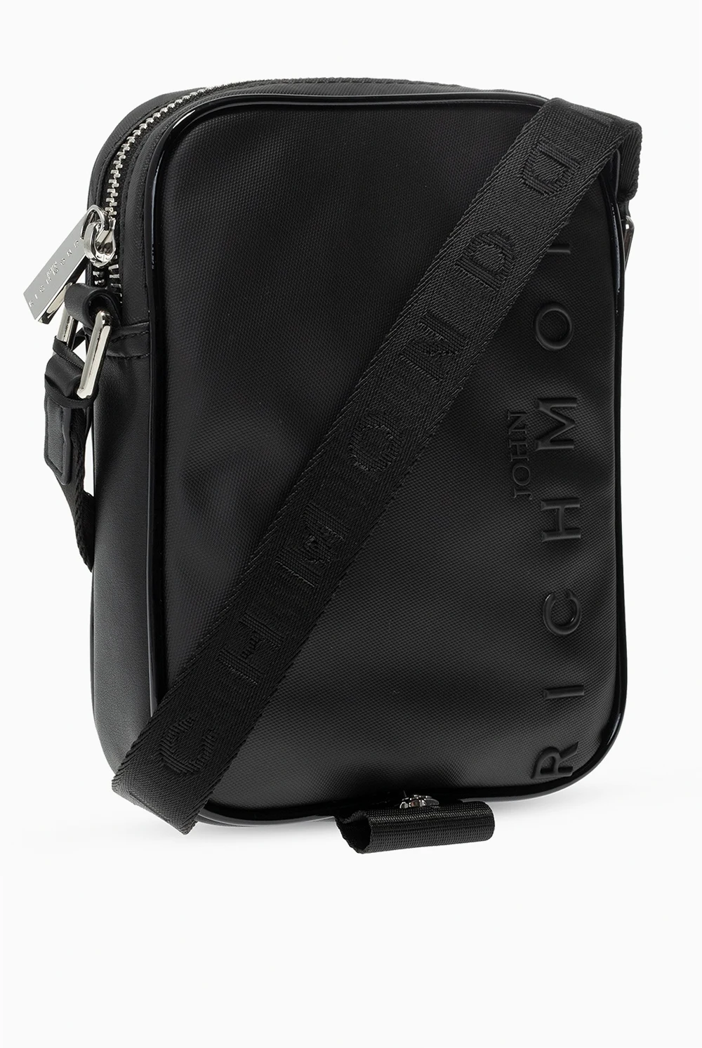 Black shoulder bag from John Richmond. Fastened with a zip, this item features a raised logo detail, front slip pocket, adjustable shoulder strap and one internal compartment with one slip pocket.