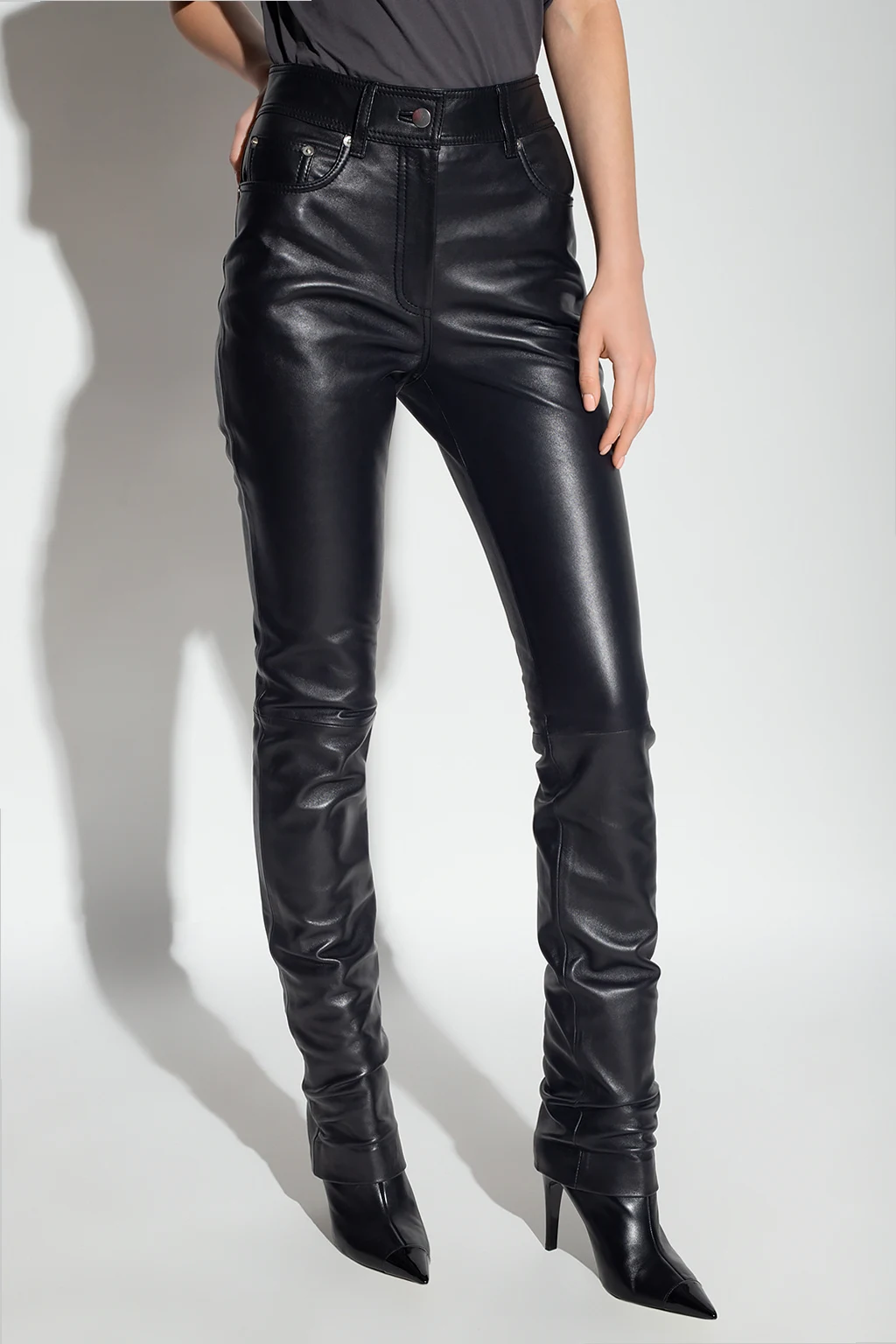 Black ‘Rebecca’ trousers from Stand Studio. Crafted from lamb leather, this model is complete with a zip and button closure, three front pockets, two back pockets and straight legs.