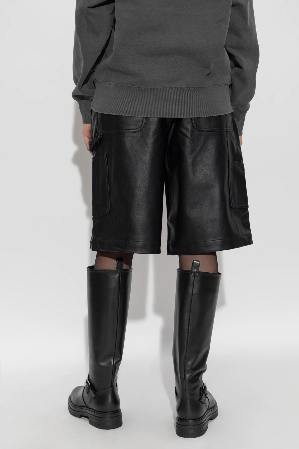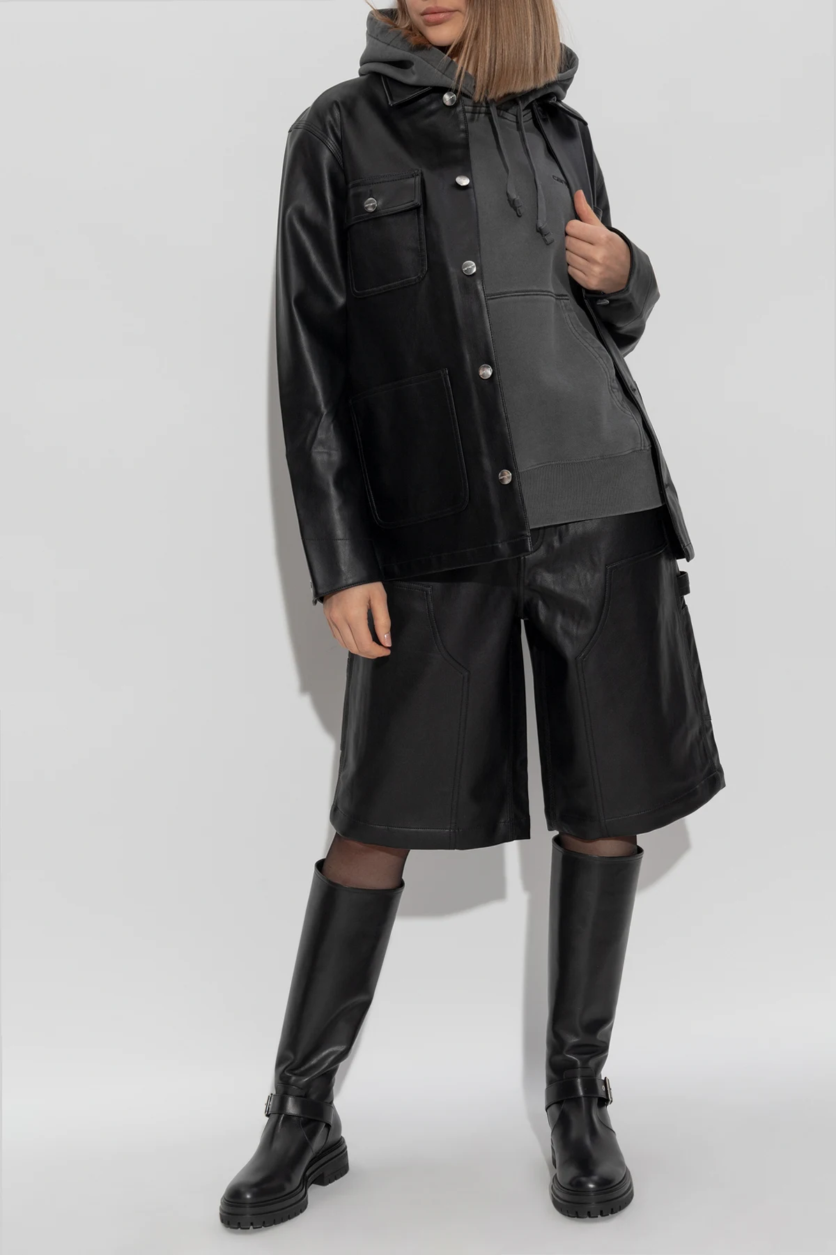 Introducing the Eco Leather Shorts by Carhartt WIP, a paragon of elegance and contemporary design. These shorts, resplendent in classic black, are meticulously crafted from eco leather, imbuing them with a sophisticated and refined allure. The longer cut, gracefully reaching the knees, exudes a modern edge that is both stylish and versatile. Thoughtfully designed, these shorts feature wide, functional pockets that provide practical utility for daily endeavors. The exquisite stitching highlights their structure, adding a touch of sartorial finesse. Styled with long black boots and a jacket, these shorts effortlessly transition from casual to chic, making them an indispensable addition to any wardrobe. Embrace the perfect fusion of elegance and modernity with this exclusive piece. Why Choose This Product? Crafted from eco-friendly materials for a sustainable choice. Timeless black hue complements any ensemble. Functional and stylish with ample pocket space. Designed by Carhartt WIP, a leader in innovative fashion. Secure zip and snap closure for a polished finish.