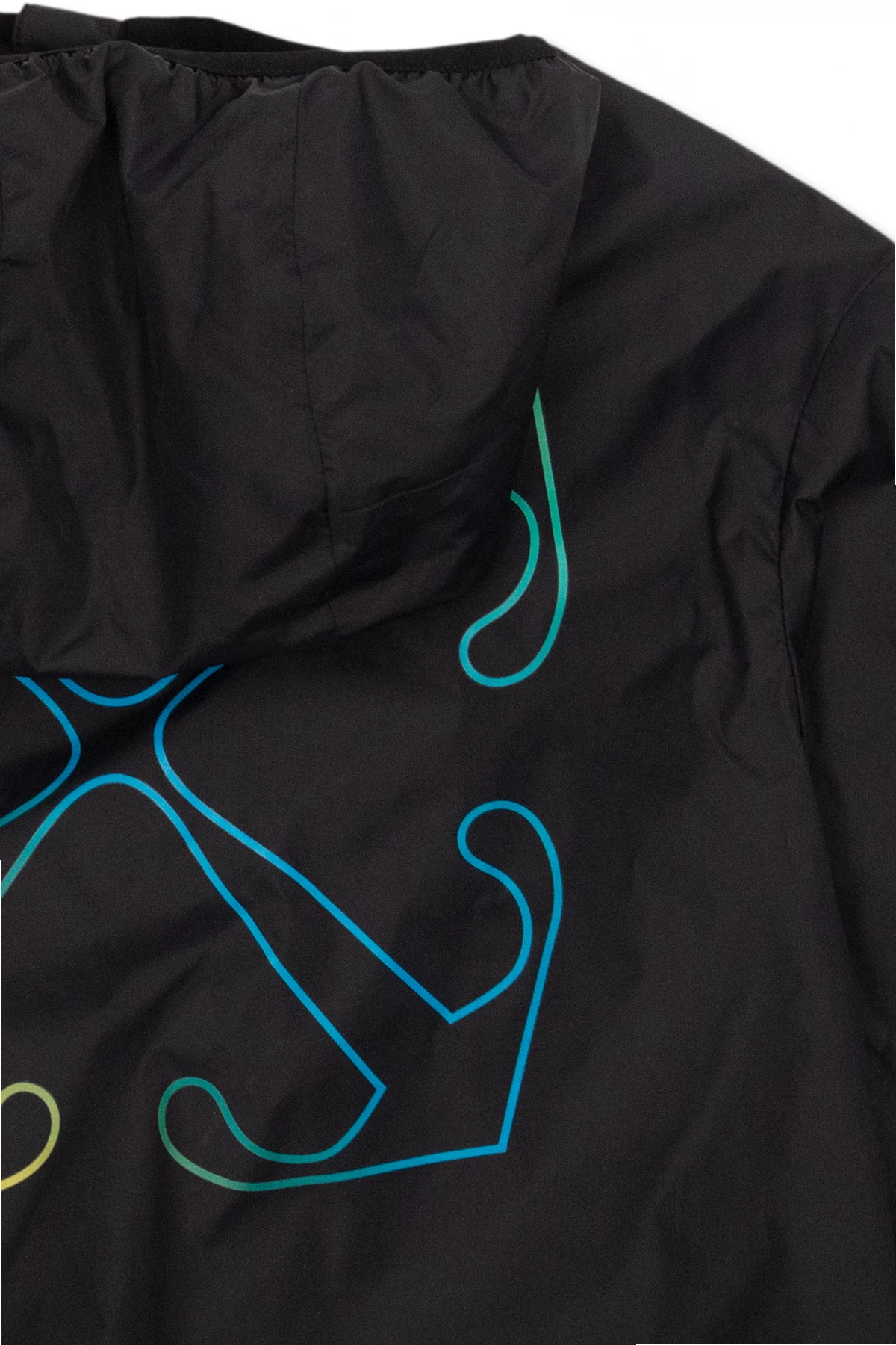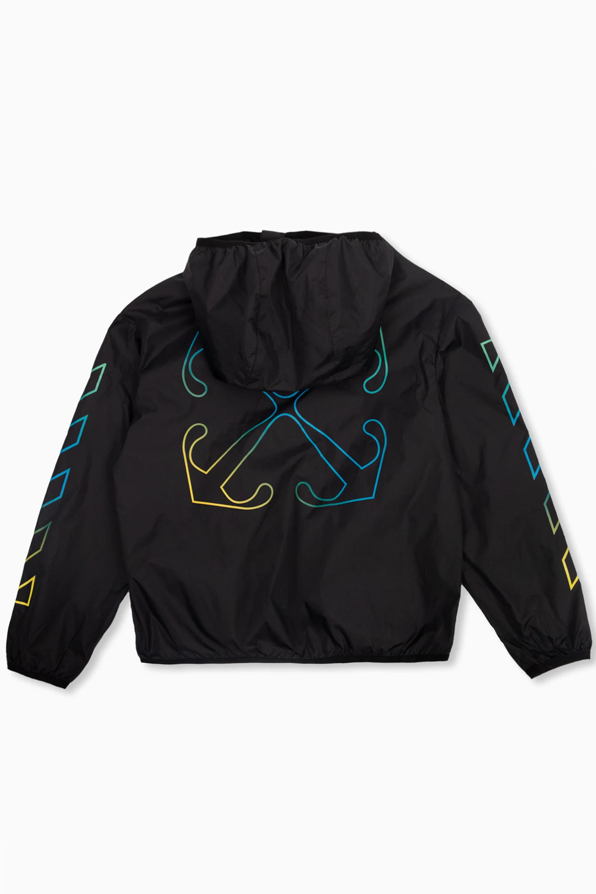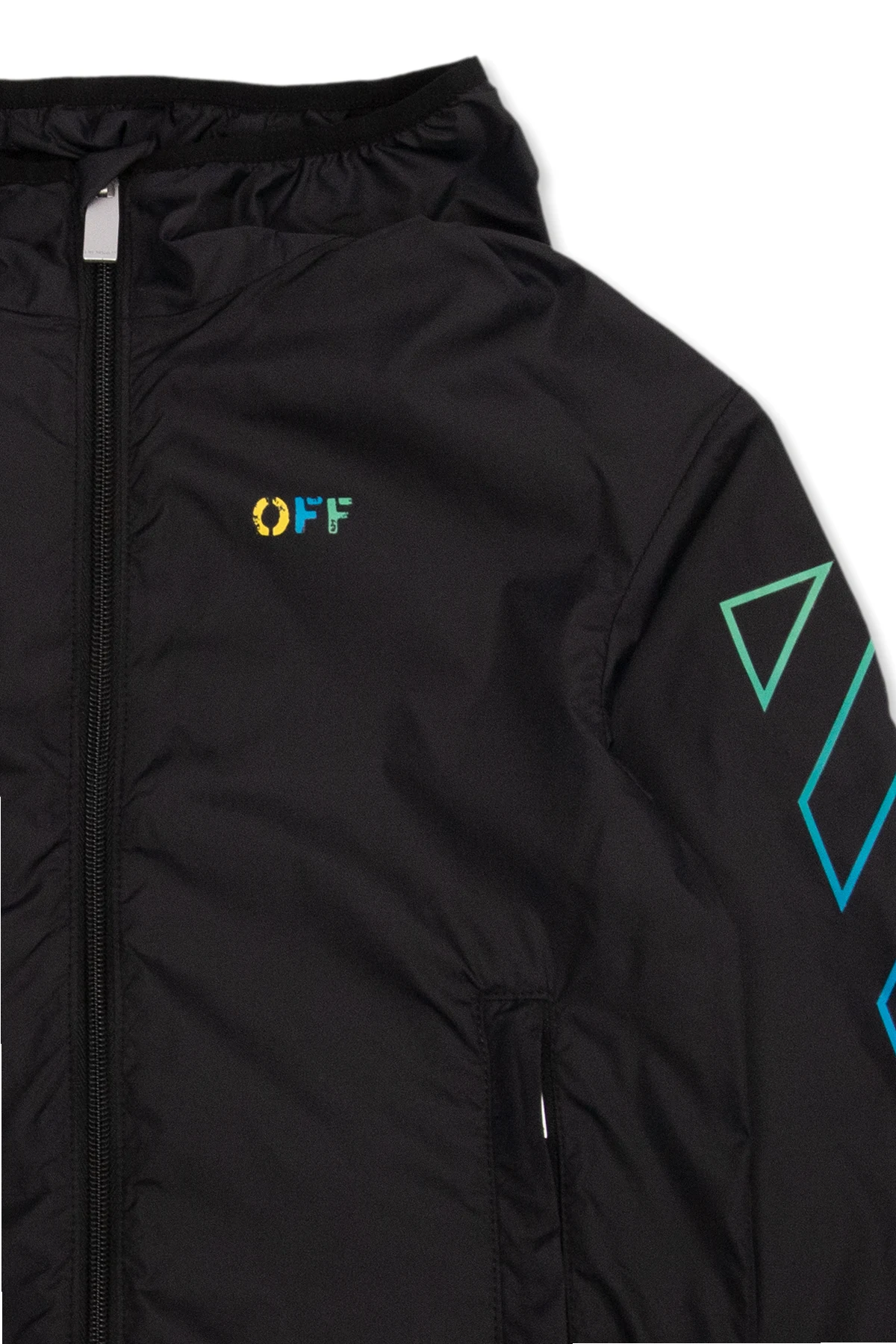 Black hooded track jacket from Off-White Kids. Fastened with a zip, this garment features a yellow, green and blue logo print, two zipped front pockets and ribbed trims at the hem and cuffs.