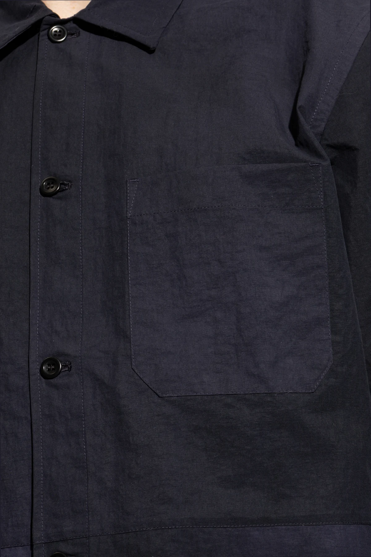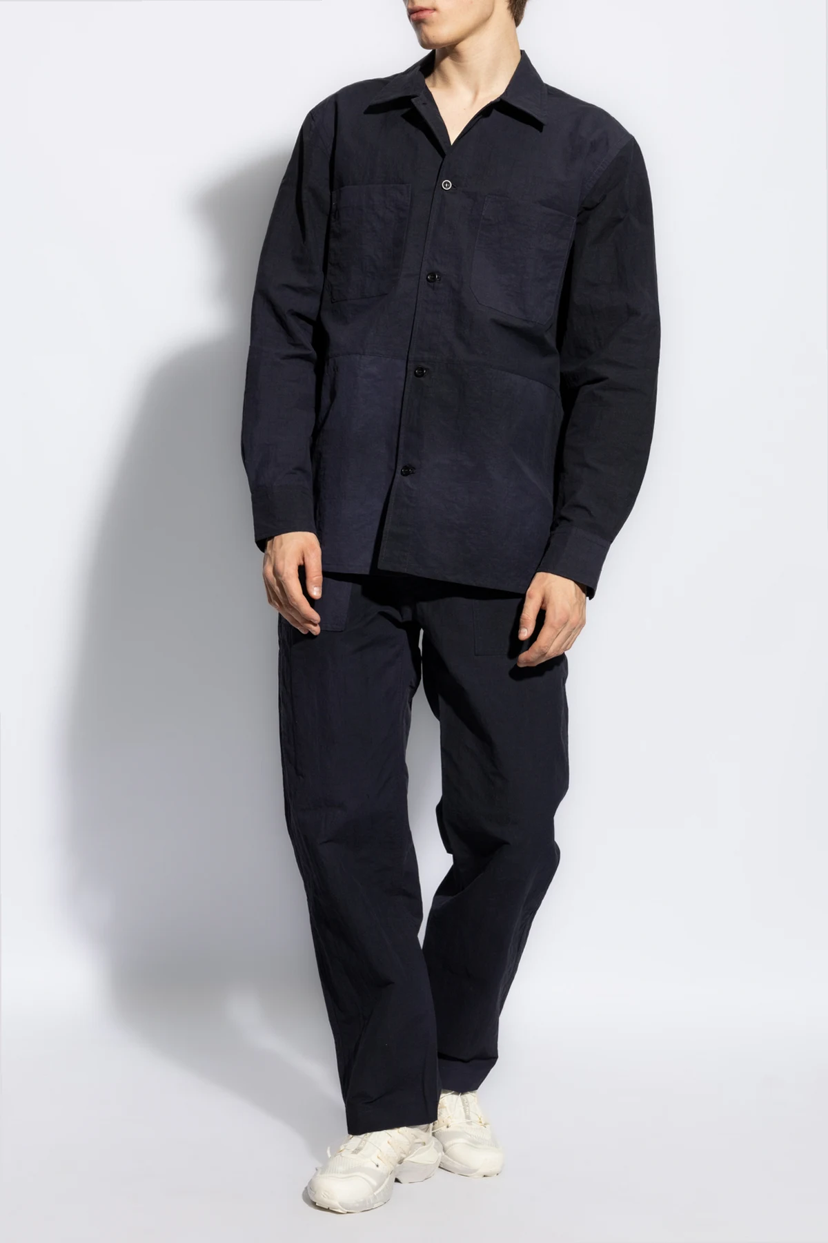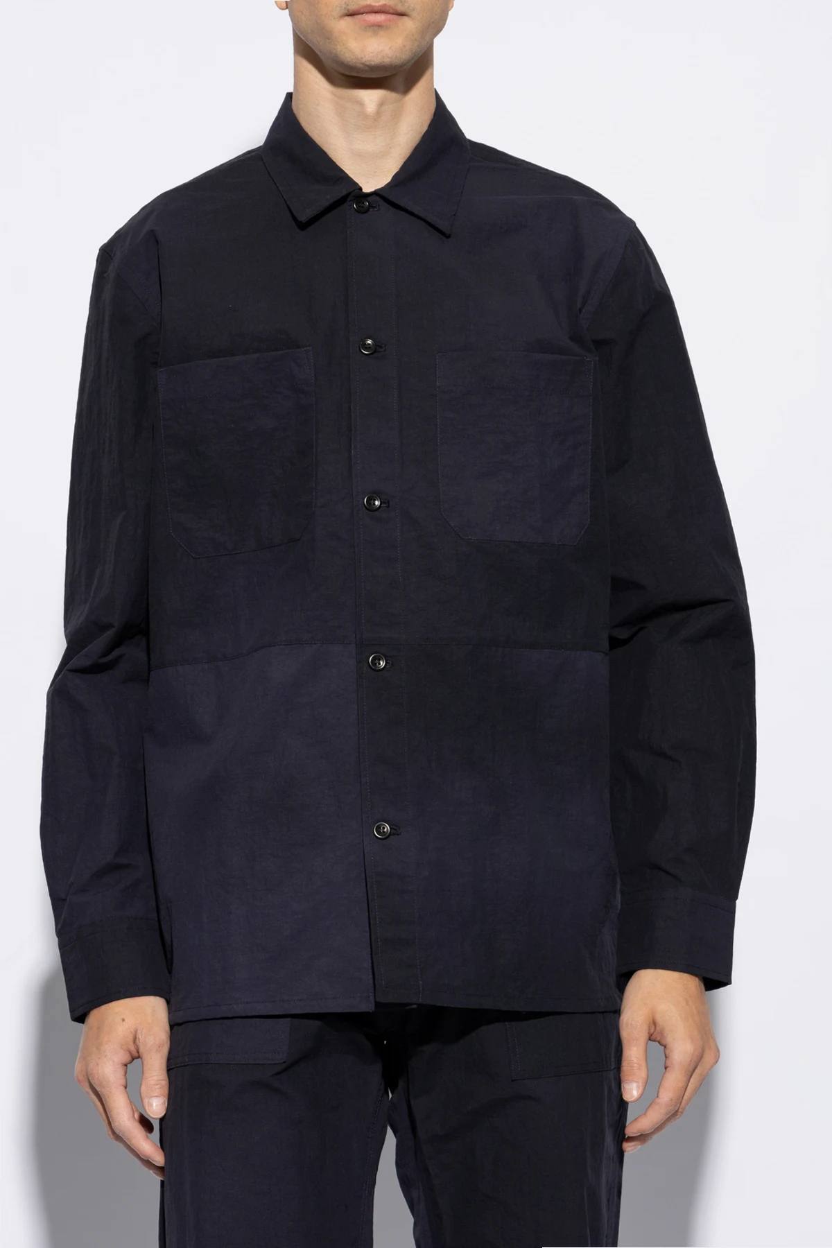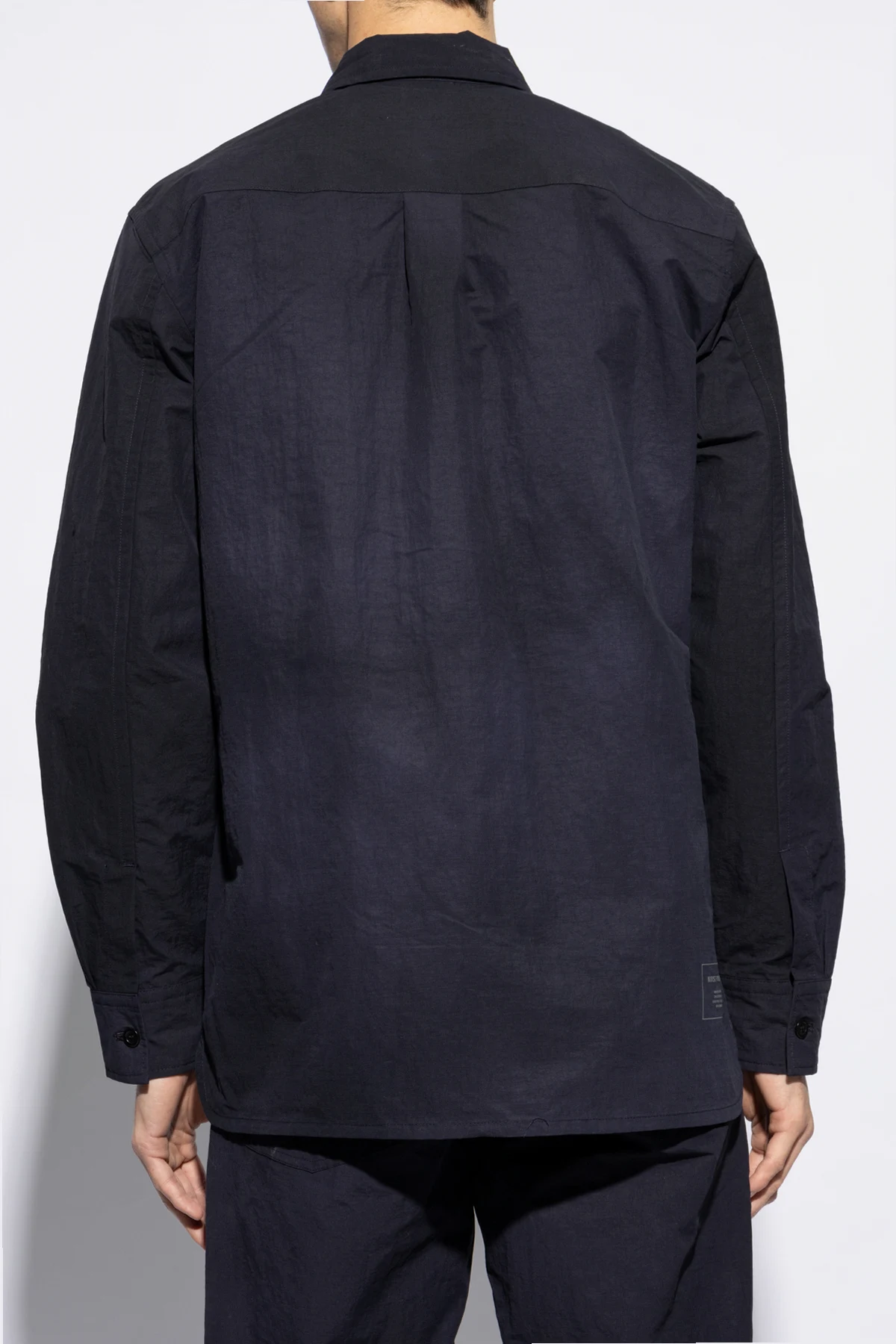 Introducing the Ulrik Shirt by Norse Projects, a quintessence of timeless elegance and casual sophistication. Crafted from 100% Nylon, this navy piece combines durability with a soft, matte finish, ensuring both comfort and a high-quality feel. The Ulrik features a classic, straight cut with long sleeves and a Kent collar, presenting a silhouette that\'s both refined and versatile. The shirt\'s front closure is adorned with dark buttons that seamlessly blend into the fabric, maintaining the garment\'s sleek and understated aesthetic. Two symmetrical, flat chest pockets without flaps contribute to the minimalist design, enhancing the shirt\'s functionality without compromising its elegant simplicity. The inclusion of subtle darts on the back ensures a flattering fit, meticulously tailored to complement the wearer\'s physique. Displayed in various perspectives, the Ulrik Shirt is showcased in its entirety—on a flat surface, worn by a model from the front, and viewed from the back, providing a comprehensive look at its casual yet elegant style. The absence of prints or patterns underscores the shirt\'s refined versatility, making it an exemplary addition to the discerning gentleman\'s wardrobe. Why Purchase the Ulrik Shirt? Exquisite Material: 100% Nylon fabric offers durability and a luxurious matte finish. Timeless Design: Classic cut with meticulous attention to detail, including integrated dark buttons and seamless pockets. Versatile Elegance: Perfect for both casual and sophisticated settings, embodying the essence of high-end casual wear. Flattering Fit: Tailored with subtle back darts for an enhanced silhouette.