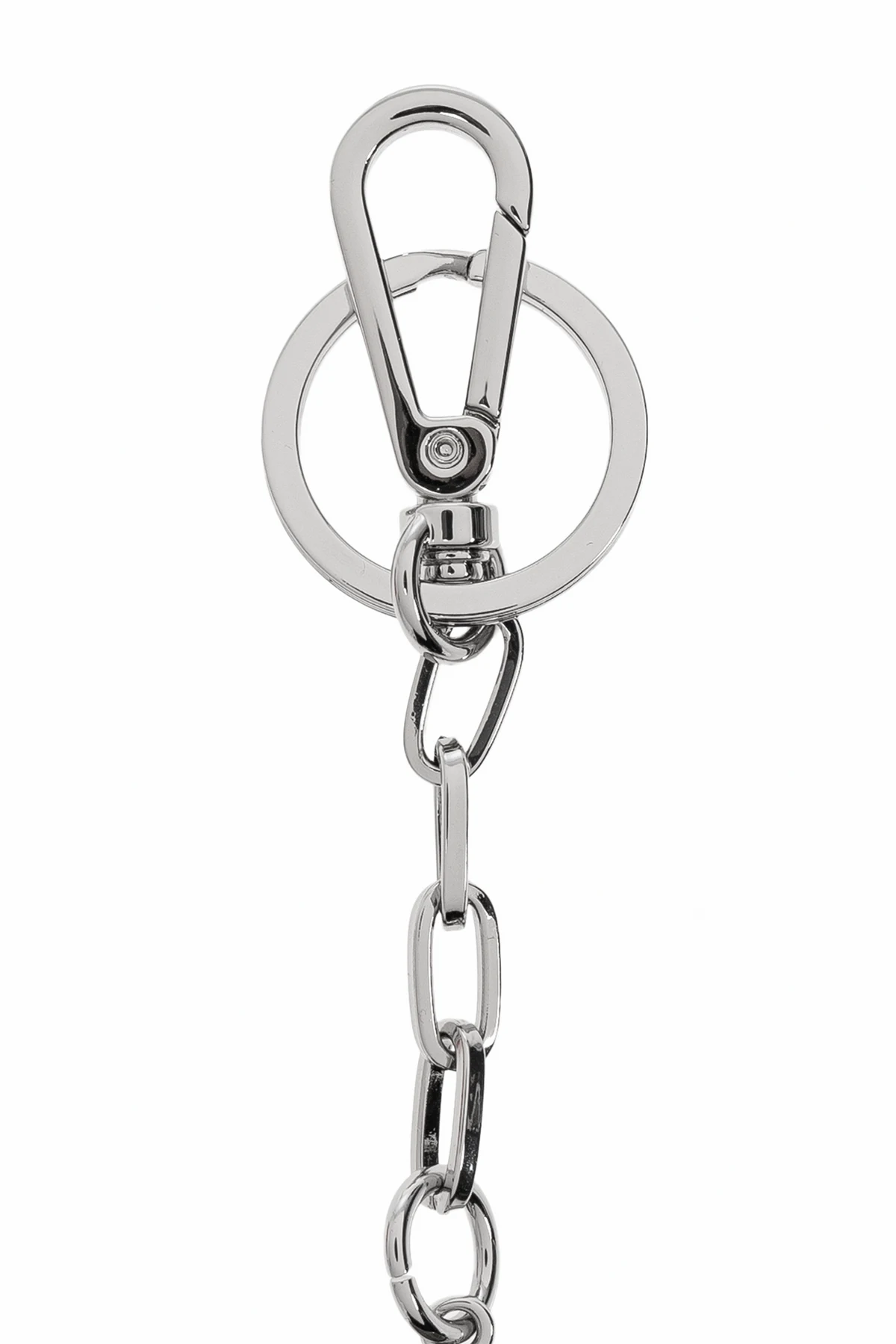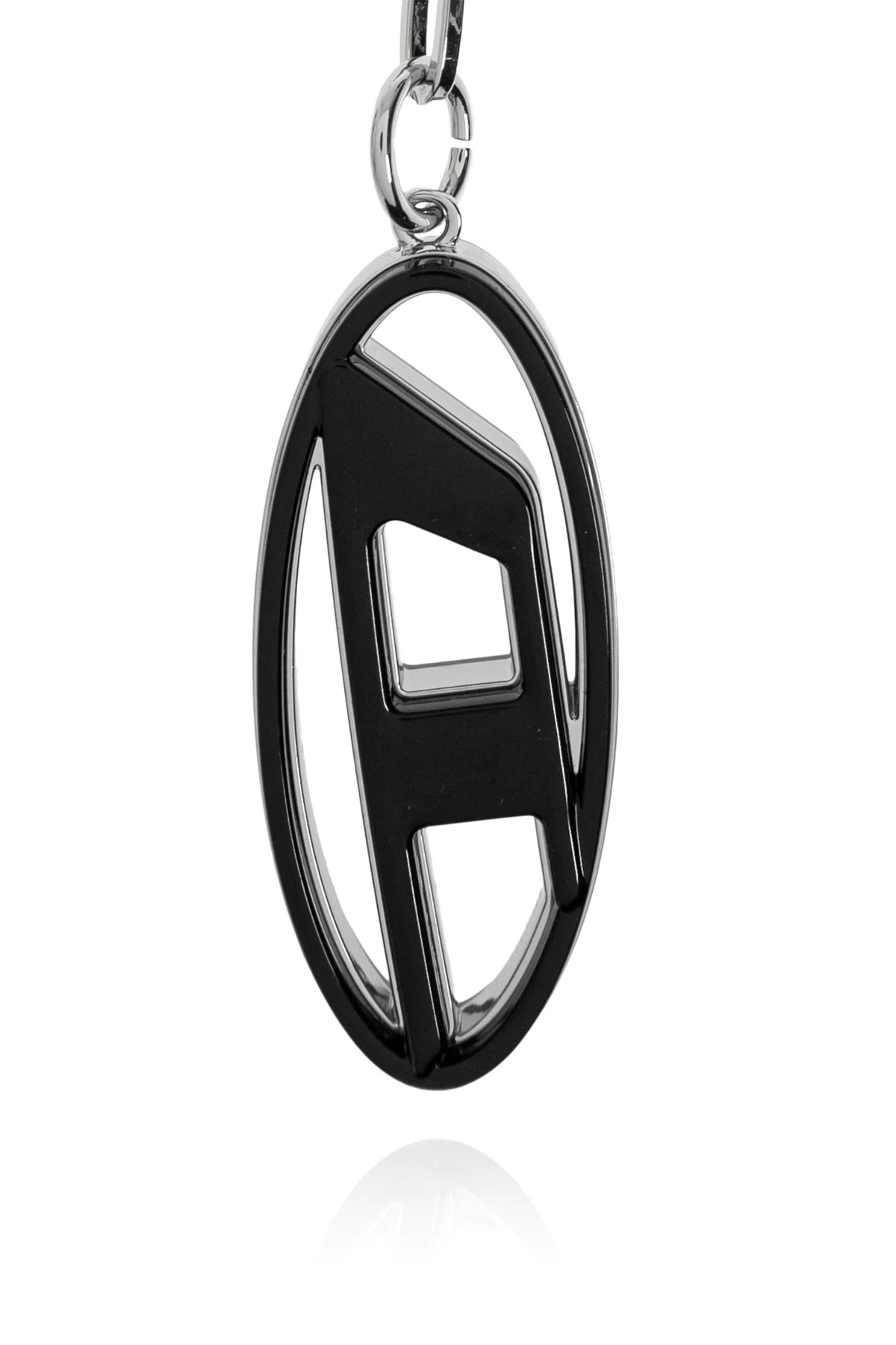 Introducing the HARMS CAGE-D LAYER keychain by the illustrious designer Diesel. This exquisite accessory is a testament to modern elegance and sophistication. The keychain features a striking contrast of silver and green hues, accentuated by silver elements that bestow a sense of luxury. The centerpiece of this piece is an oval charm adorned with a cut-out pattern reminiscent of a symbol, elegantly set against a black background that contrasts beautifully with its light, metallic frame. The charm is connected through a simple, yet chic, metal chain, infusing the piece with an industrial flair. Completing the design, a metal carabiner and ring ensure effortless attachment to keys or bags. Crafted from high-quality zinc and iron, this keychain epitomizes Diesel\'s commitment to premium craftsmanship and design excellence. Why Choose This Product? Luxurious and modern design High-quality materials for durability Easy attachment with metal carabiner and ring Crafted by the renowned Diesel brand Perfect blend of elegance and industrial style