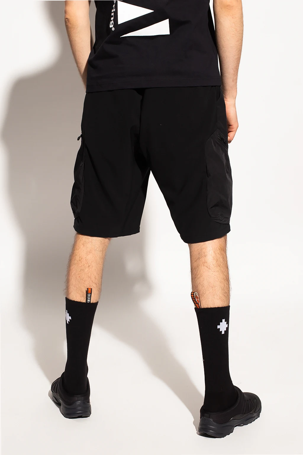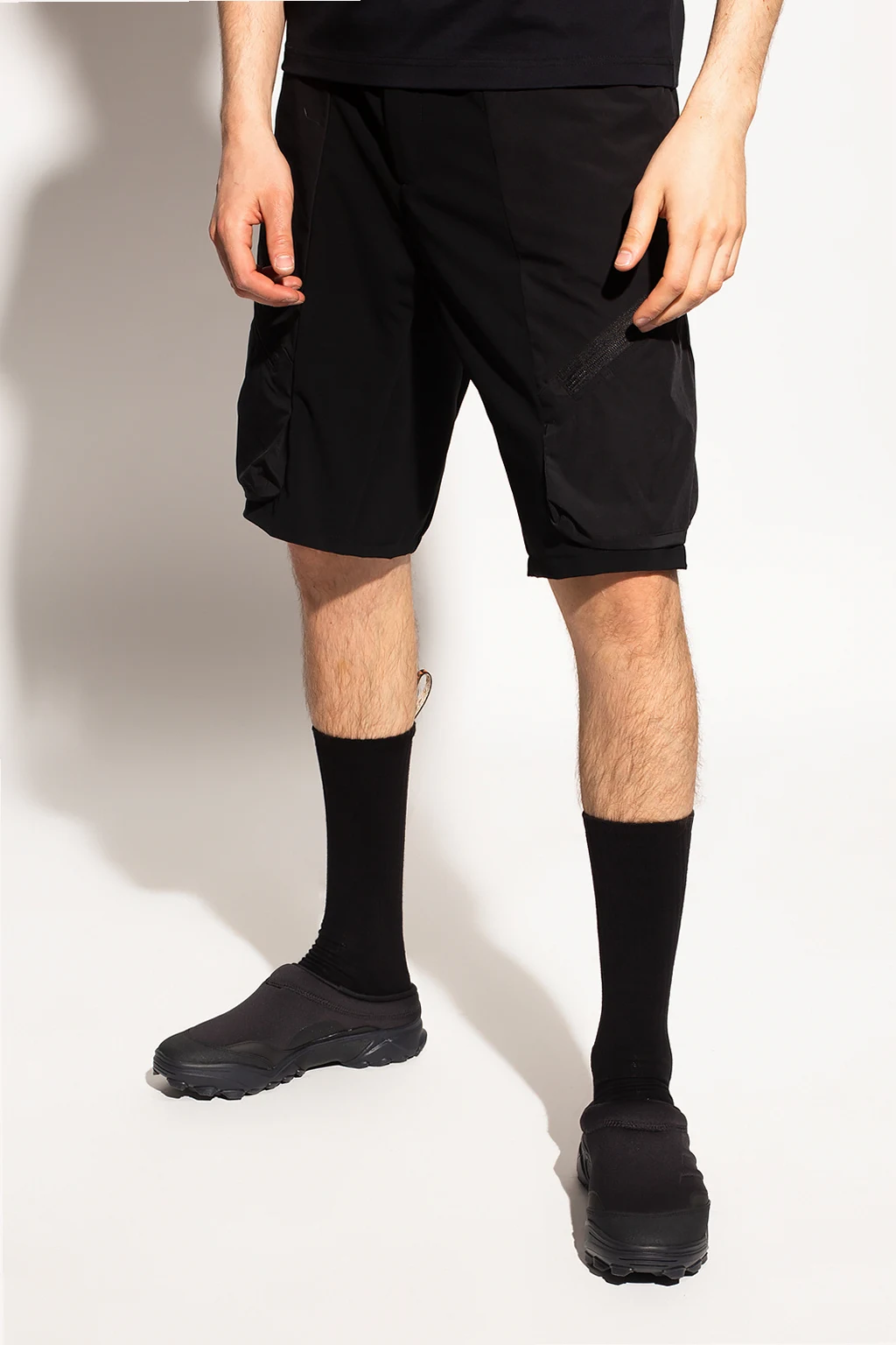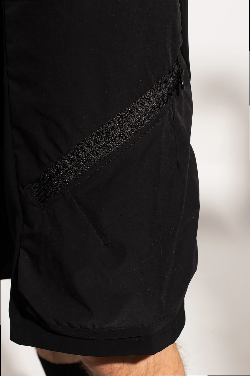 Black shorts from White Mountaineering. Fastened with a zip, snap and a magnetic Fiolock closure, this design is complete with two slip pockets and two zip pockets on the front as well as two zip pockets at the back.