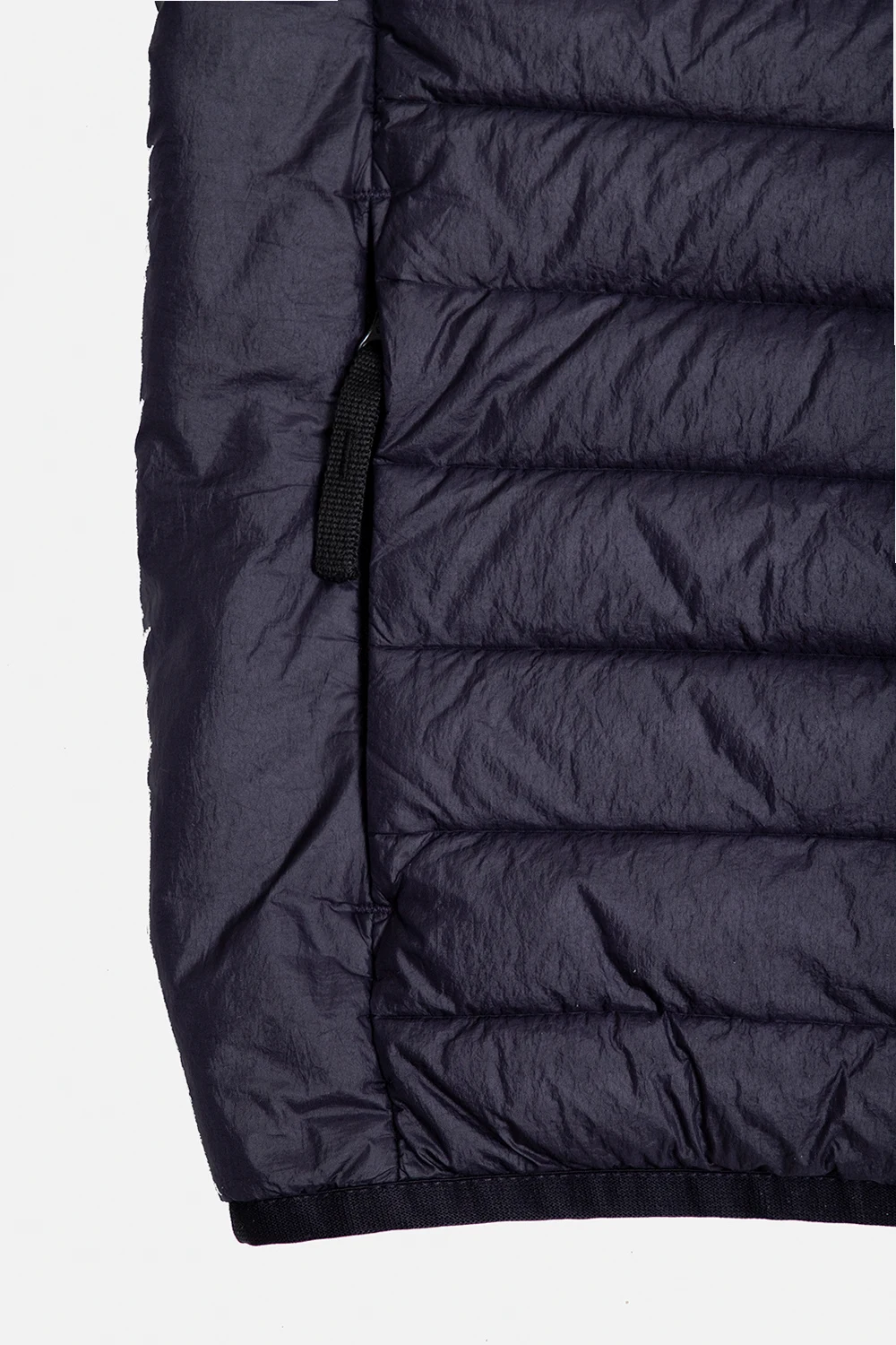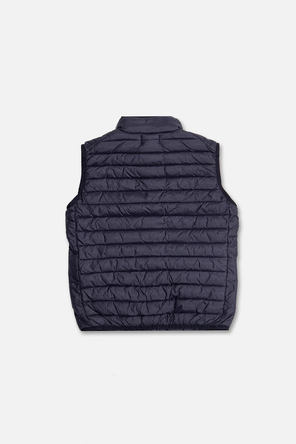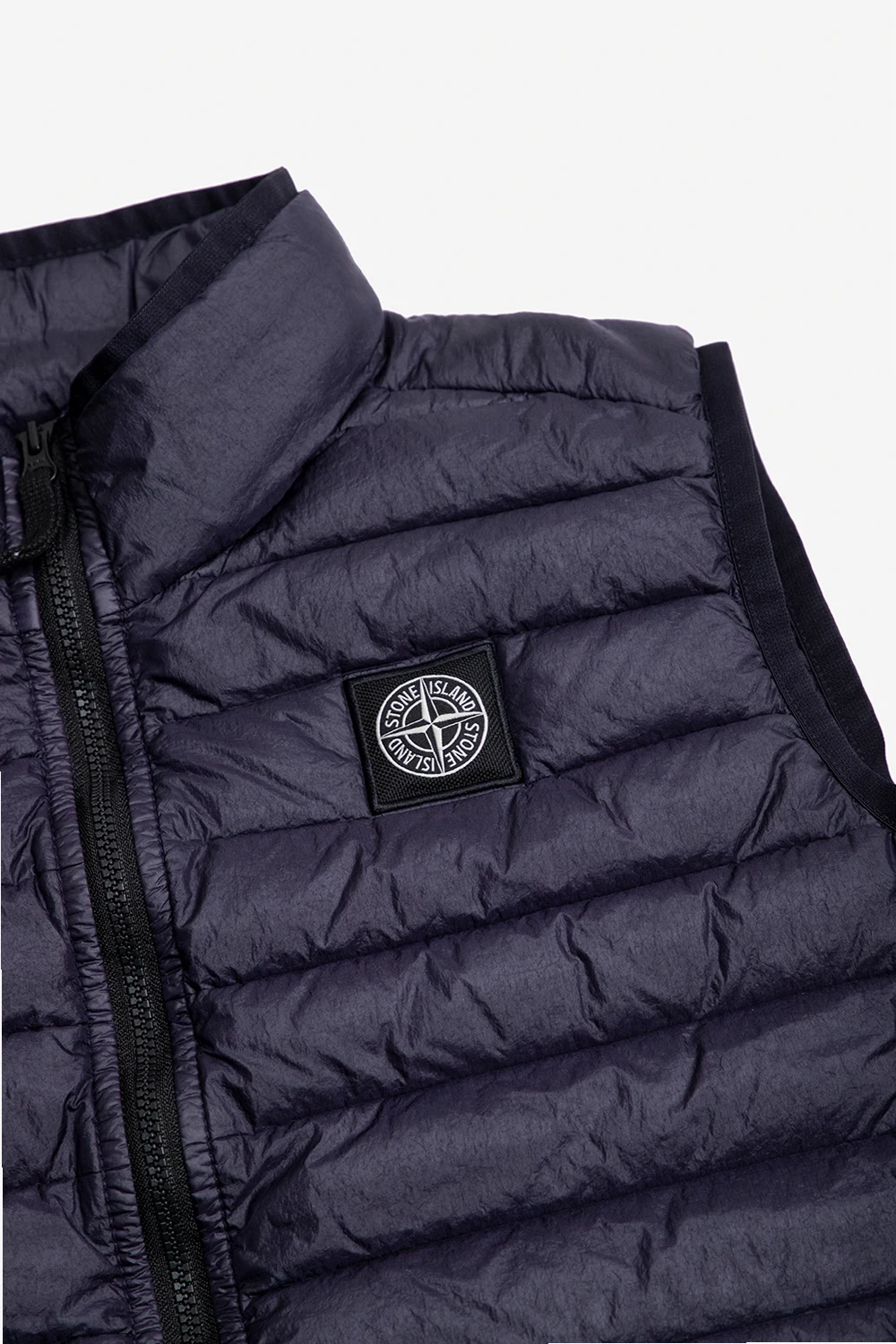 Navy blue quilted jacket from Stone Island Kids. Emblazoned with a white and black logo patch, this style features a zip fastening, two zip pockets and an elasticated trim.