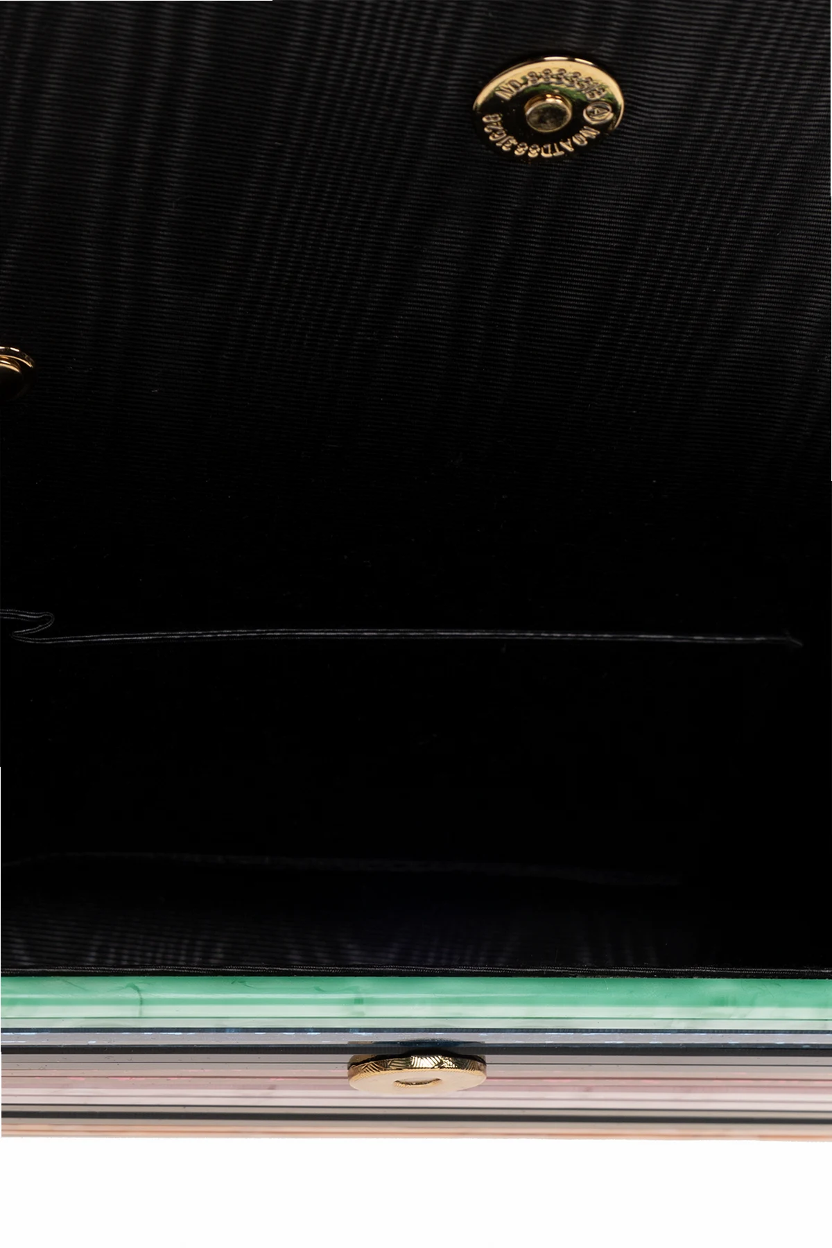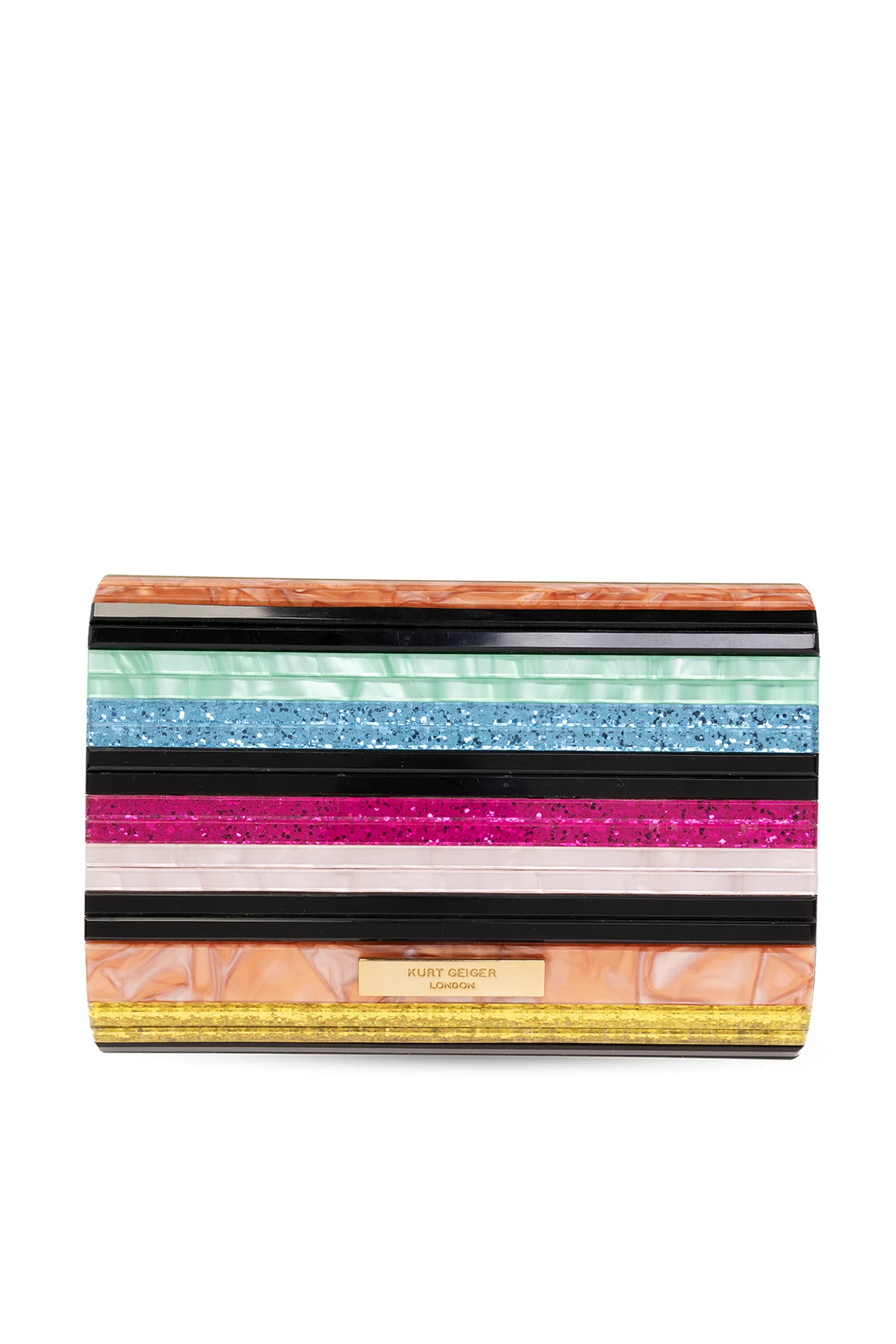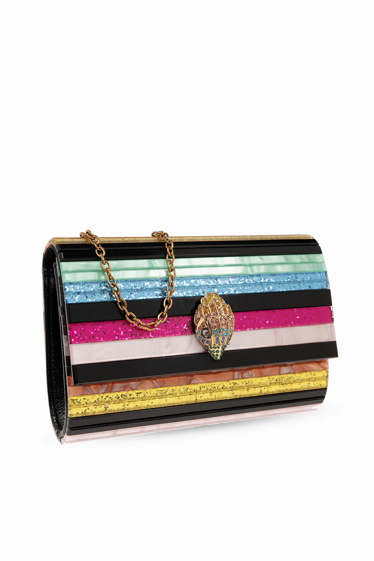 Multicolored ‘Party Eagle’ shoulder bag from Kurt Gaiger. Made of panels with a marble effect and glitter, this model features a magnetic snap closure, logo, the brand’s signature eagle head embellished with multicolored crystals, shoulder chain, gold-tone metal hardware and one internal compartment with one slip pocket.
