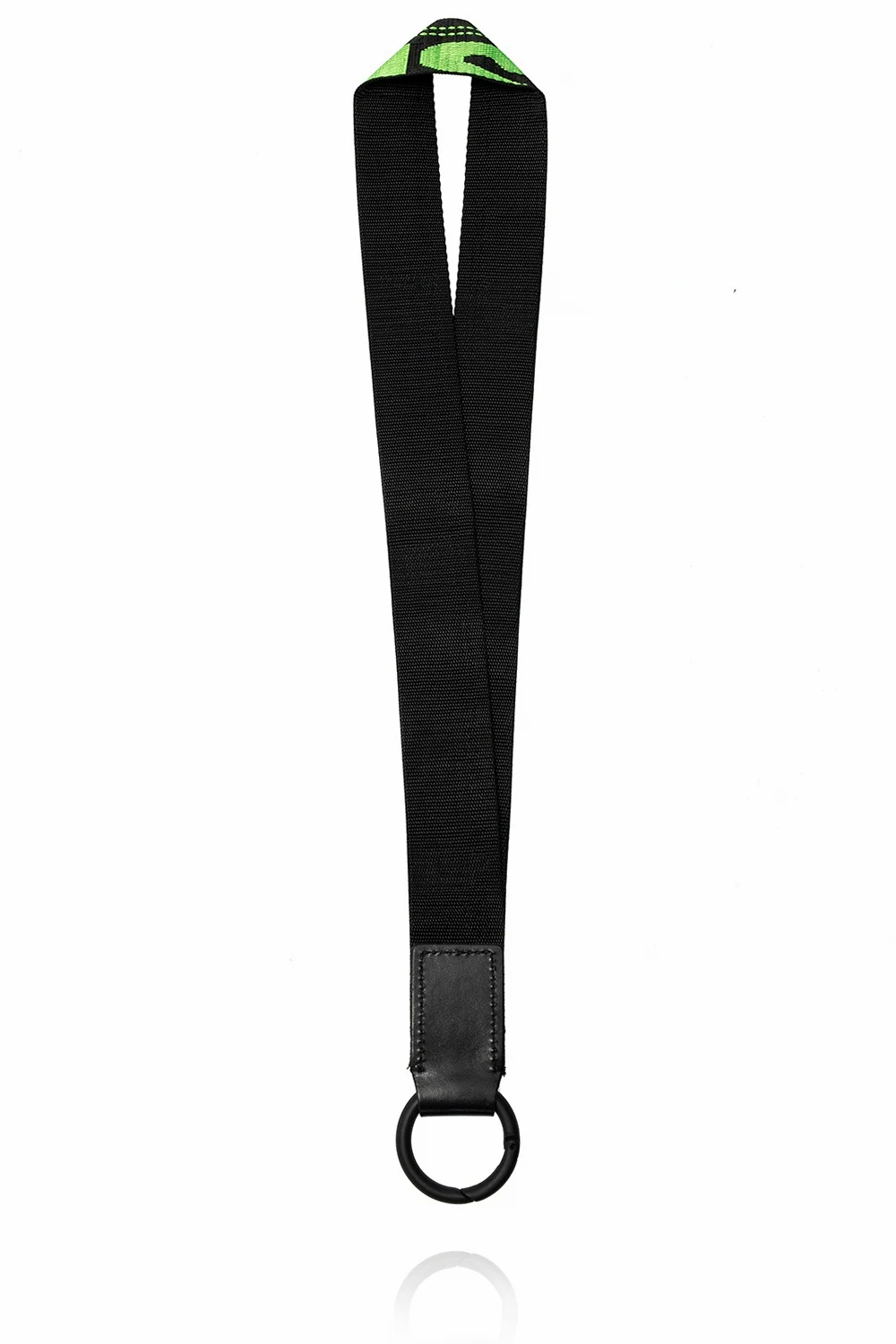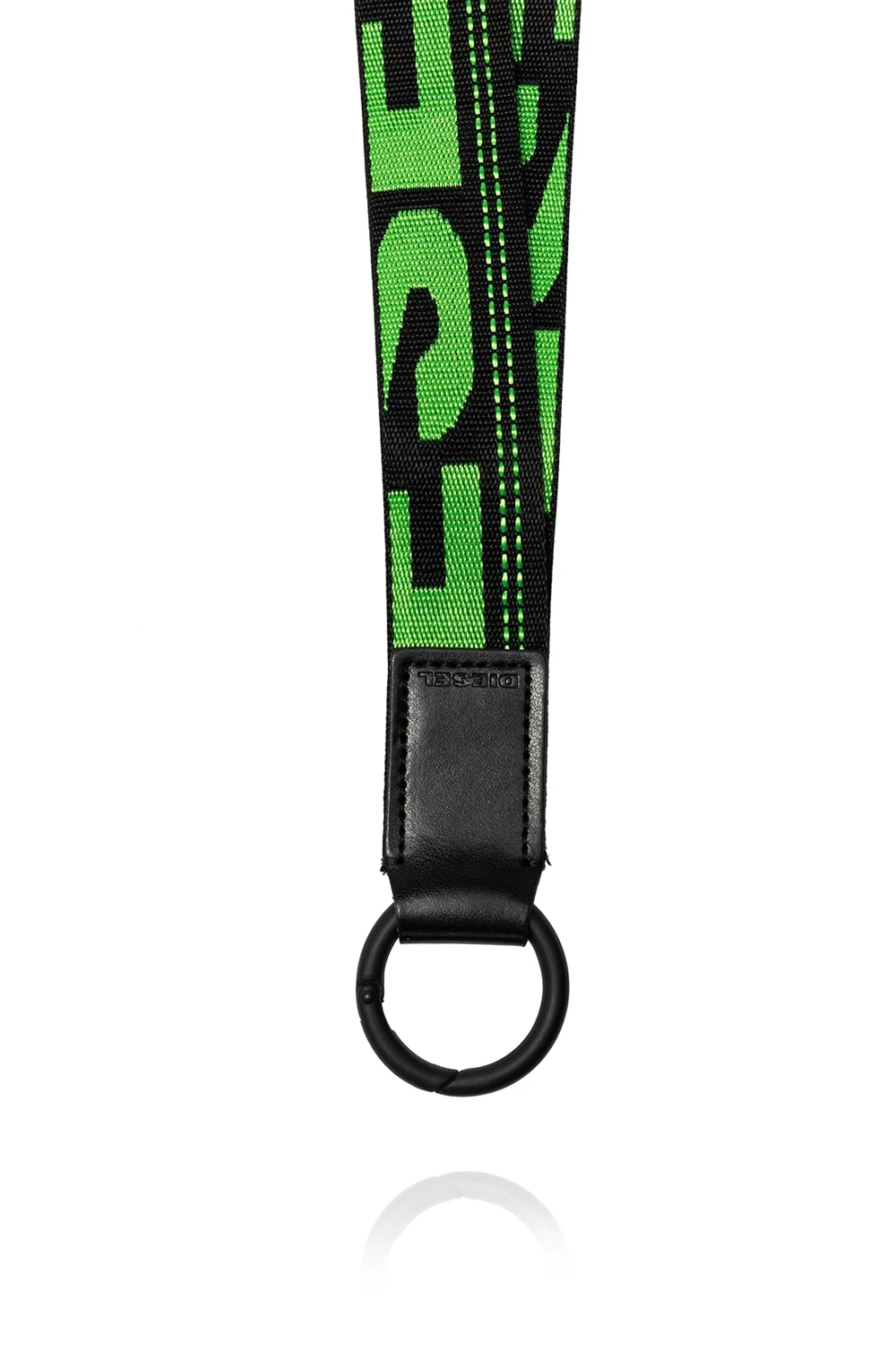 Black lanyard from Diesel featuring a green logo embroidery and round snap hook.