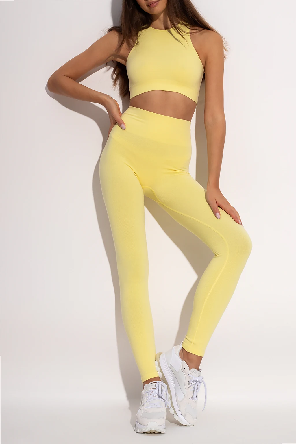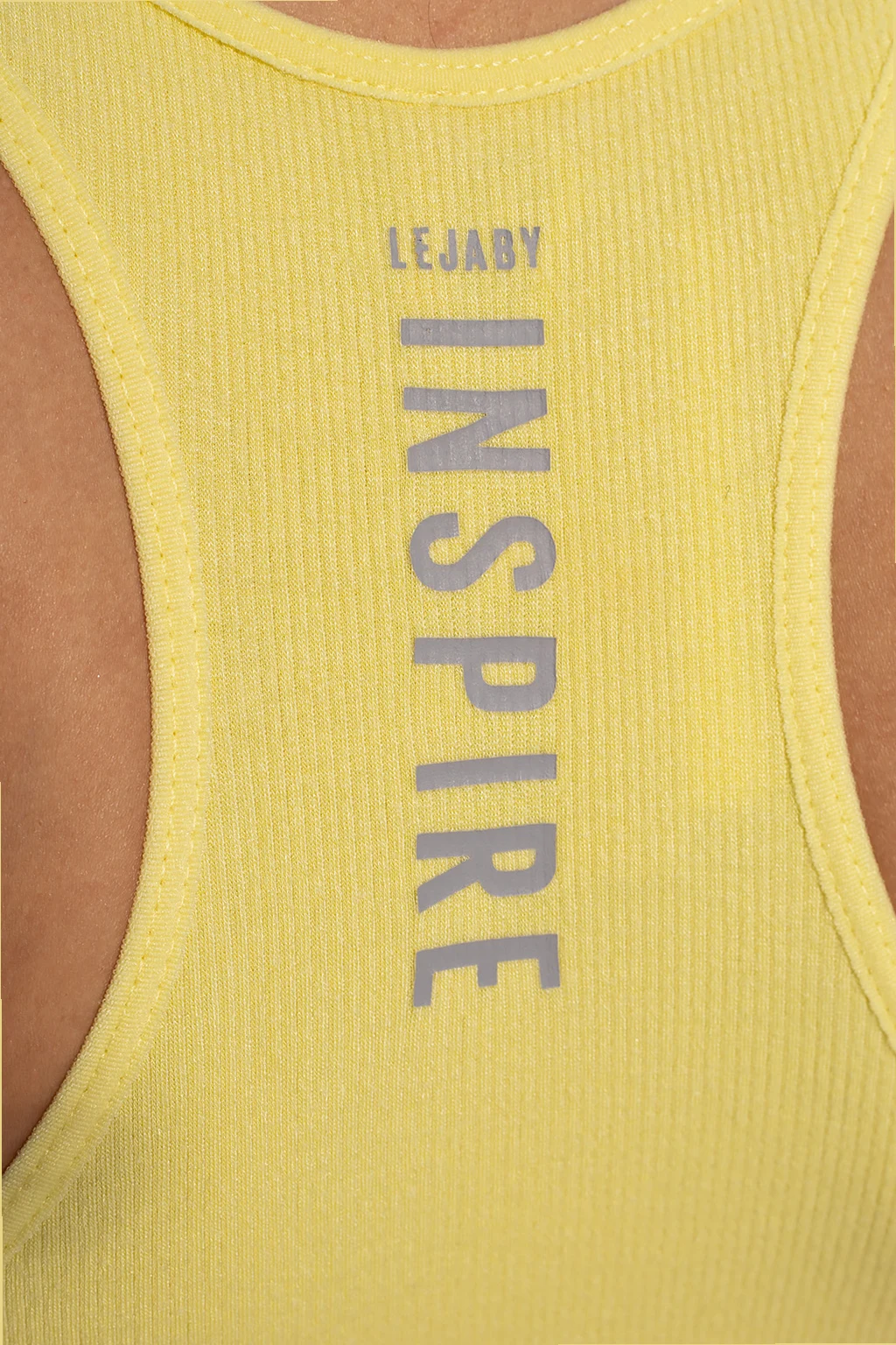 Yellow sleeveless sports top from Maison Lejaby. Crafted from a ribbed knit, this style features an elastic hem and a grey graphic print with the brand\'s logo on the back.