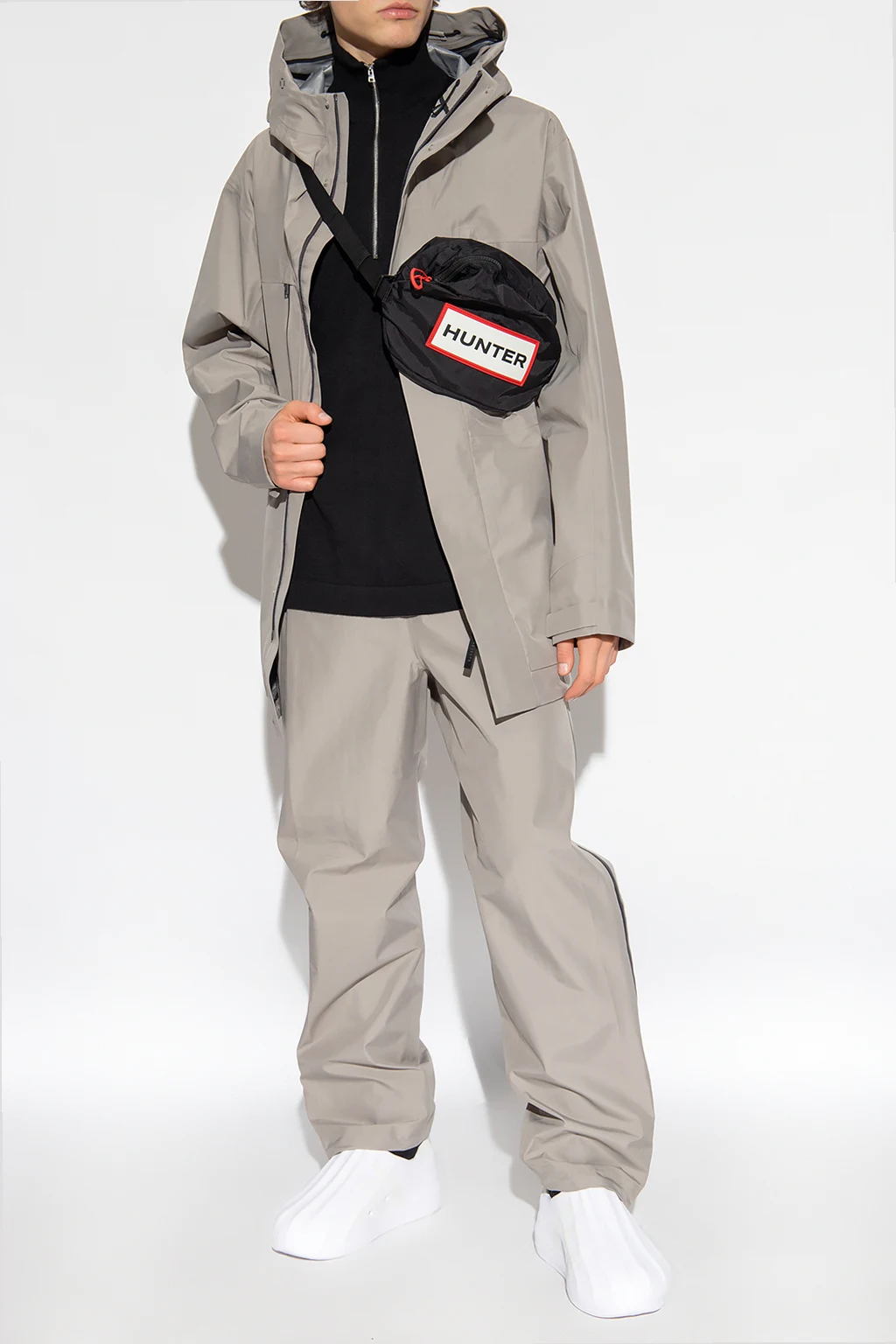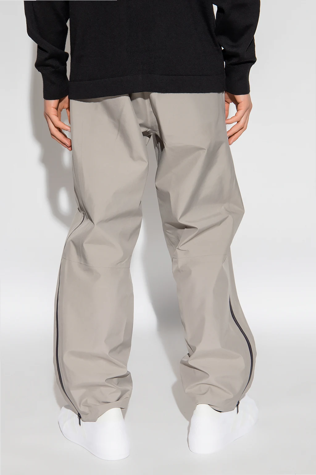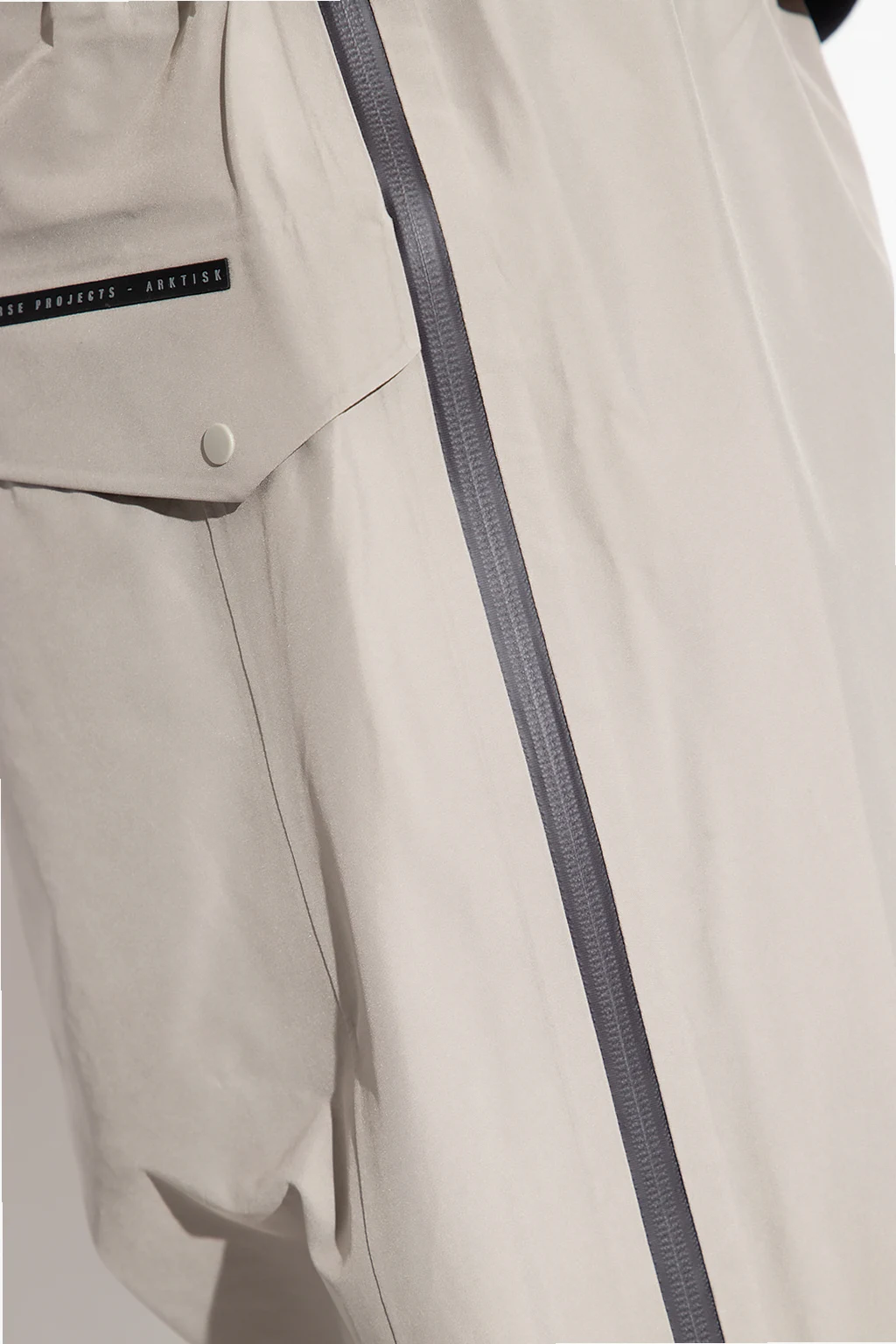 Grey trousers from Norse Projects, the ‘ARKTISK’ collection. Made of recycled fabric with the Bluesign® and OEKO-TEX® certificates covered with the GORE-TEX® membrane, this garment features a drawstring waist, water-proof two-way zips on the sides, black logo, back pocket with a flap pocket with snaps and zip as well as drawstrings at the legs.
