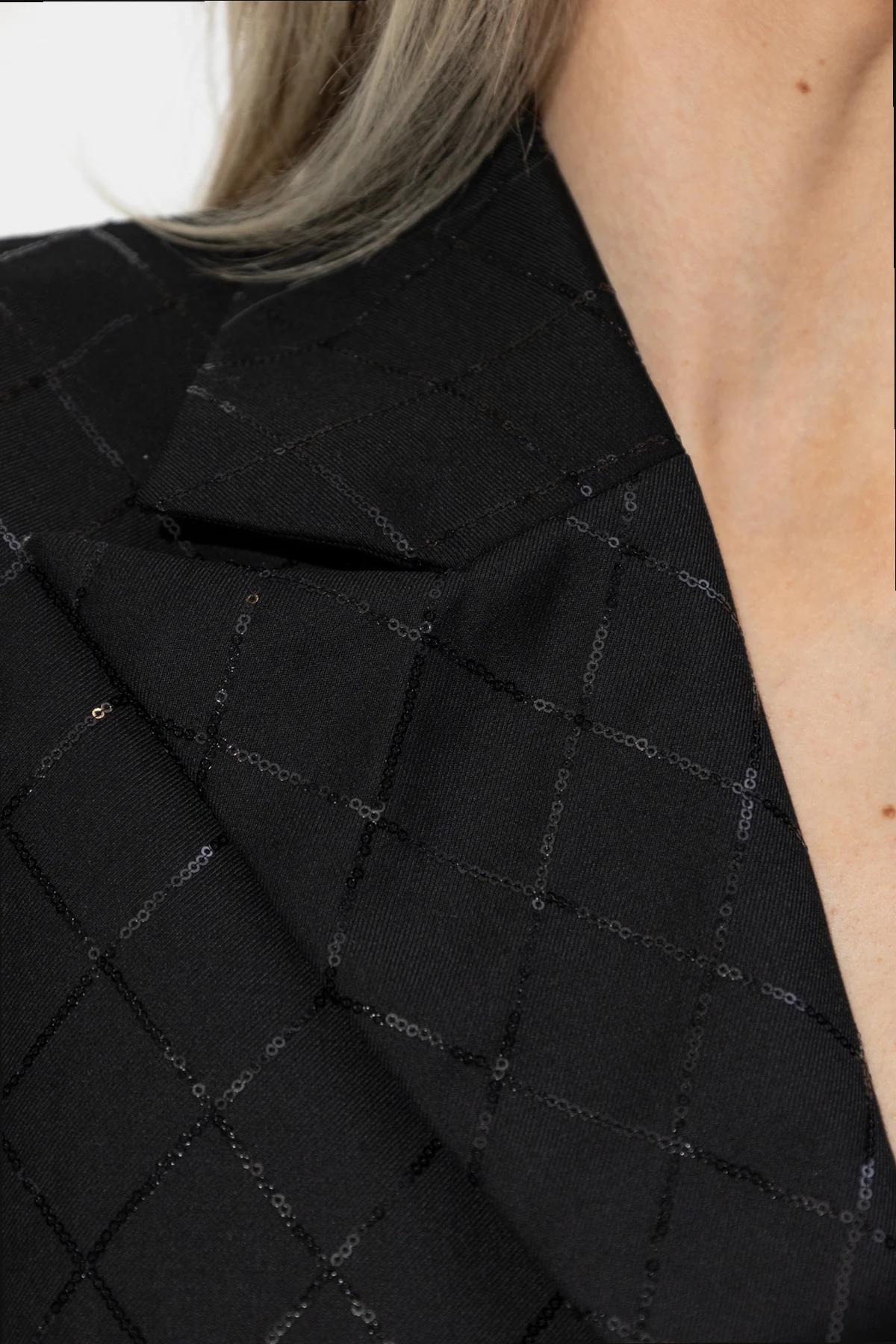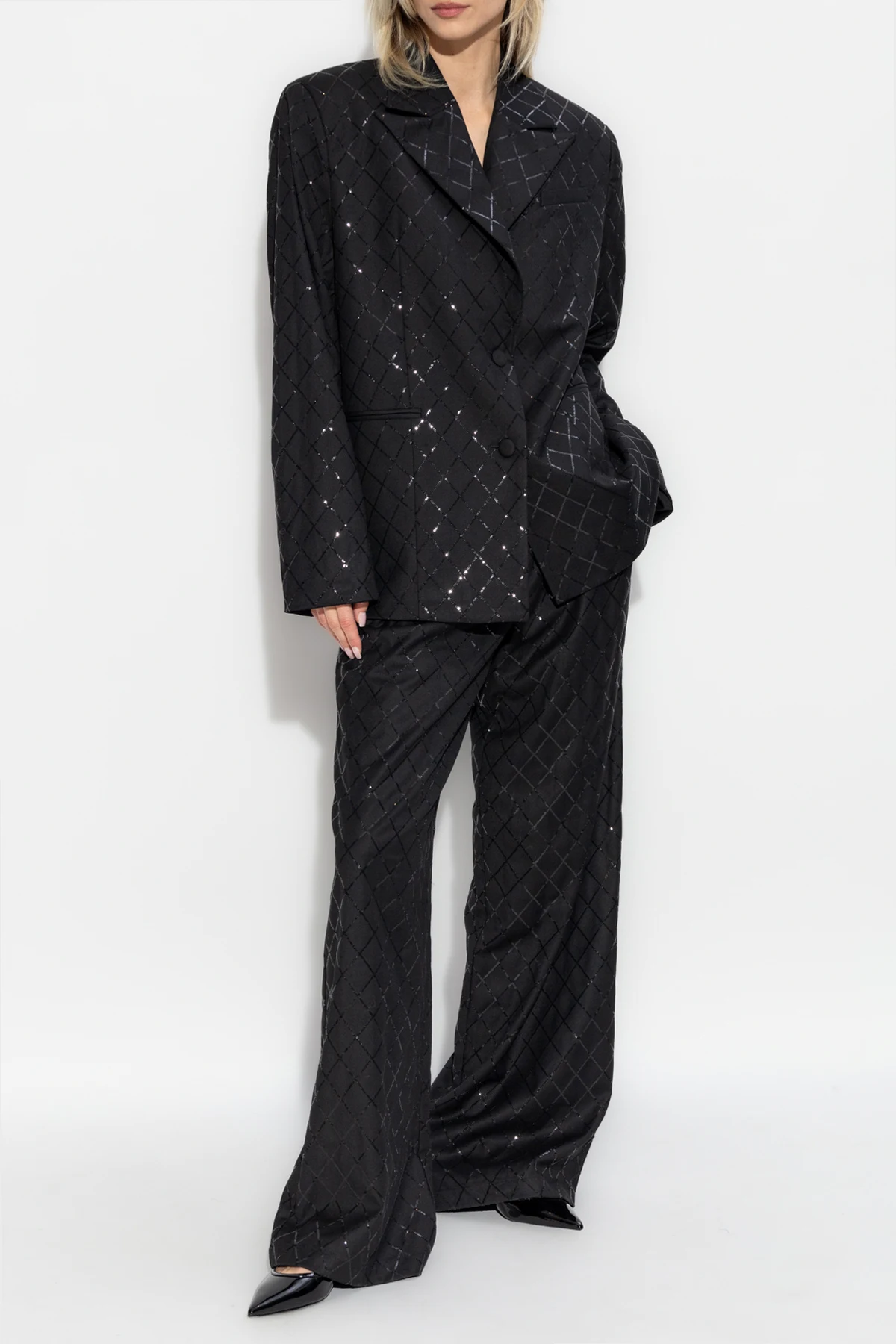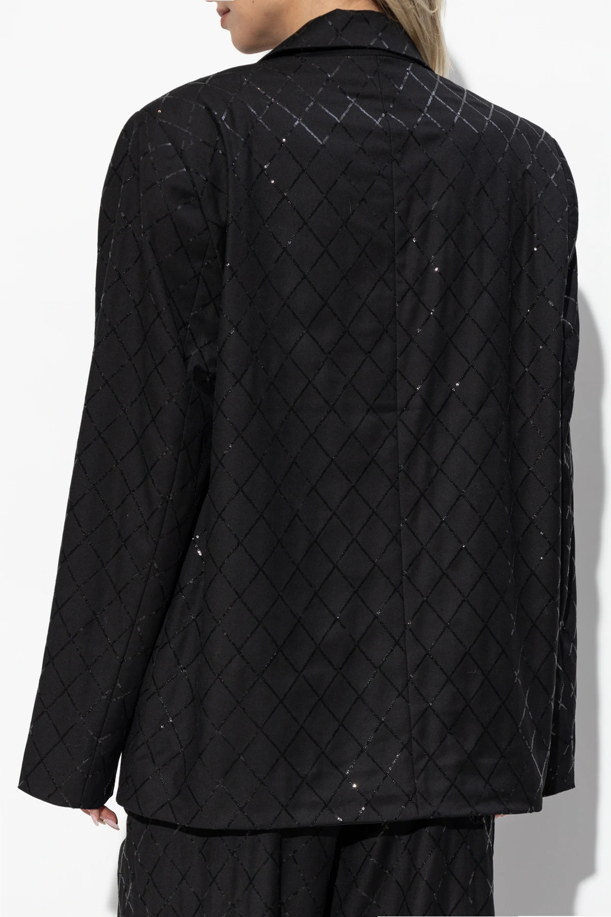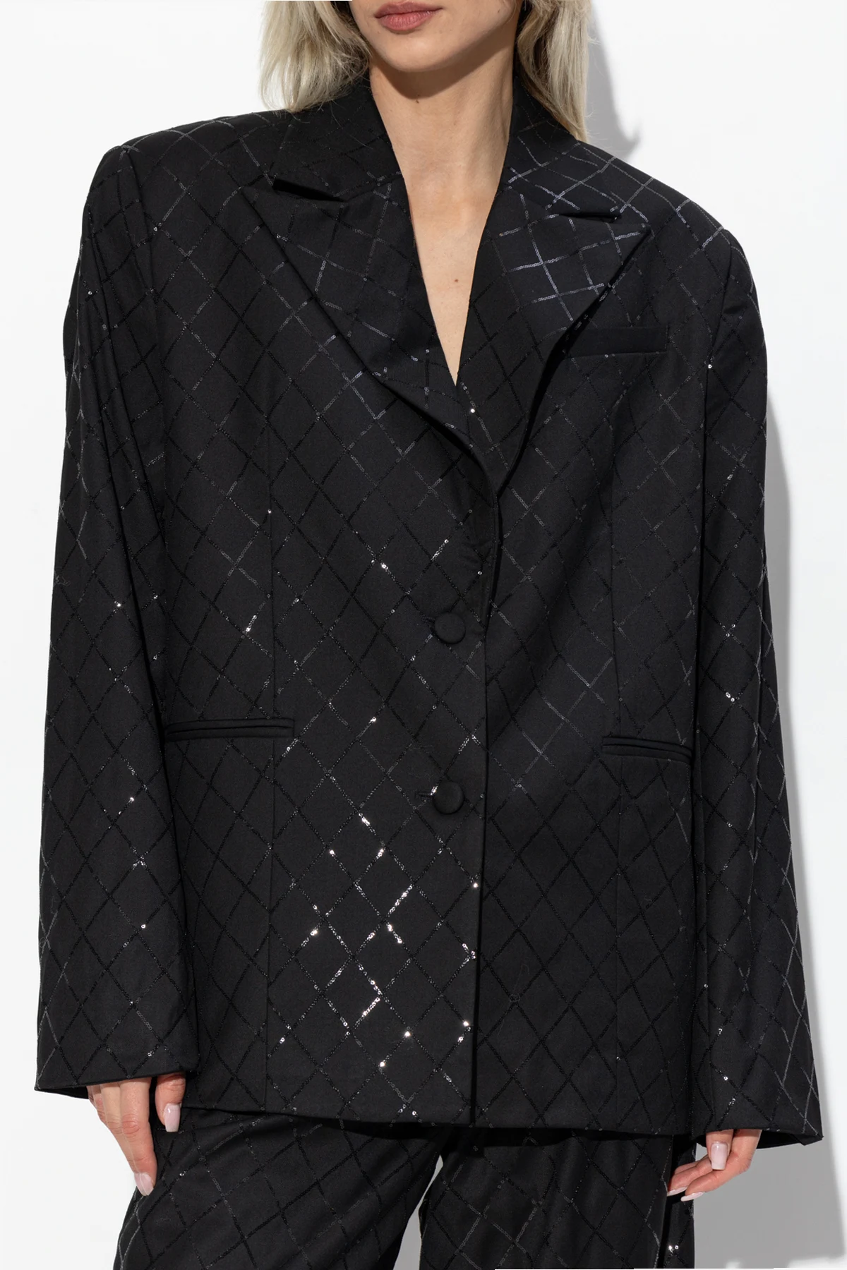 Presenting the Shimmering Sequin Blazer, a masterpiece from the esteemed Copenhagen brand, ROTATE. This exquisite black blazer is part of an exclusive fashion collection, adorned with shimmering sequins arranged in geometric diamond patterns, reminiscent of a lattice. The classic silhouette, complete with a collar and lapels, is enhanced by the elegance of sequins and two front pockets, making it perfect for special occasions. Crafted from a luxurious blend of polyester, viscose, wool, and elastane, the blazer promises both comfort and sophistication. The loose fit and button closure add to its timeless appeal, embodying ROTATE\'s ethos of combining playful aesthetics with the opulence of 80s influences. Whether for a party or an everyday statement, this blazer transforms your wardrobe into a realm of confident elegance. Why Choose This Product? Exquisite Design: Black with shimmering geometric patterns. Versatile Style: Classic fit with collar and lapels. Luxurious Materials: Blend of polyester, viscose, wool, and elastane. Effortlessly Elegant: Perfect for any special occasion. Renowned Designer: Crafted by ROTATE, a leader in fashion innovation.