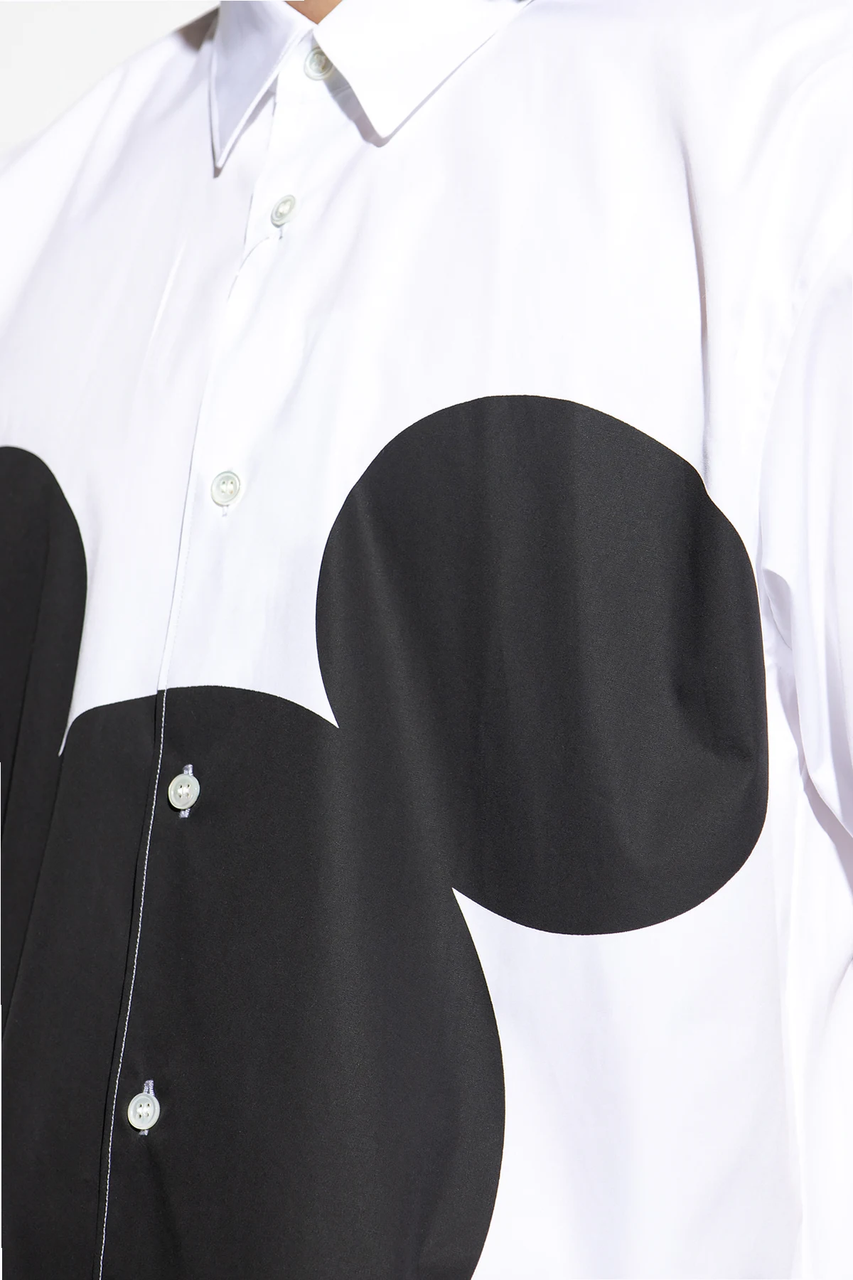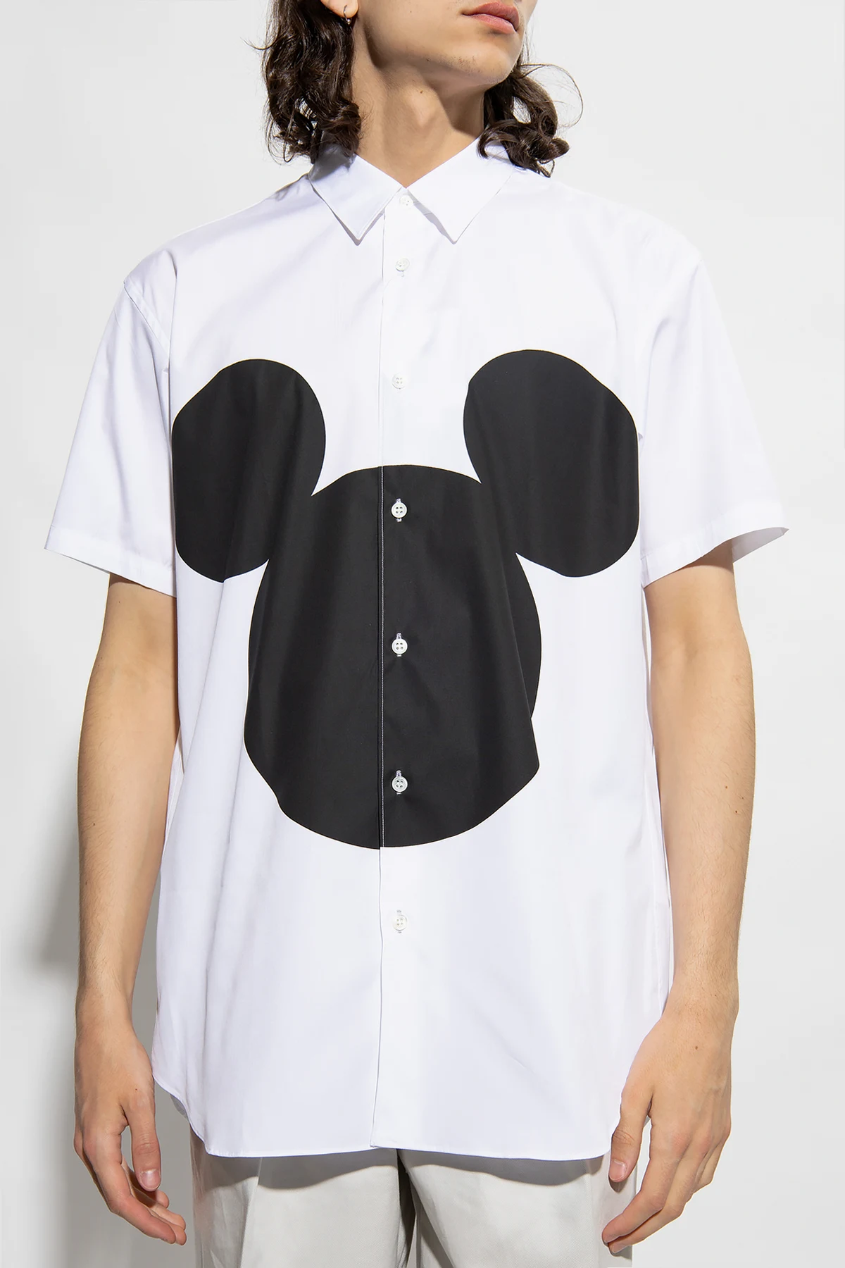 White shirt from Comme des Garcons Shirt x Disney. Made of cotton, this short sleeve design is decorated with a cartoon character print.